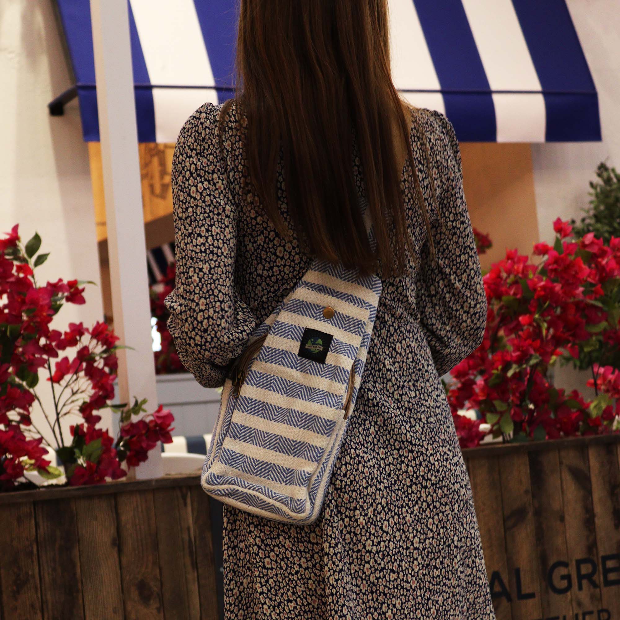 Táto všestranná crossbody taška vyrobená z prírodnej bavlny v nadčasovej modrej a bielej farbe kombinuje ekologické materiály s nenáročným štýlom.