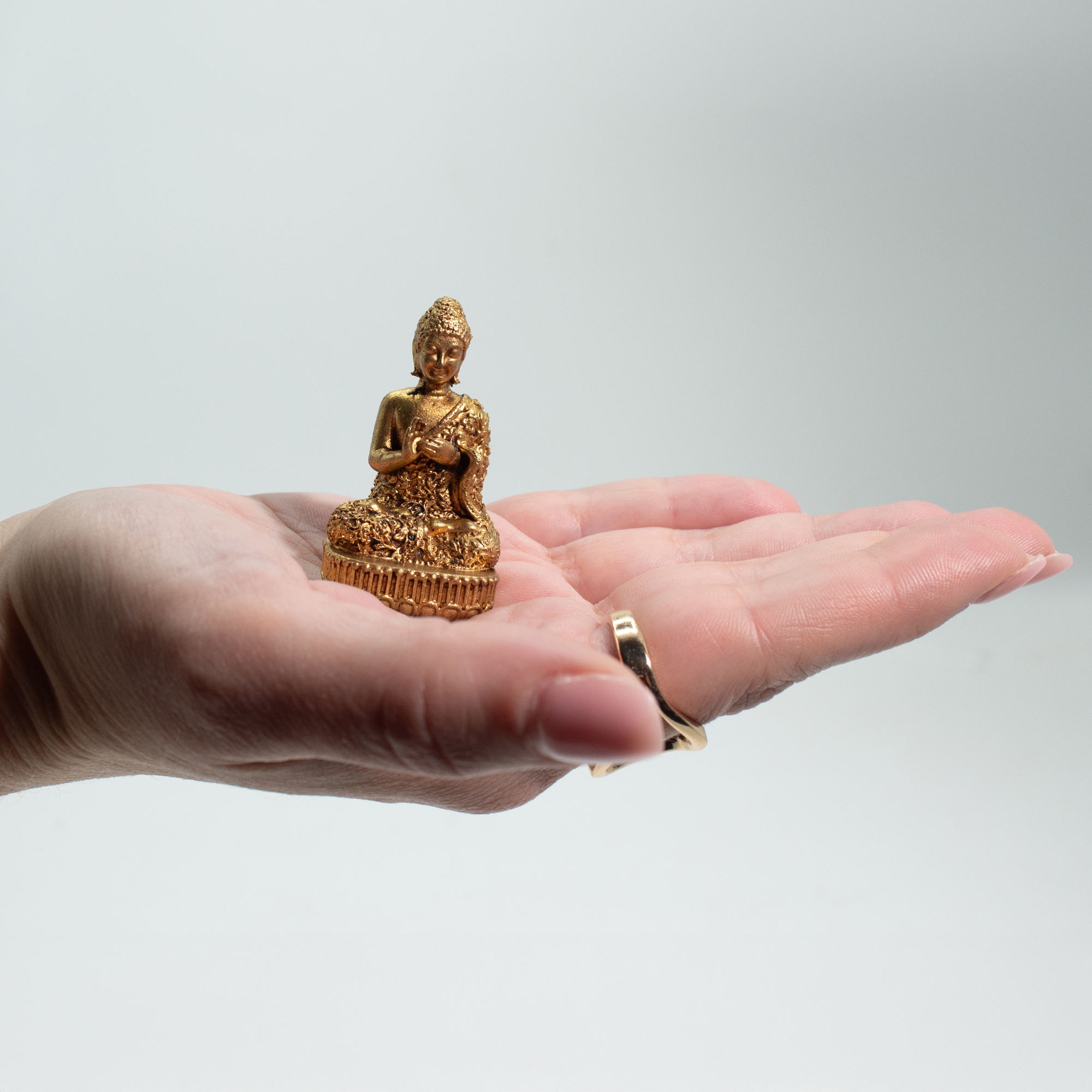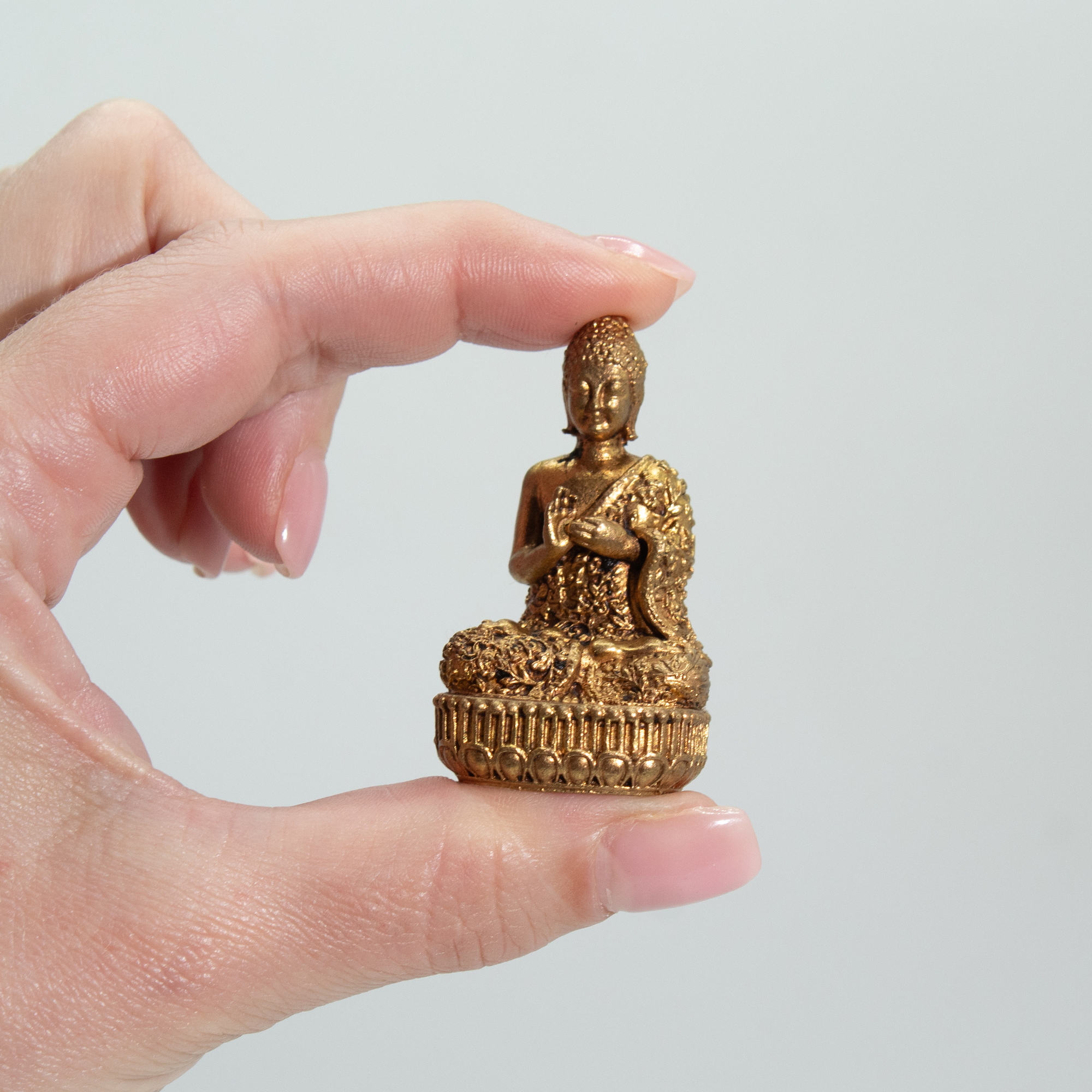 Mosadzná miniatúra božstva – Budha je precízne spracovaná figúrka z masívnej mosadze, ktorá spája tradičné detaily s kompaktným a univerzálnym rozmerom. S výškou 48 mm a hmotnosťou 60 g pôsobí pevne a kvalitne, pričom sa ideálne hodí na menšie poličky, pracovné stoly, oltárne priestory či meditačné kútiky.