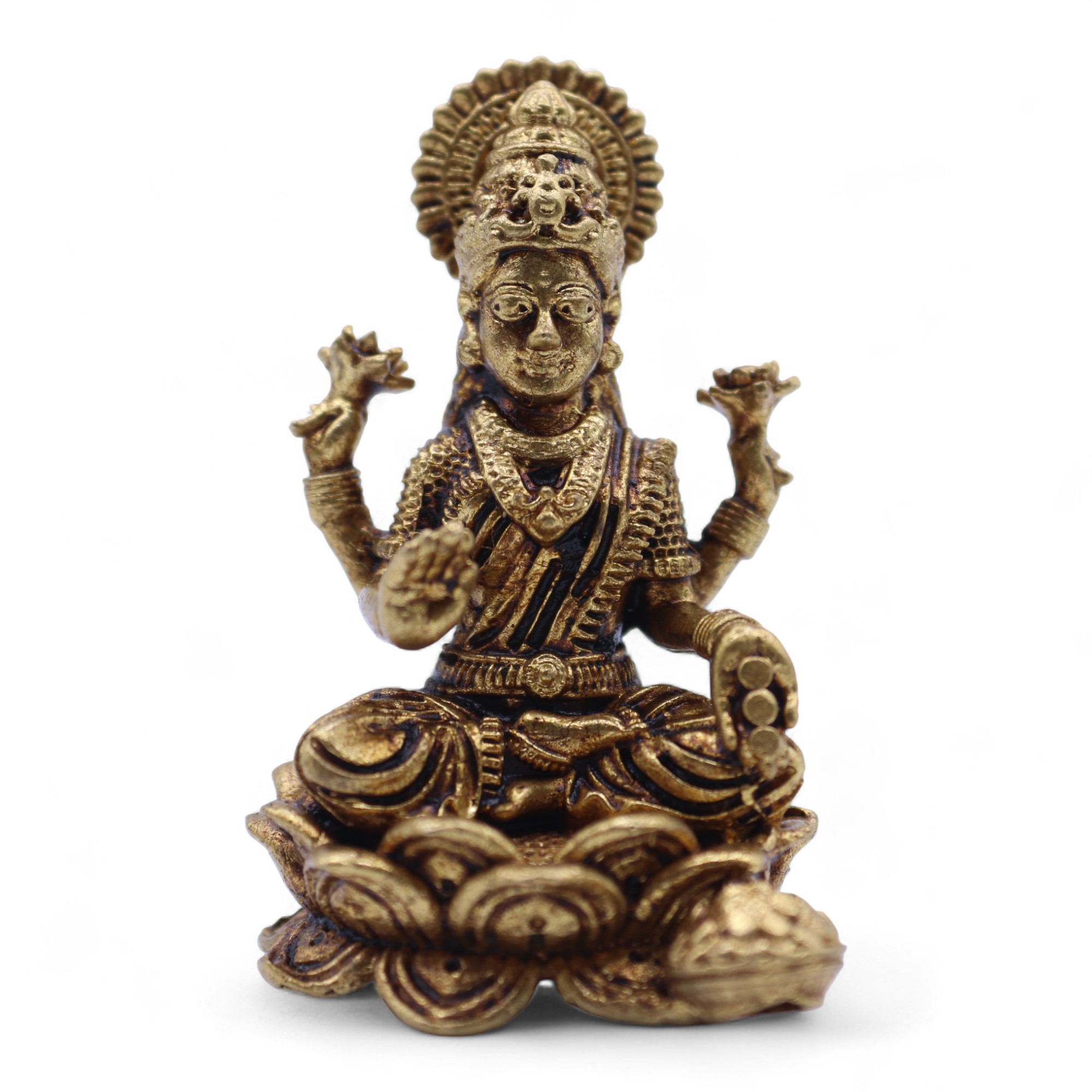 Táto nádherná mosadzná miniatúra bohyne Laxmi zachytáva božskú energiu prosperity, hojnosti a priaznivosti. Vďaka mierne väčším rozmerom (37 mm, 22 g) vyniká ešte jemnejšími detailmi, ktoré z nej robia dokonalý doplnok domáceho oltára, posvätného priestoru či zbierky duchovného umenia.
