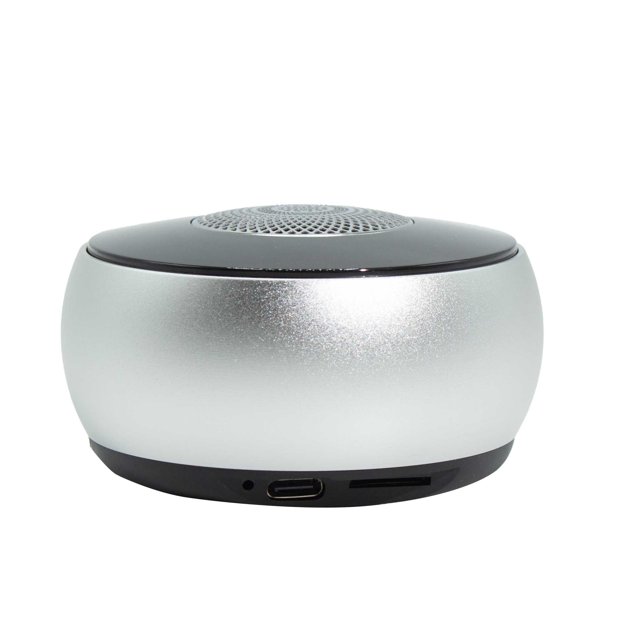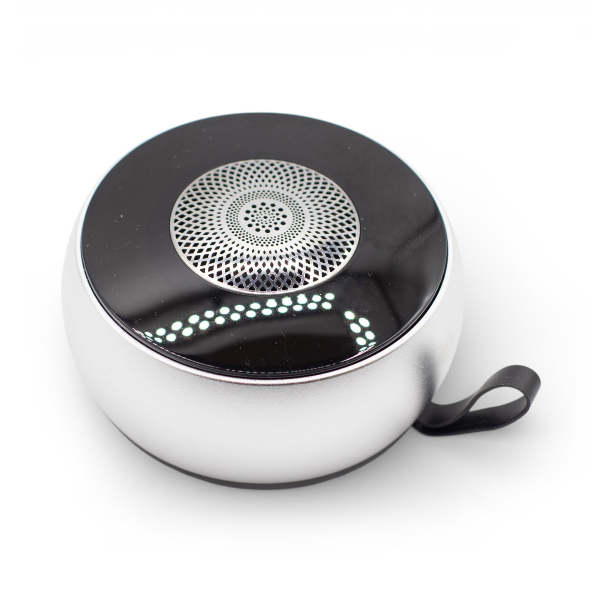 Strieborný mini reproduktor so svetelným mandala efektom spája kompaktný zvuk s elegantným, moderným vzhľadom, ktorý sa prirodzene hodí do súčasných bytových a lifestyle kolekcií.