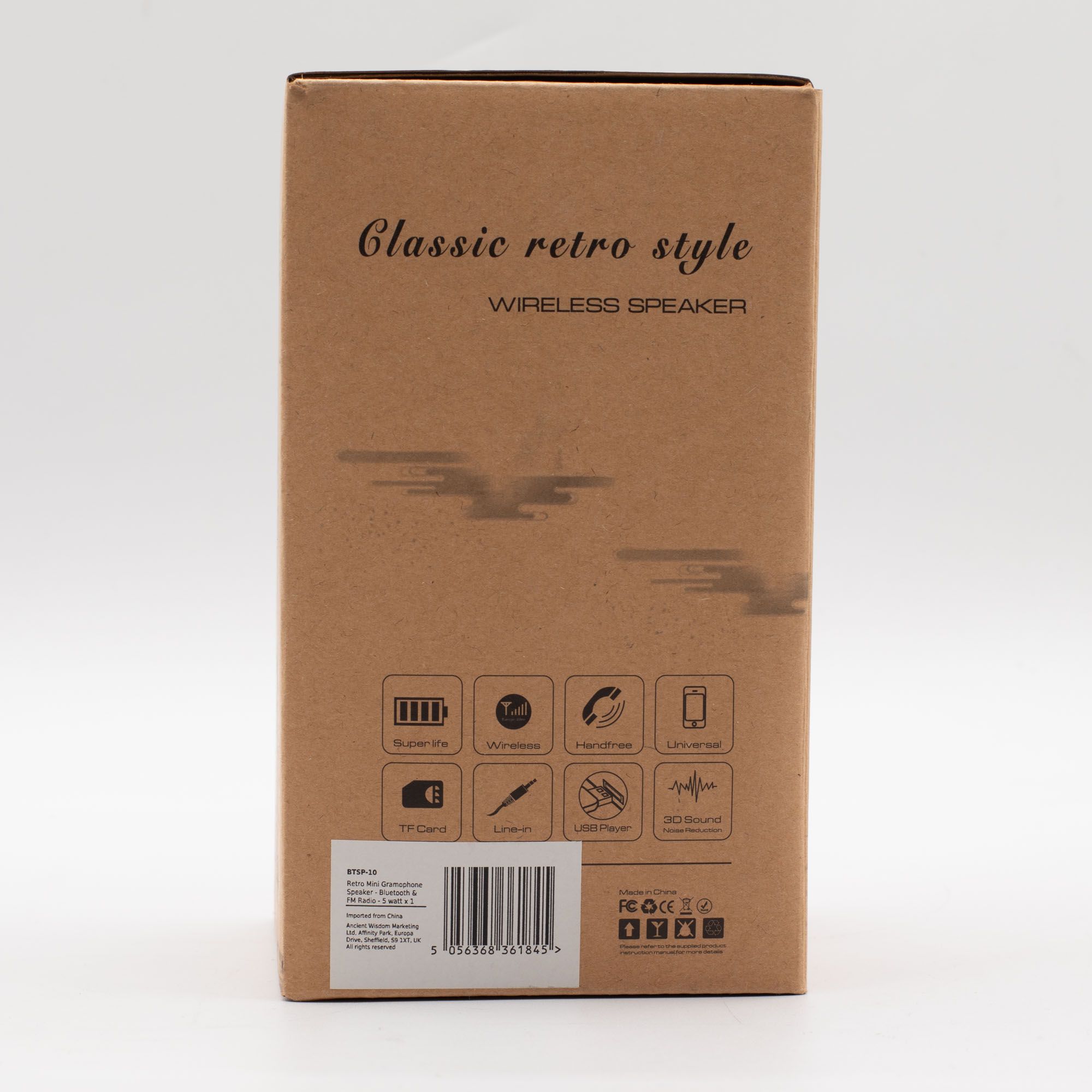 Kompaktný Bluetooth reproduktor v štýle gramofónu, navrhnutý tak, aby vniesol vintage atmosféru na pracovný stôl, poličku či nočný stolík. Dekoratívna trúbka a podstava s efektom dreva vytvárajú nostalgický prvok, pričom ponúkajú praktické každodenné ozvučenie v úspornom formáte.