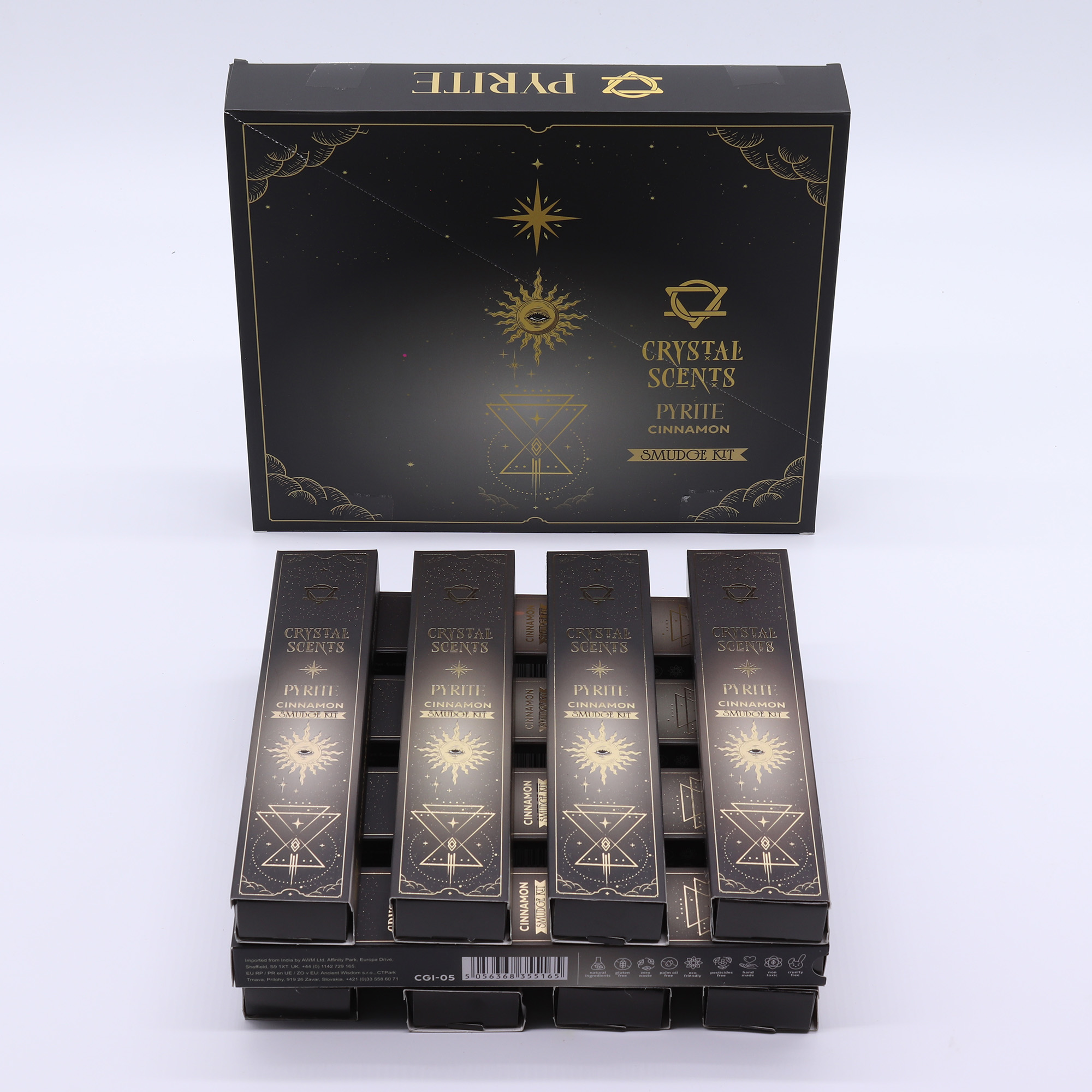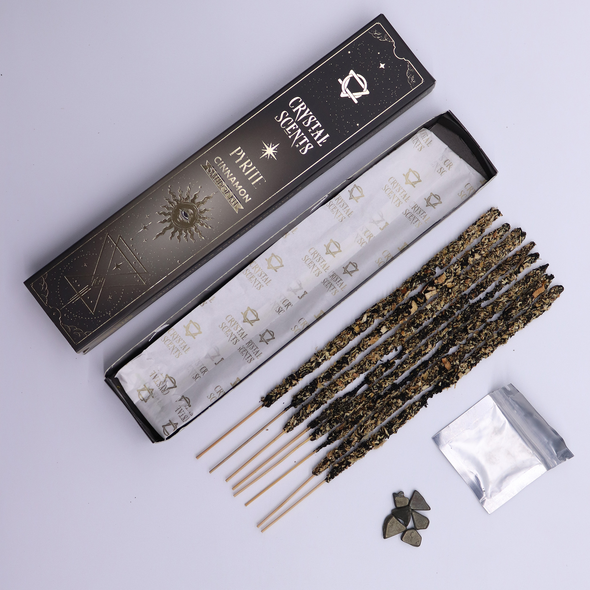 Každé balenie obsahuje 10 ručne vyrábaných vonných tyčiniek a pravý kryštál pyritu, vďaka čomu ide o výrazný produkt vhodný do rituálnych súprav, prezentácií zameraných na hojnosť alebo obchodov orientovaných na osobný rozvoj. Kombinácia vône a kryštálu podporuje každodenné nastavovanie zámerov a malé motivačné rituály.