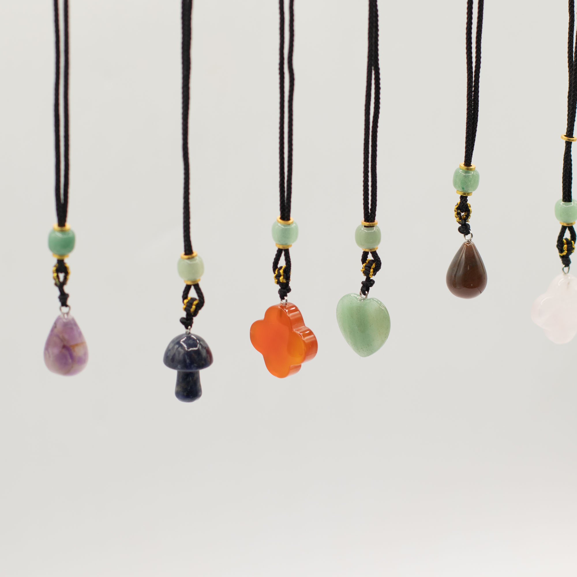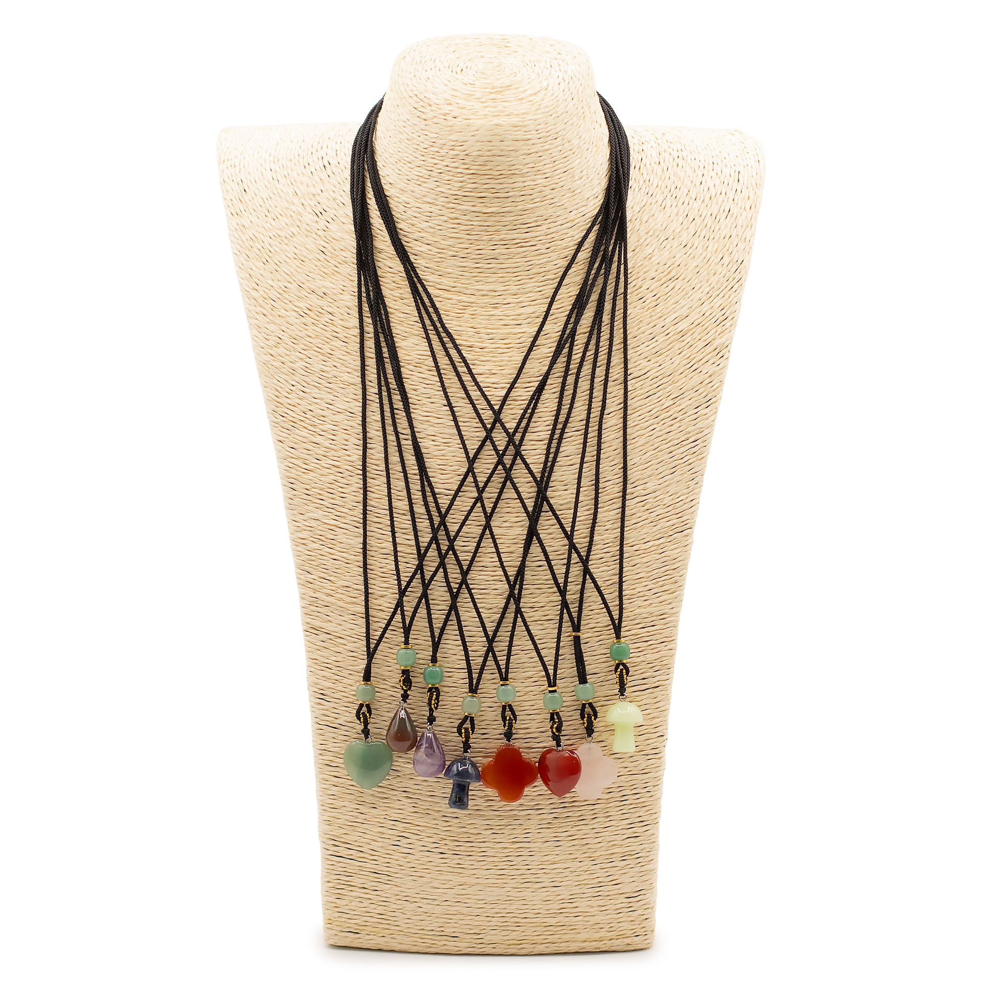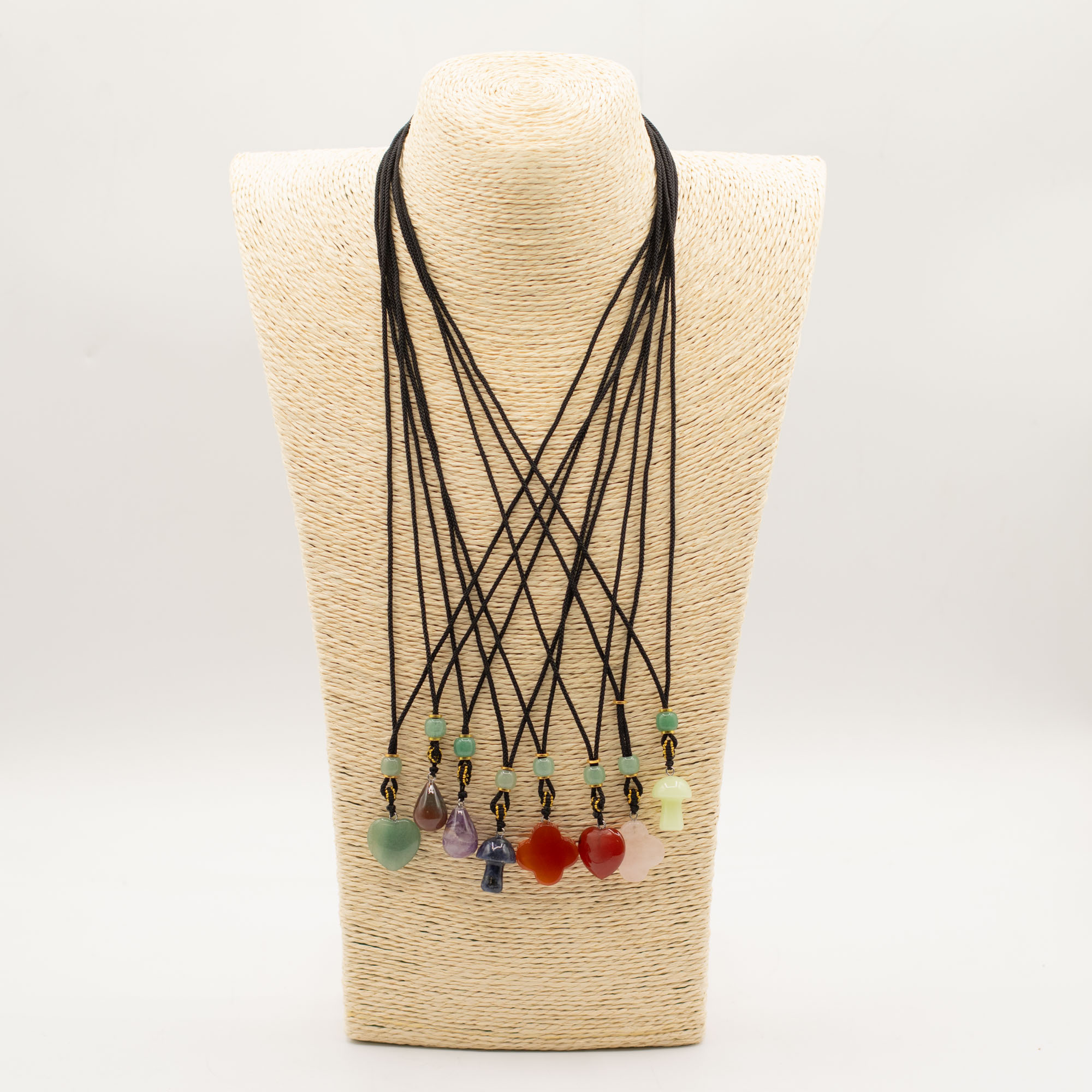 Každý prívesok je zavesený na nastaviteľnej šnúrke a doplnený dekoratívnymi korálkami, čím vzniká doplnok pripravený na okamžitý predaj s výraznou vizuálnou príťažlivosťou.