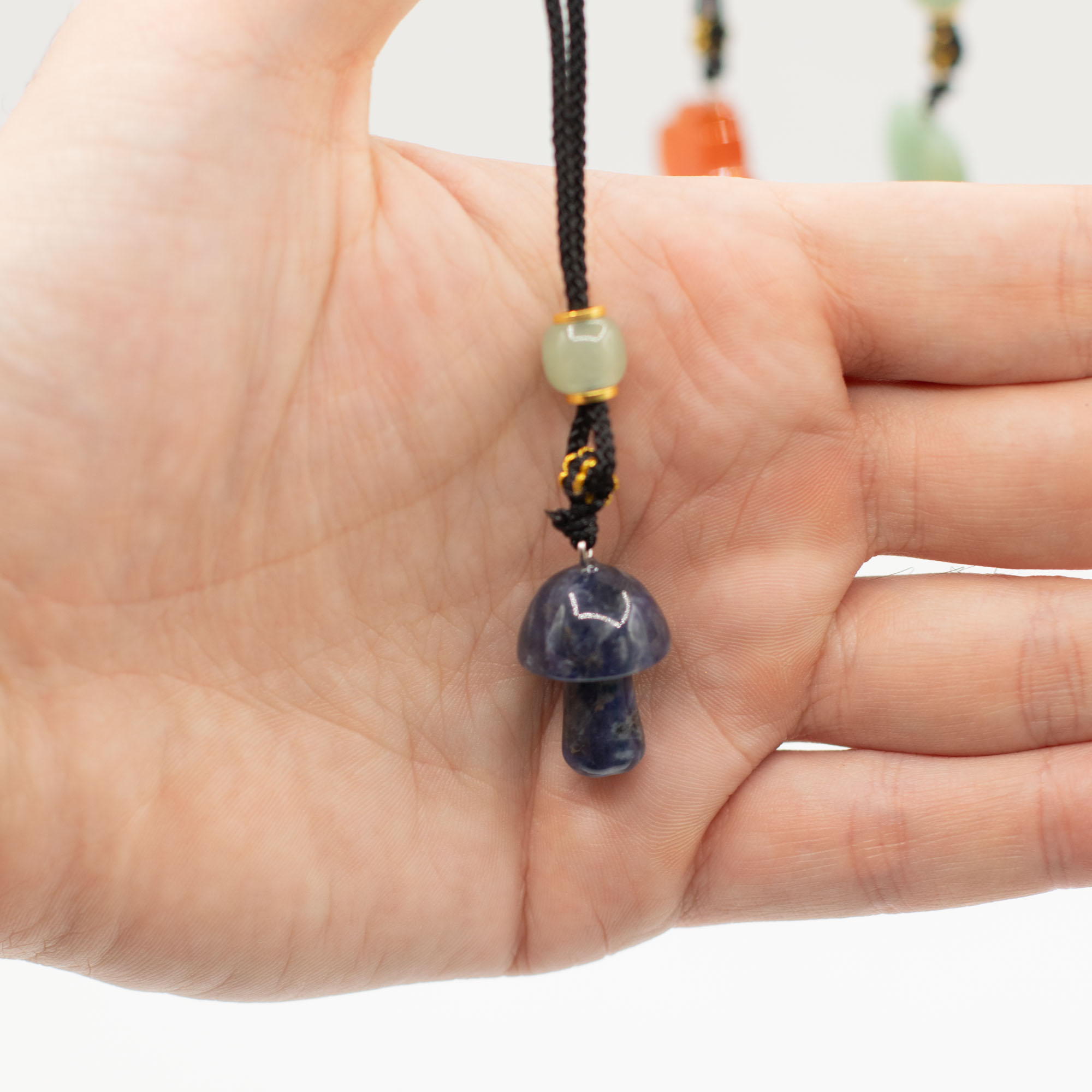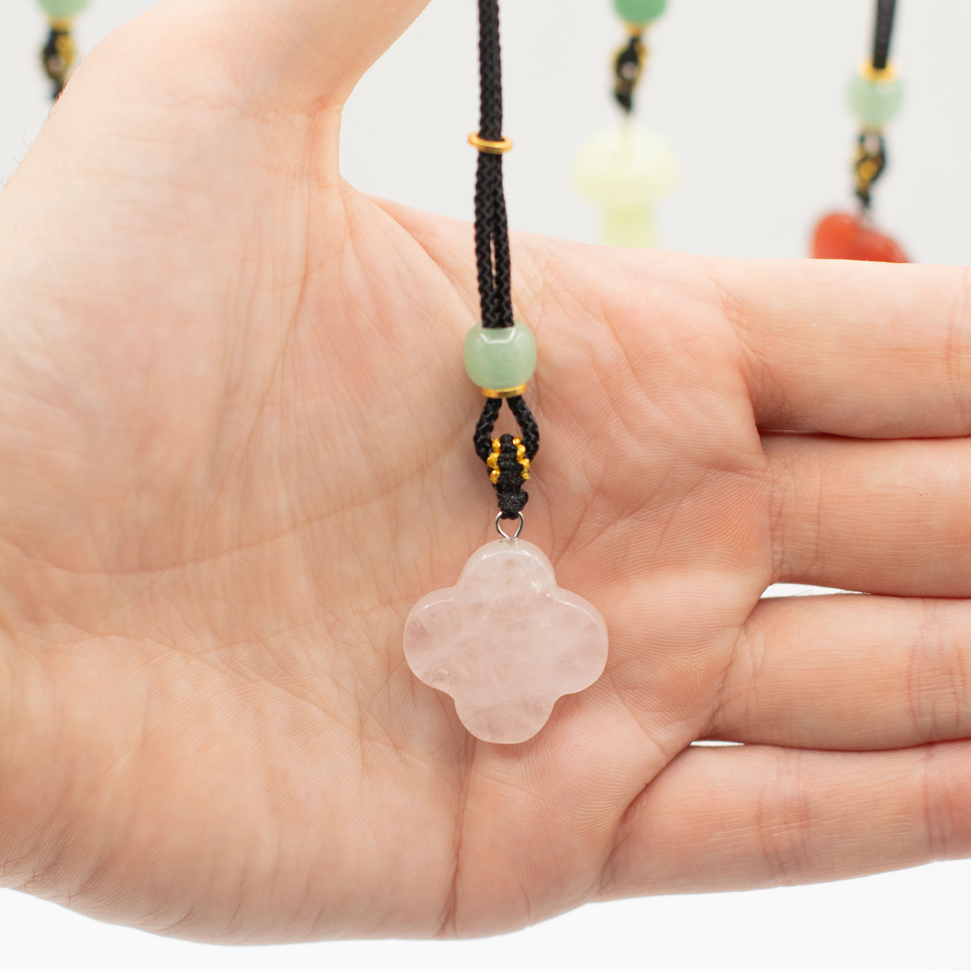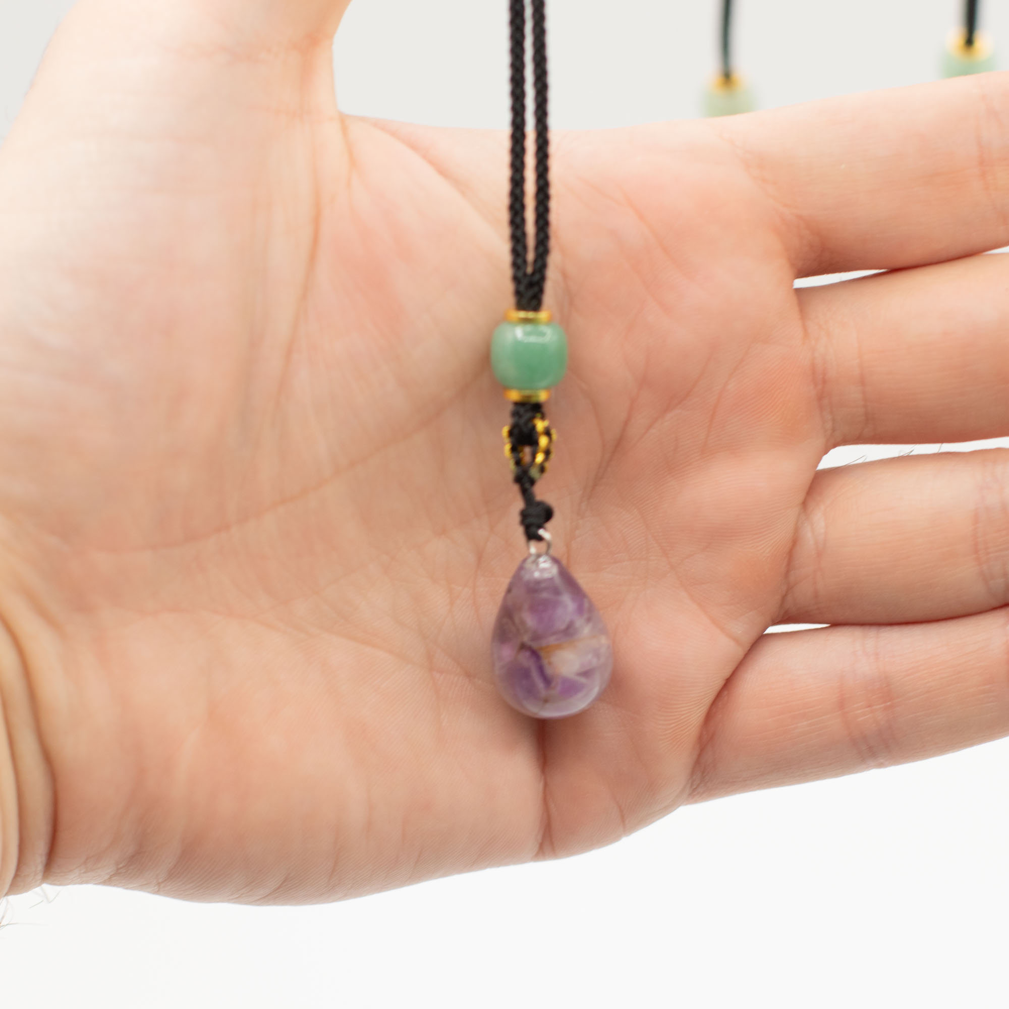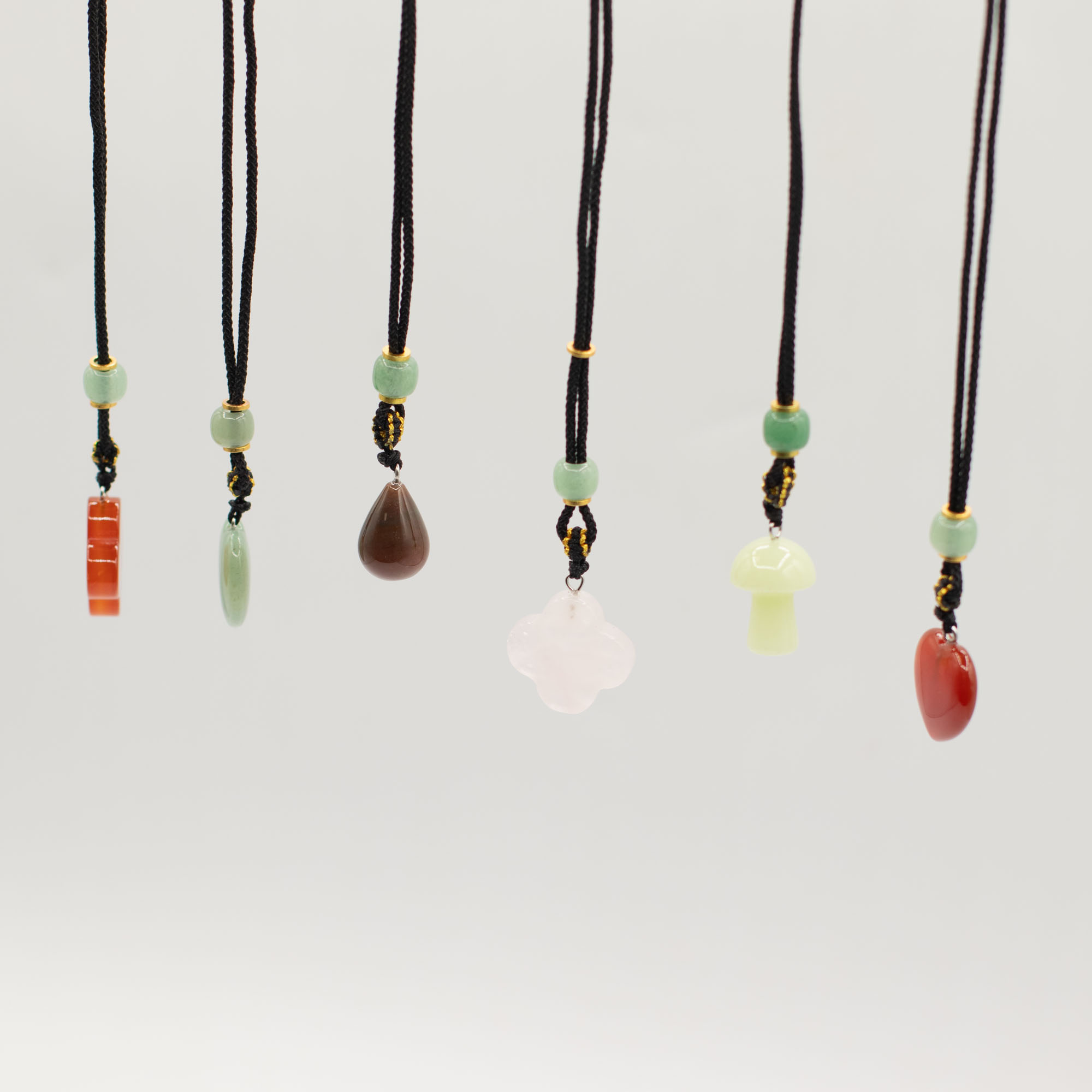Každý prívesok je zavesený na nastaviteľnej šnúrke a doplnený dekoratívnymi korálkami, čím vzniká doplnok pripravený na okamžitý predaj s výraznou vizuálnou príťažlivosťou.