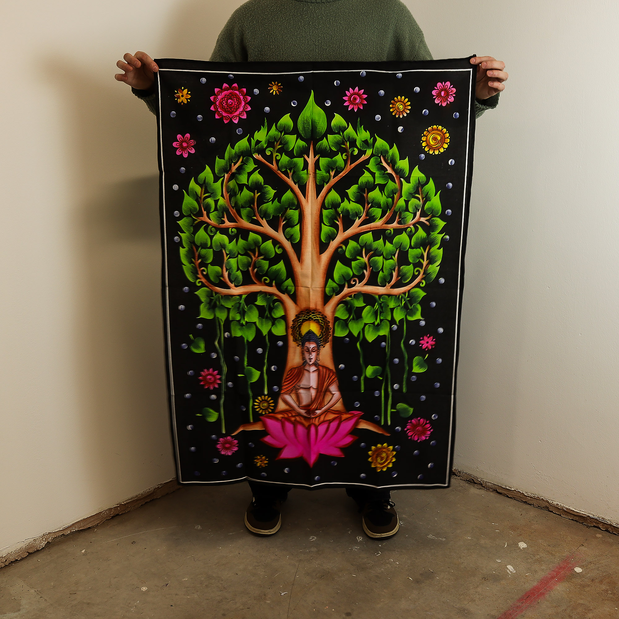 Tento upokojujúci indický nástenný prehoz zobrazuje Budhu meditujúceho pod stromom Bodhi – nadčasový symbol osvietenia a mieru.