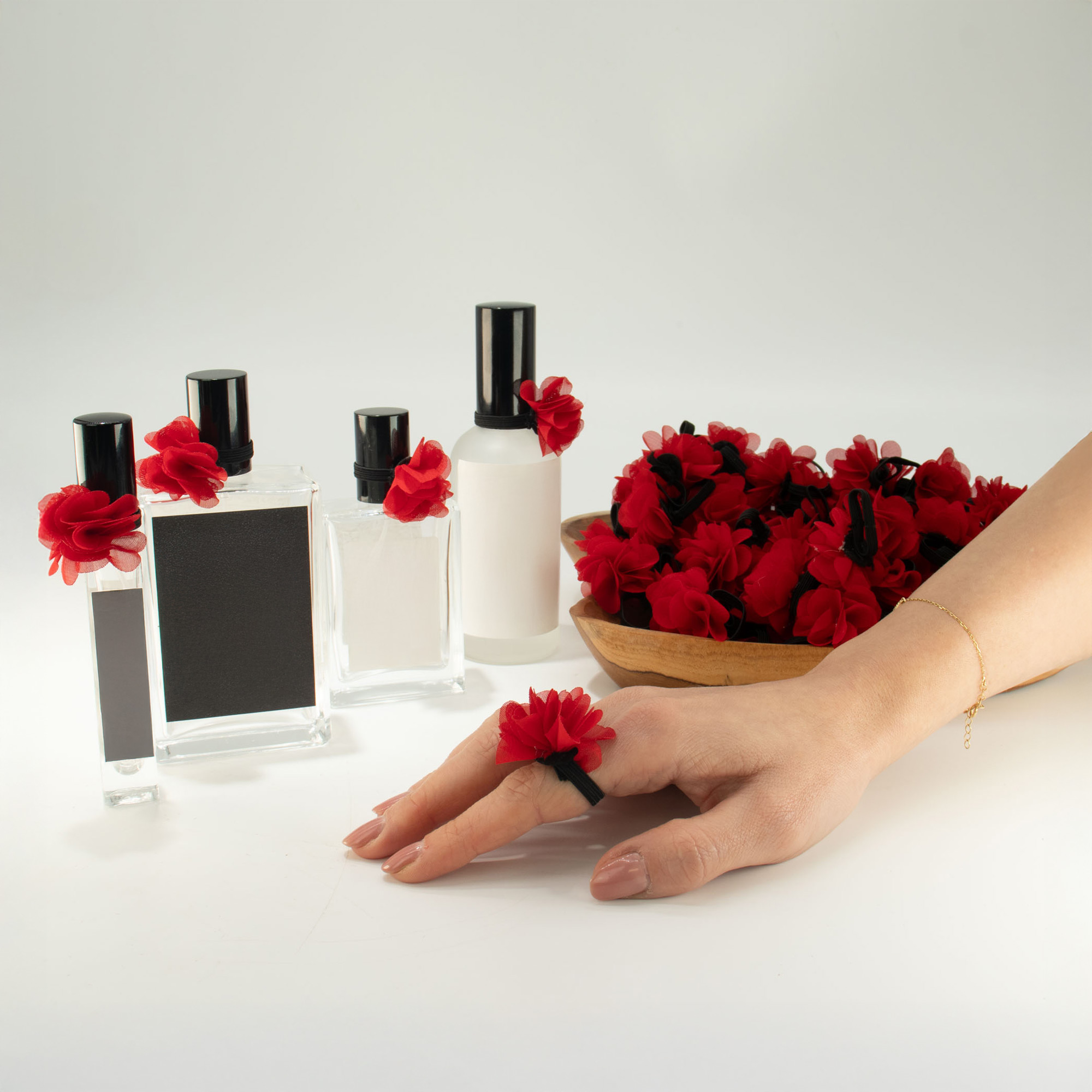 Predáva sa v balení po 100 kusoch. Šifónový vonný prsteň Ružovočervený je jemný textilný prsteň v tvare kvetu, navrhnutý na testovanie a prezentáciu vôní. Stačí pridať pár kvapiek vonného oleja a šifón jemne uvoľňuje arómu, čím funguje ako malý nositeľný difuzér, ktorý si zákazníci môžu okamžite vyskúšať.