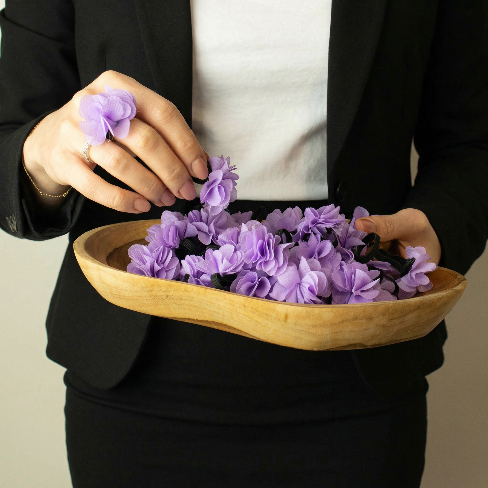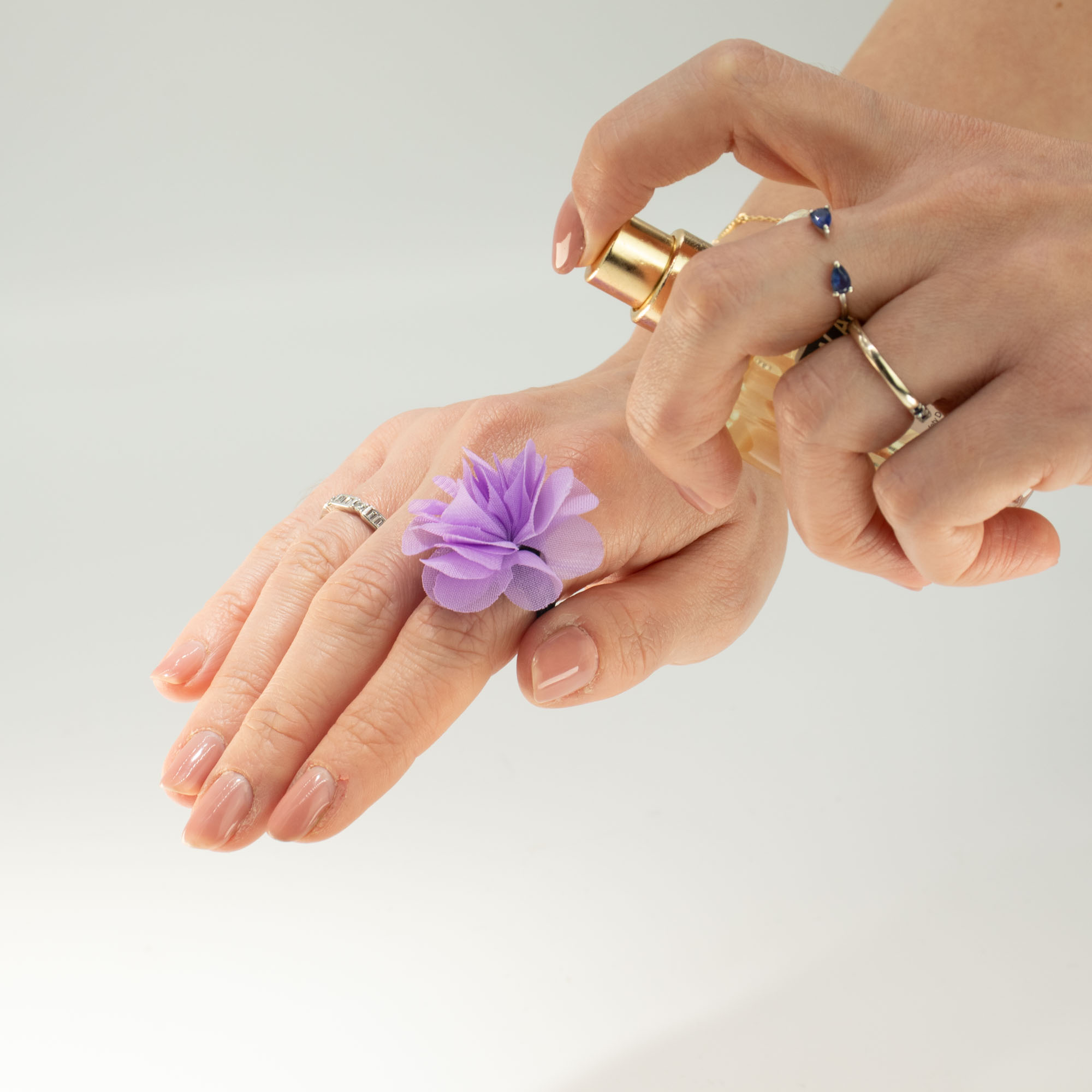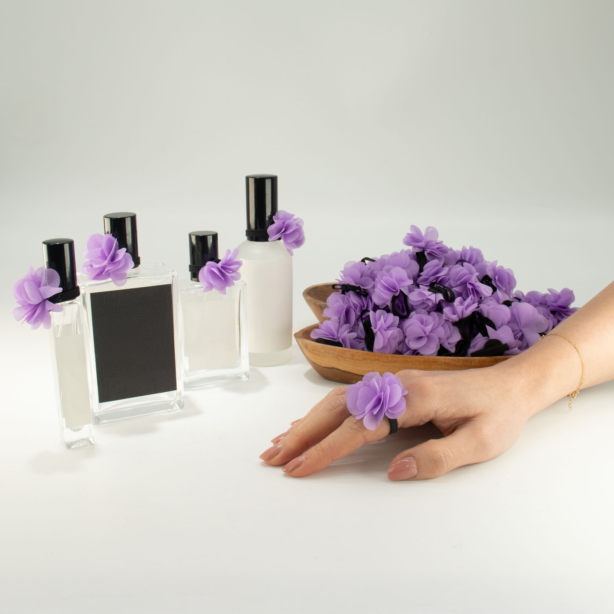 Ponúkané vo veľkoobchodnom balení po 100 kusoch, tieto levanduľové šifónové vonné prstene prinášajú do prezentácie vôní jemný a upokojujúci vzhľad. Každý decentný šifónový kvet je umiestnený na elastickom krúžku a môže byť napustený vonným olejom, pričom funguje ako nositeľný tester, ktorý postupne uvoľňuje vôňu.