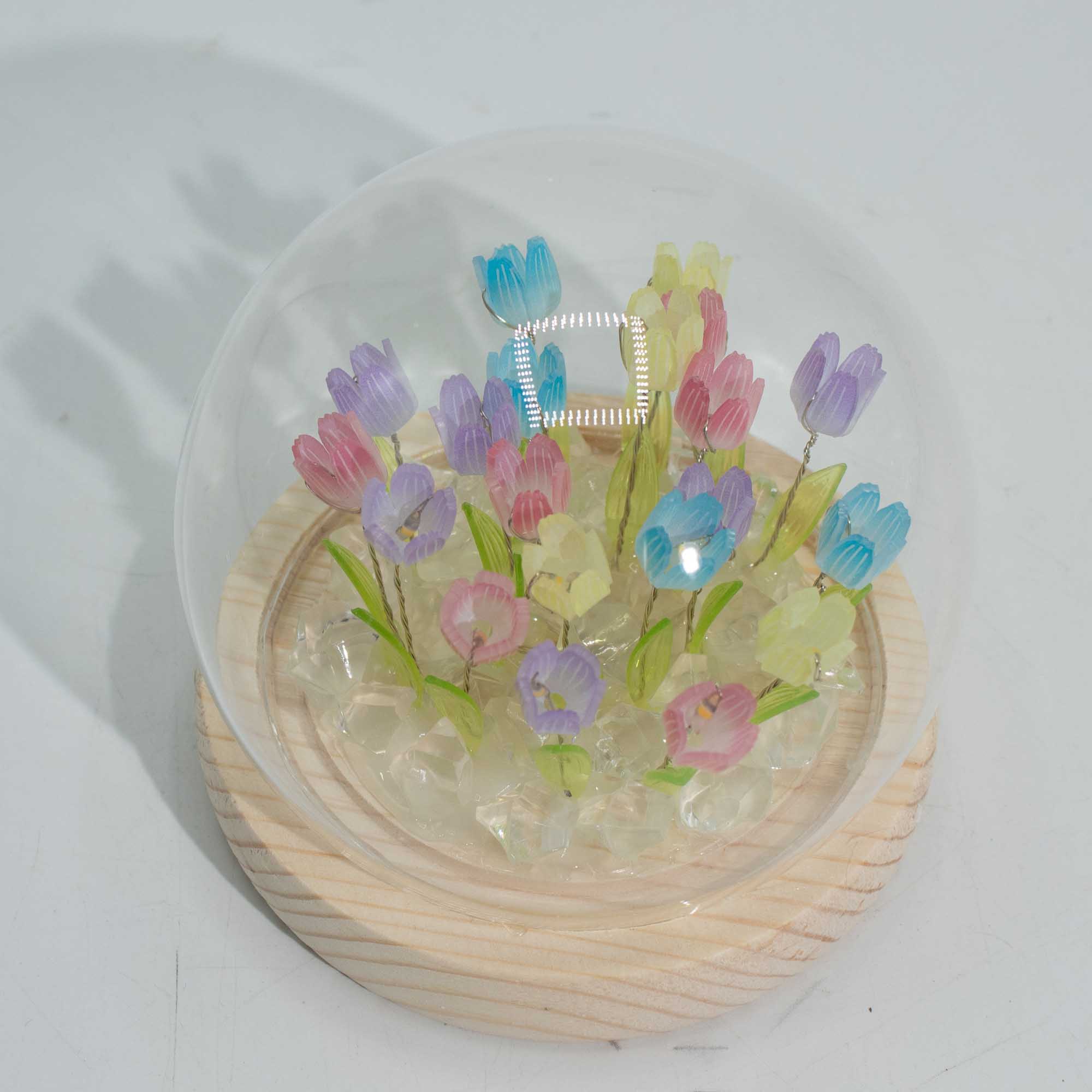 Kvetinová Žiariaca Záhradná Kupola – 20 farebných tulipánov dodáva osobitosť starostlivo zostaveným policiam a lifestylovým prezentáciám. Táto hravejšia interpretácia prináša farebnú variabilitu, pričom si zachováva pokojný a harmonický celkový dojem. Kombinácia jemne tónovaných tulipánov vytvára vizuálny záujem pod čírym skleneným poklopom, zatiaľ čo LED osvetlenie citlivo zvýrazňuje jednotlivé odtiene vyváženým spôsobom.