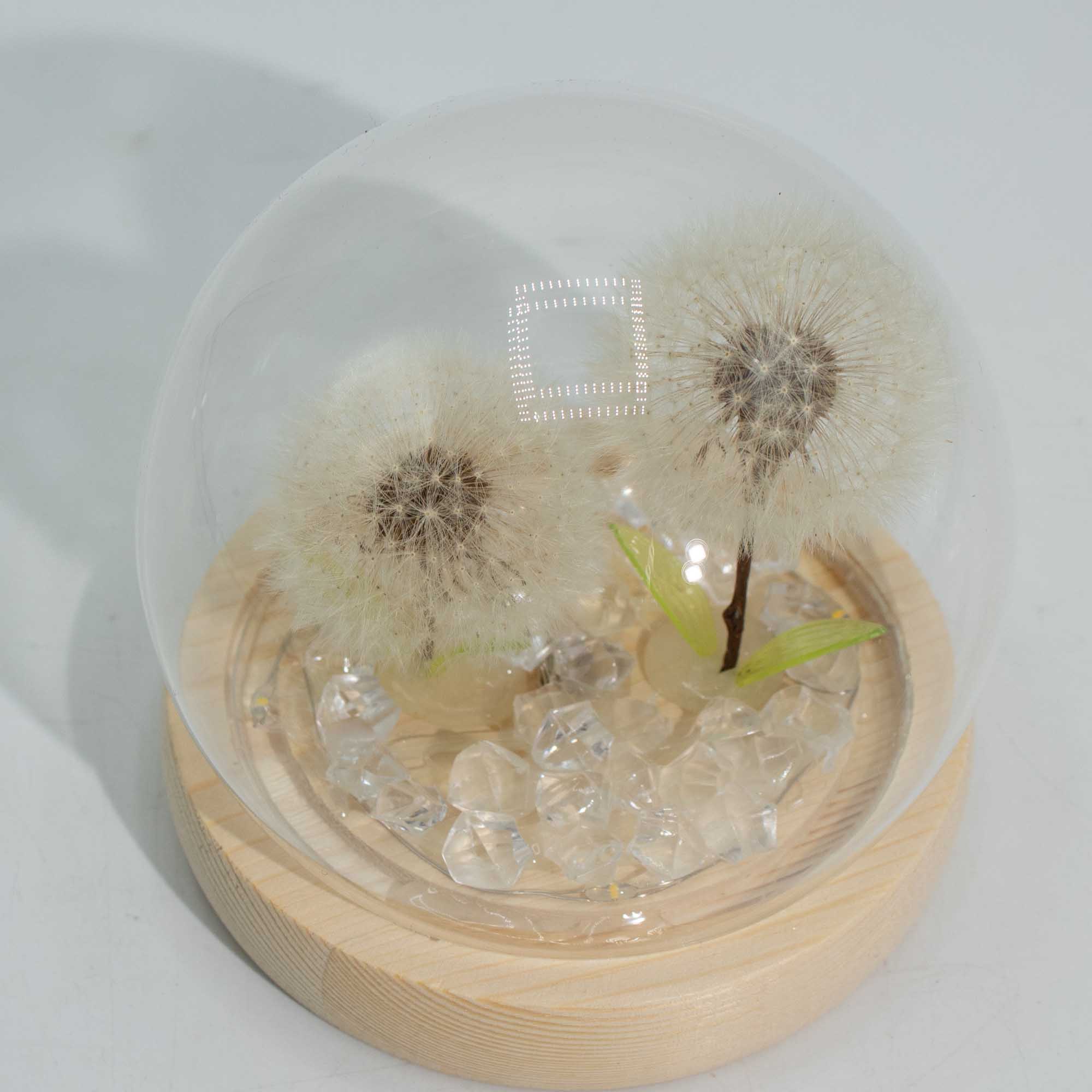 Kvetinová Žiariaca Záhradná Kupola – 2 púpavy predstavuje tichšiu, atmosférickejšiu variantu v rámci celej kolekcie. Dve jemné hlavičky púpav vytvárajú pod skleneným poklopom ľahký, vzdušný dojem, pričom mäkké LED osvetlenie dodáva hĺbku a jemnú hru tieňov.