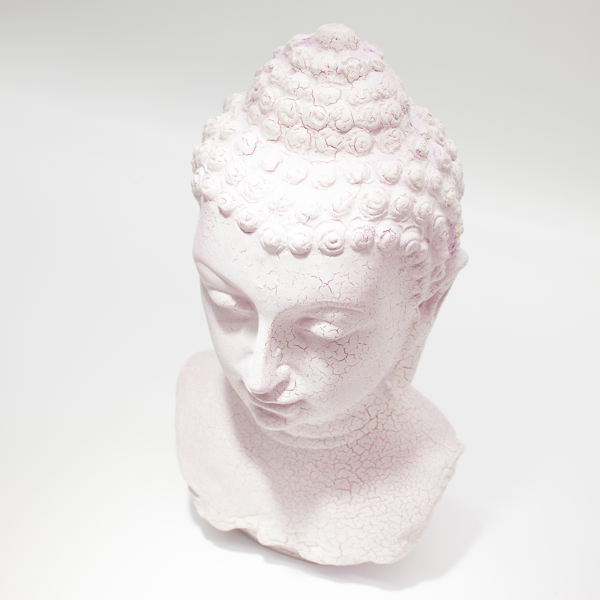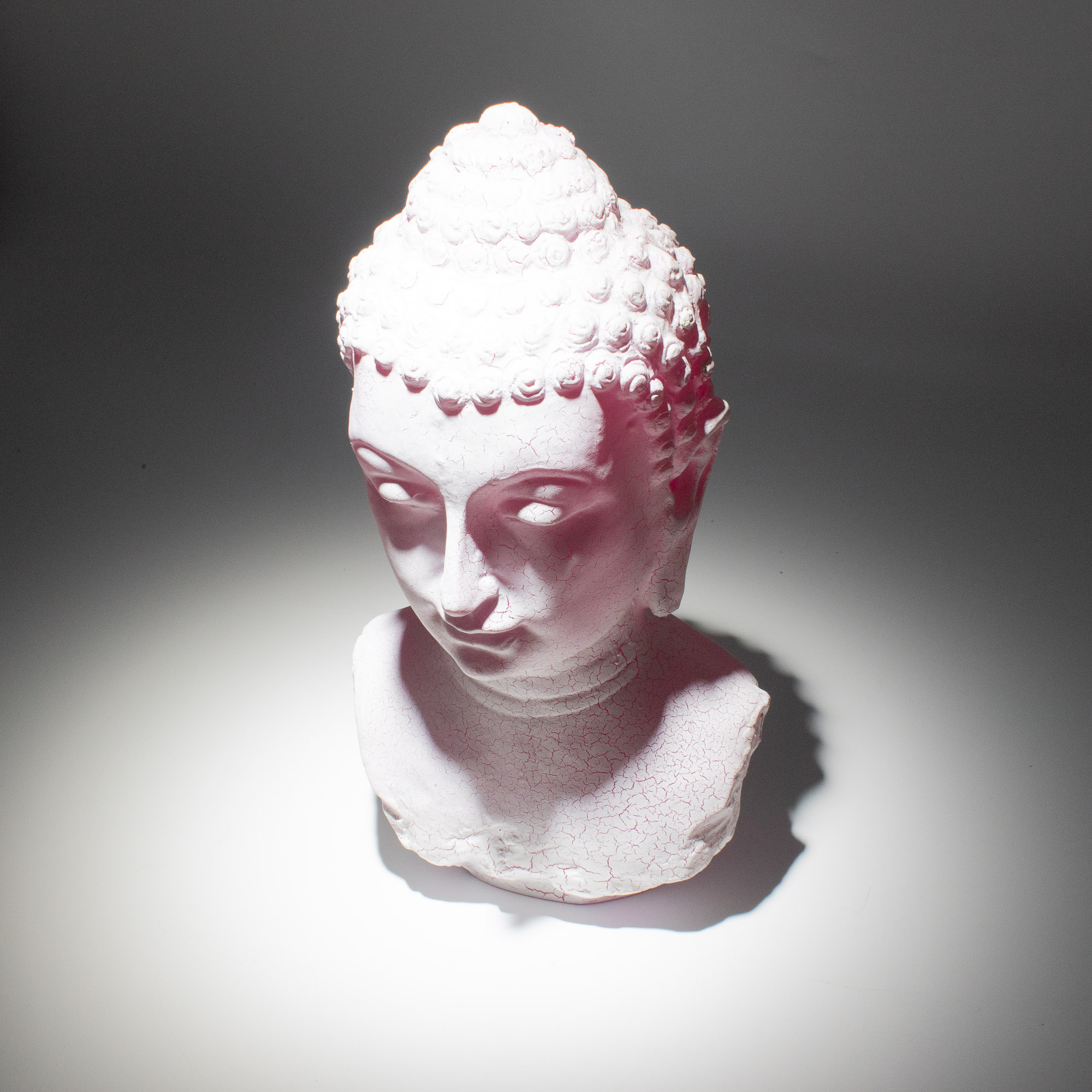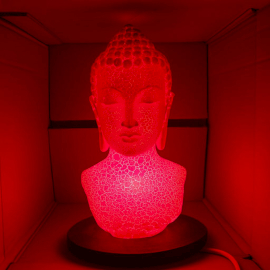 Budhova Busta – Tienidlo Čerešňové Popraskaný Efekt zobrazuje detailne spracovanú hlavu Budhu vyrobenú z kvalitného sklolaminátu. Jeho charakteristický „popraskaný“ efekt dodáva povrchu jemne patinovaný, remeselný vzhľad, ktorý ožíva najmä po rozsvietení. Vtedy vyžaruje výrazné čerešňovo-ružové svetlo, zvýrazňujúce textúru aj pokojný výraz tváre.