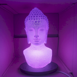 Budhova Busta - Tienidlo Levanuľové Popraskaný Efekt je vyrobené z kvalitného sklolaminátu a má decentný „popraskaný“ efekt. Vypnuté pôsobí minimalisticky a elegantne, po rozsvietení však vyžaruje upokojujúce levanduľovo-fialové svetlo, ktoré zvýrazňuje pokojné detaily sochy.
