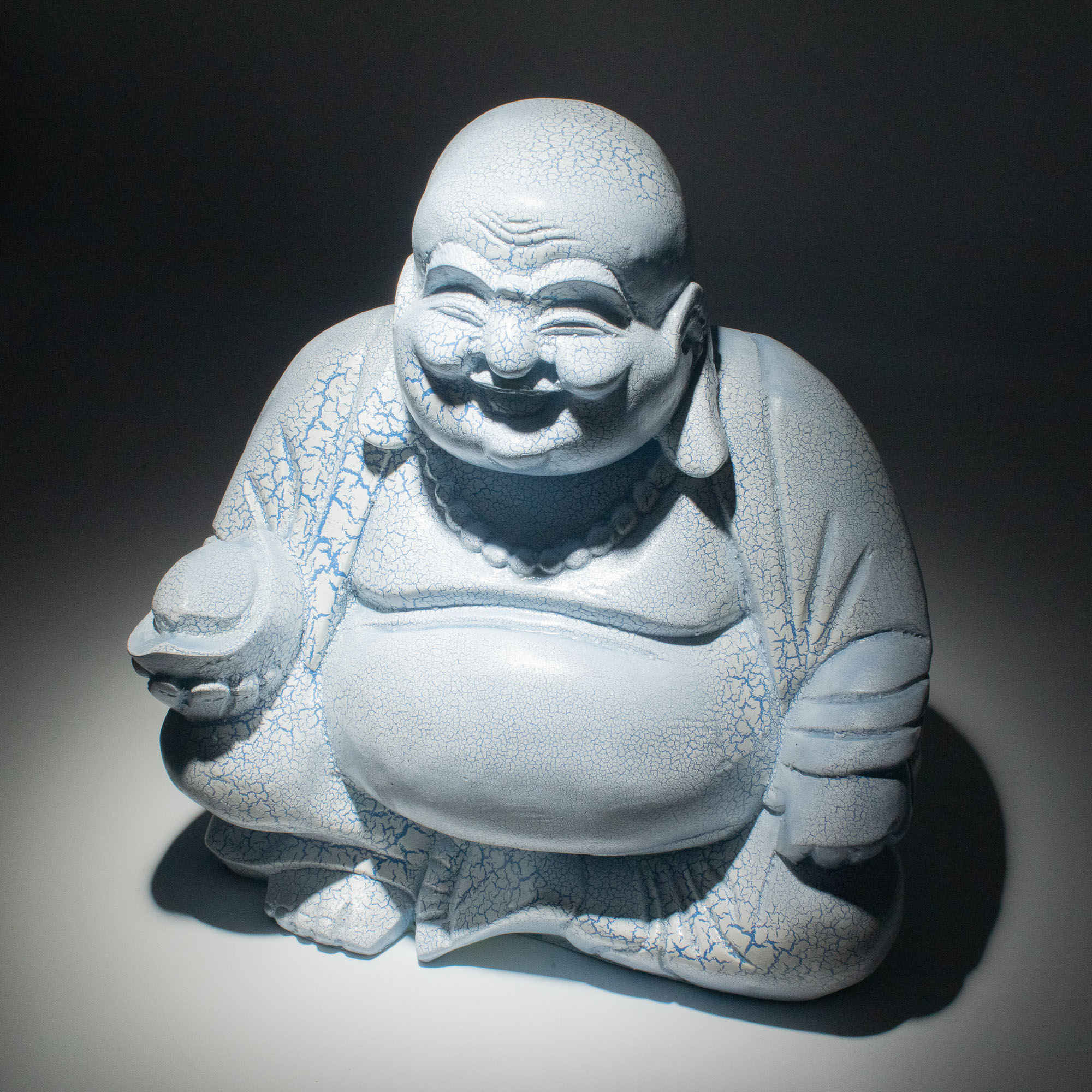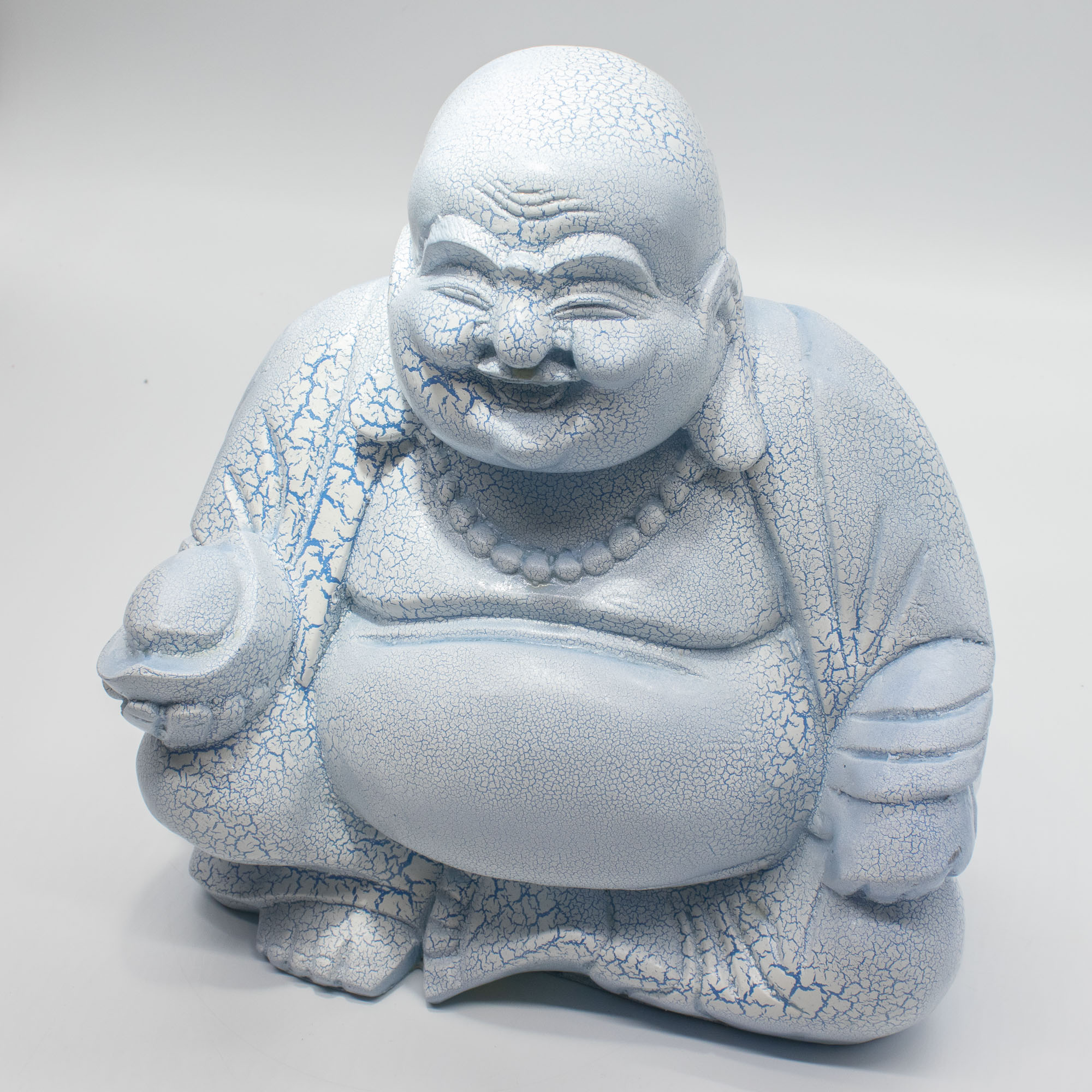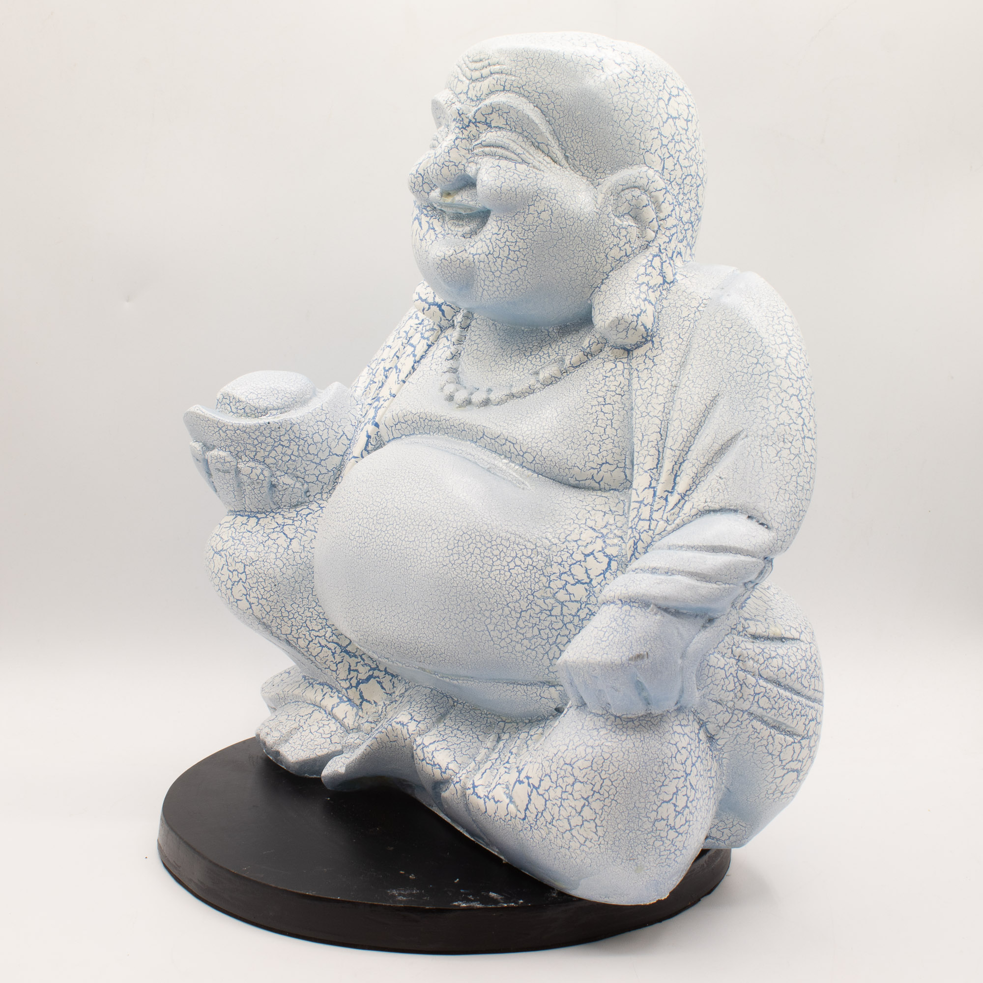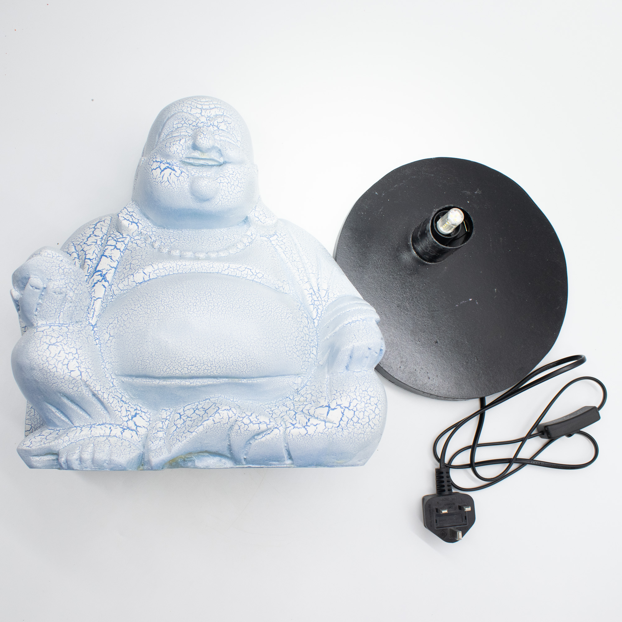 Povrch je doplnený o jemný „popraskaný“ efekt, ktorý dodáva textúru a hĺbku, viditeľnejšiu po rozsvietení. Sediaca postava Budhu umocňuje pocit pokoja, vďaka čomu je ideálny do priestorov zameraných na oddych, rovnováhu a všímavosť.