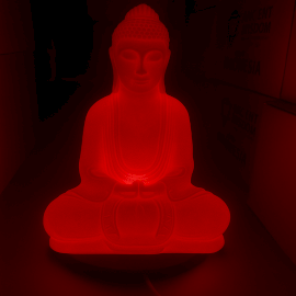 Sediaca meditačná poloha navodzuje pocit pokoja, zatiaľ čo „popraskaný“ povrch pridáva textúru, ktorá sa ešte viac zvýrazní po rozsvietení. Výsledkom je kúsok, ktorý pôsobí dekoratívne aj pohlcujúco a mení atmosféru priestoru.