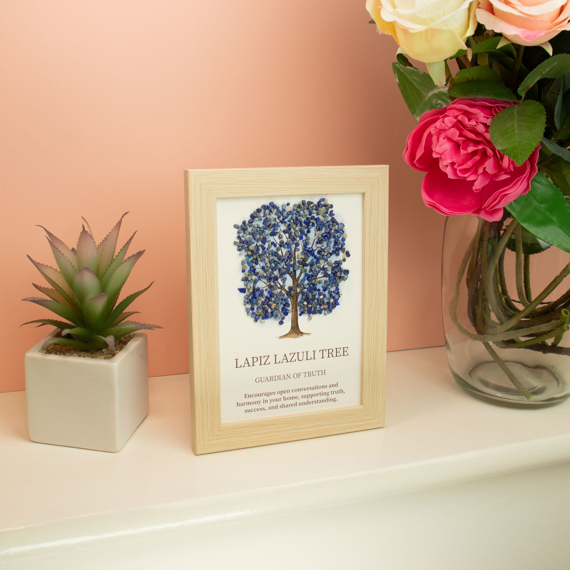 Drahokamový Obraz – Strom života – Lapis lazuli je navrhnutý ako symbolický „Strážca pravdy“, ktorý do domácnosti aj pracovného prostredia prináša jasnosť a sústredenú energiu. Koruna stromu je vytvorená zo skutočných úlomkov sýtomodrého lapisu lazuli, starostlivo usporiadaných tak, aby vytvorili bohatý textúrovaný povrch s výrazným priestorovým efektom na jemnom ilustrovanom pozadí.