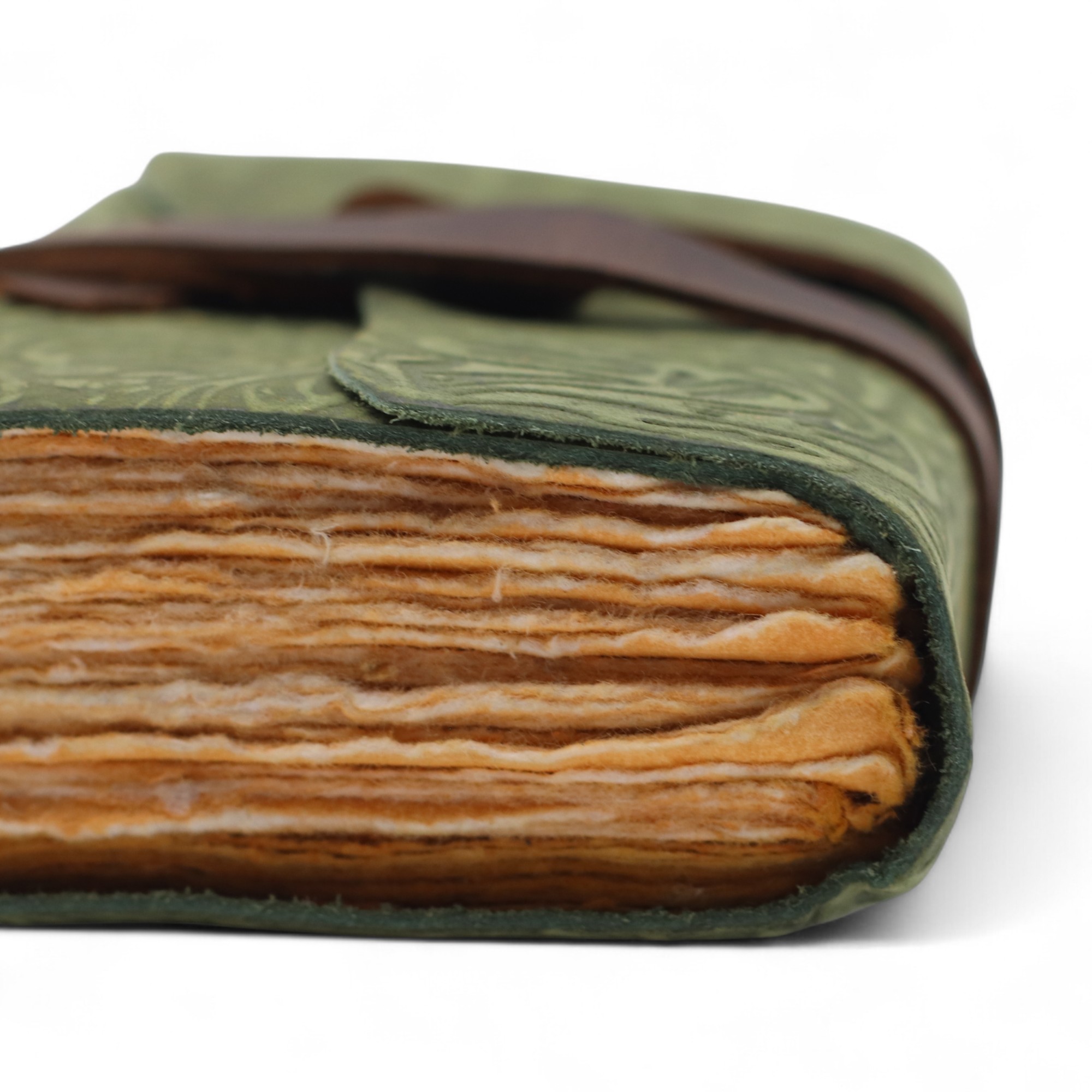 Krásne ručne vyrobený kožený zápisník v hlbokej lesnej zelenej farbe, zdobený prepracovaným reliéfom s kvetinovým vzorom v tvare bludiska. Jemná, pružná koža a zemité odtiene mu dodávajú nadčasový, prírodný pôvab – ideálny pre tvorivé duše a milovníkov prírody.