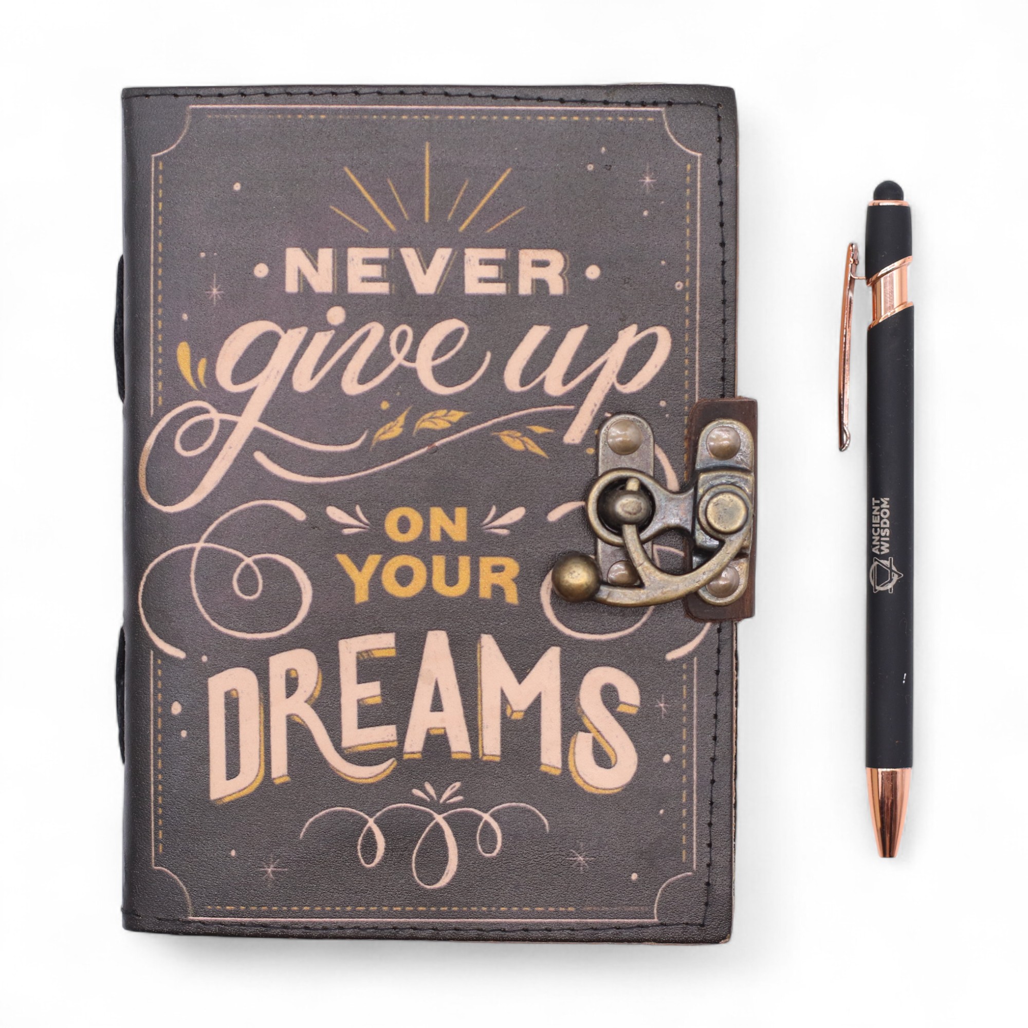 Inšpiratívny a nádherne spracovaný kožený zápisník „Never Give Up On Your Dreams“ prináša motiváciu aj štýl v jednom. Jemný matný povrch, elegantná typografia a zlatisté detaily mu dodávajú sofistikovaný a zmysluplný charakter.