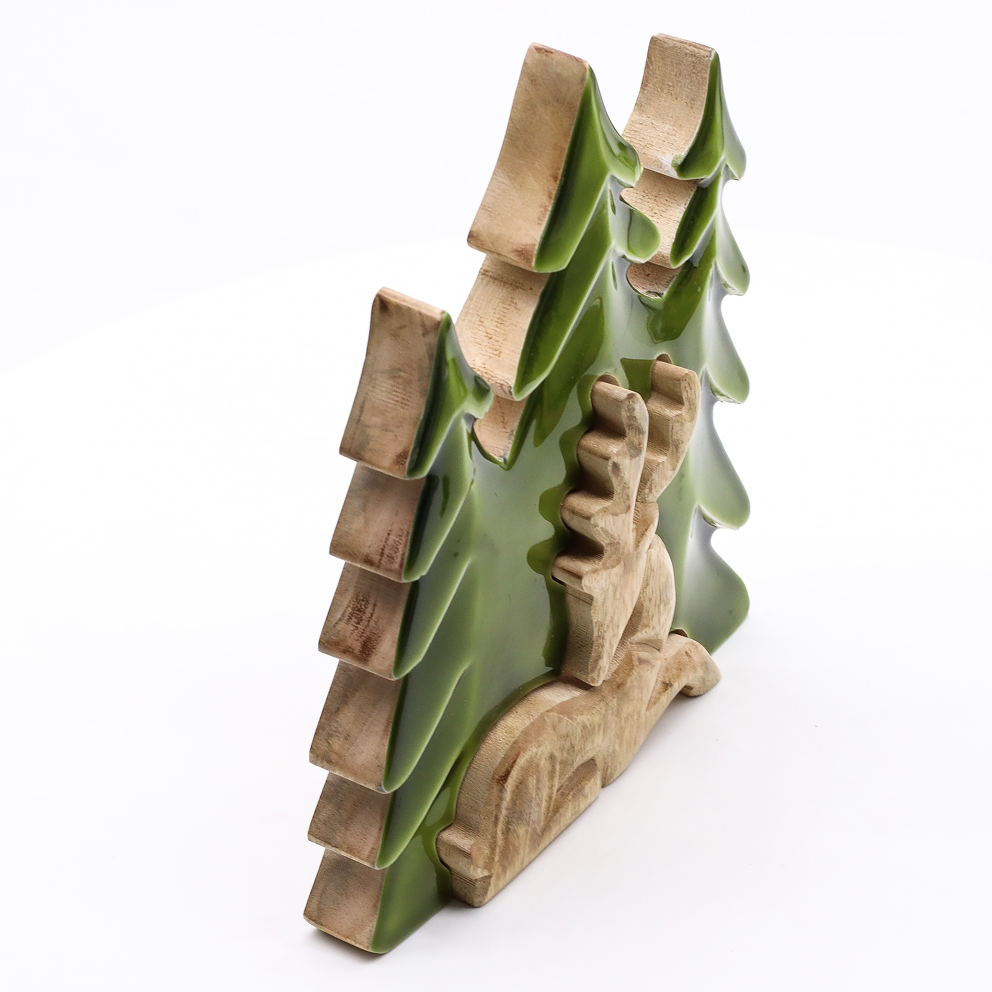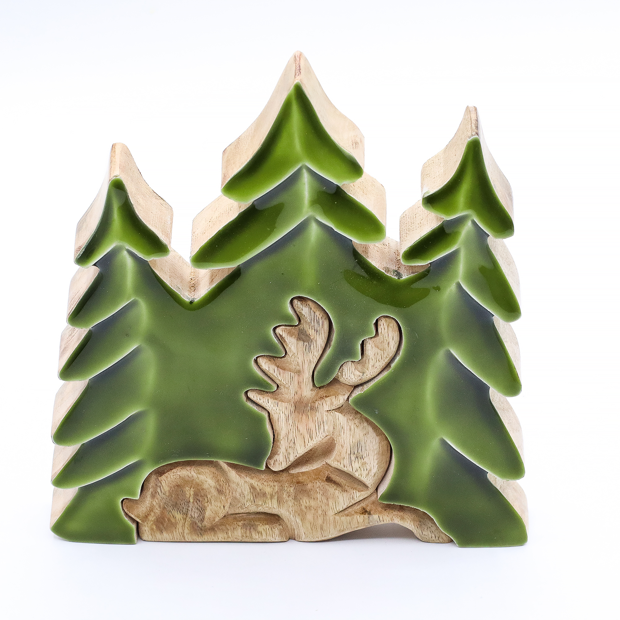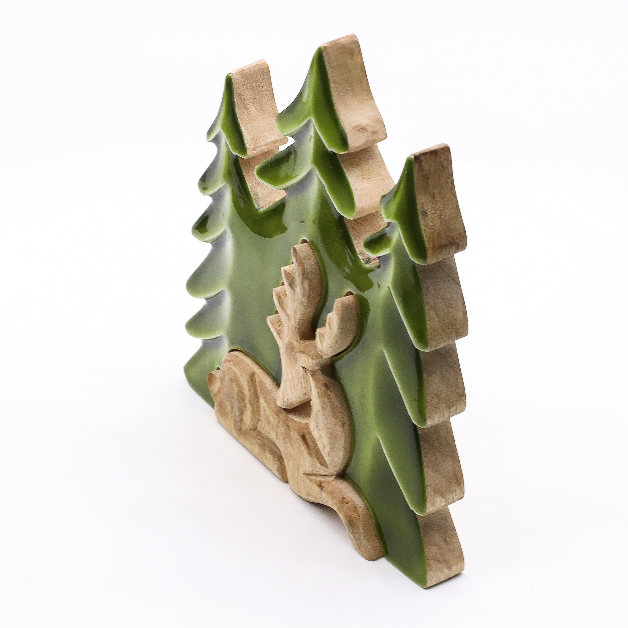Táto pôsobivá 3D dekorácia „Jeleň v lese“ vystihuje majestátnosť lesnej zveri a prenáša atmosféru prírody priamo do interiéru. Ručne vyrezávaná v Indii z udržateľného mangového dreva, zobrazuje výrazný trojrozmerný motív jeleňa v lesnom prostredí. Povrchová úprava s lesklým smaltom zvýrazňuje rustikálnu štruktúru a sýtozelené akcenty, čím vytvára dojem hĺbky a pokoja.
