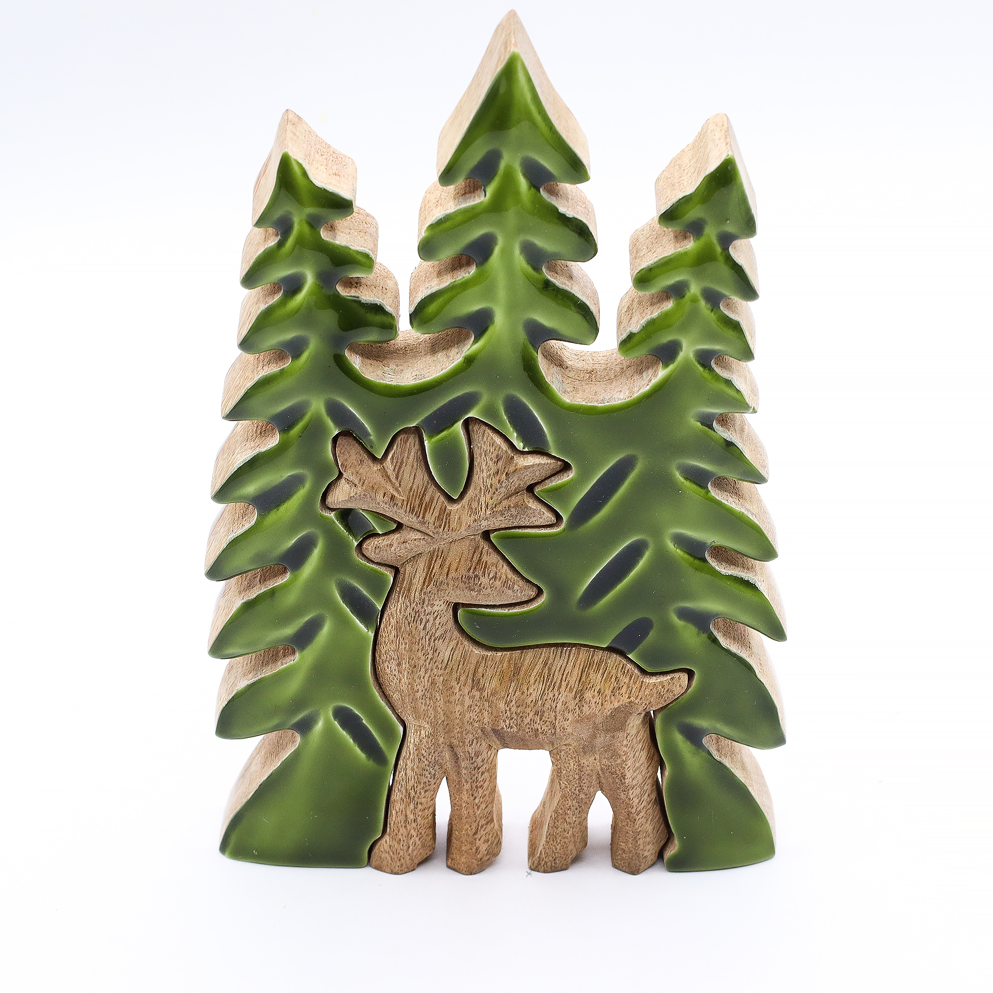Táto výrazná 3D dekorácia „Jeleň v lese“ zachytáva majestátnosť prírody v jej najkrajšej podobe. Ručne vyrezávaná v Indii z udržateľného mangového dreva, zobrazuje pôsobivý trojrozmerný motív jeleňa v lesnom prostredí. Vďaka lesklej smaltovanej úprave v kombinácii s rustikálnym drevom a žiarivými zelenými detailmi prenáša pokoj lesa priamo do interiéru.
