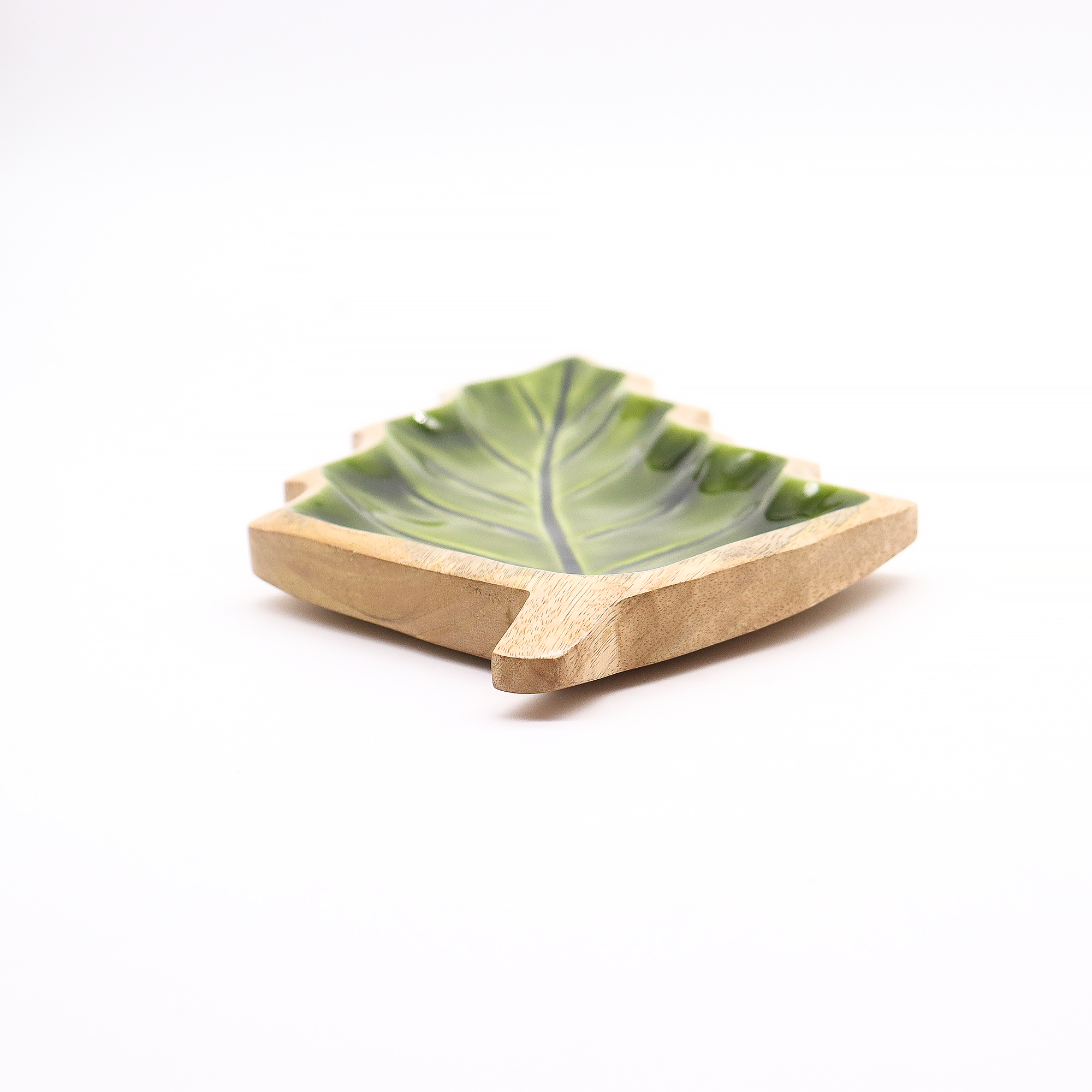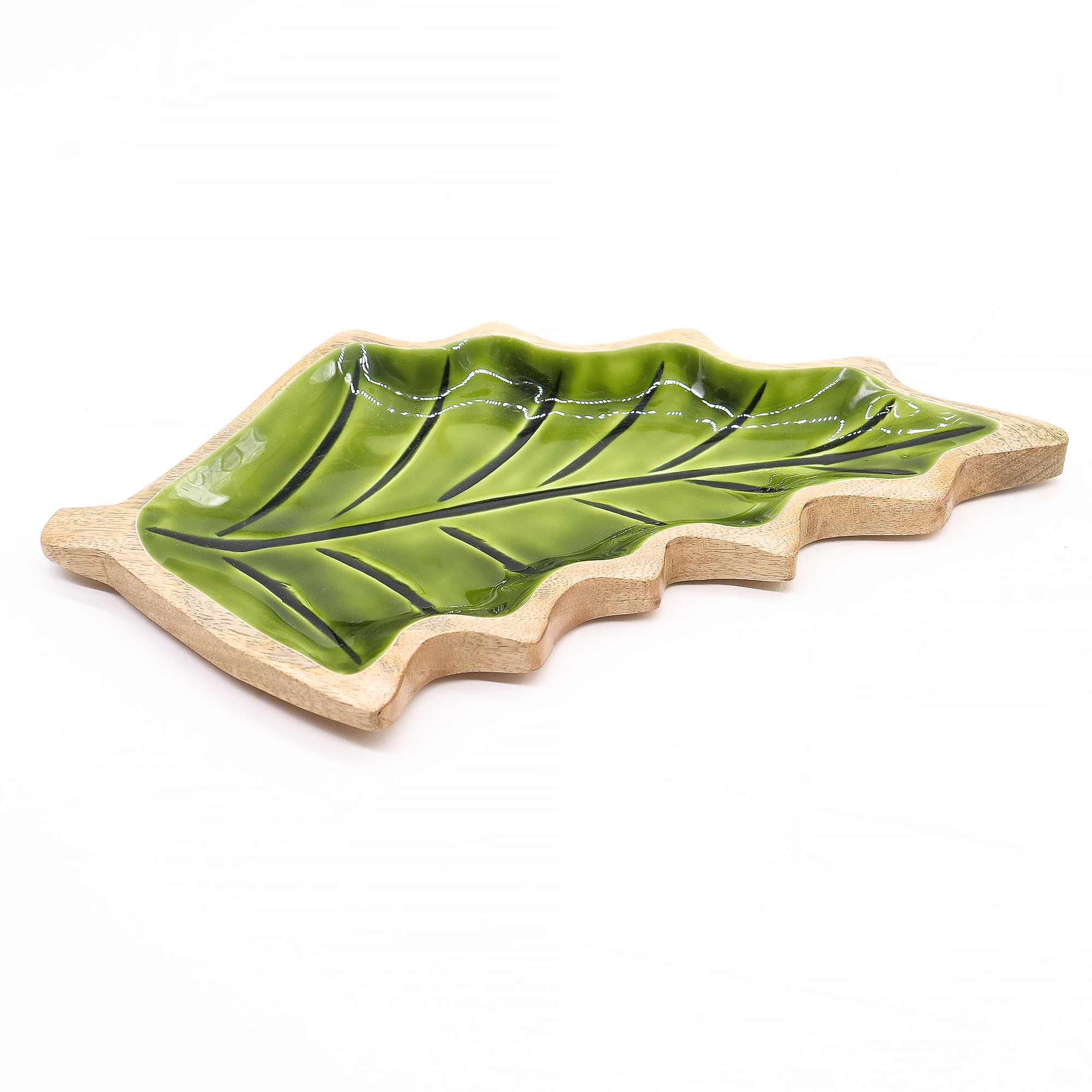 Táto výrazná miska v tvare listu je praktickým aj dekoratívnym doplnkom, ktorý vnesie do priestoru príjemný nádych lesa. Ručne vyrezávaná v Indii z udržateľného mangového dreva, zaujme elegantným tvarom listu. Vnútro misky je upravené lesklým zeleným smaltom, ktorý vytvára pôsobivý kontrast k prírodnému drevu a dodáva produktu svieži vzhľad.