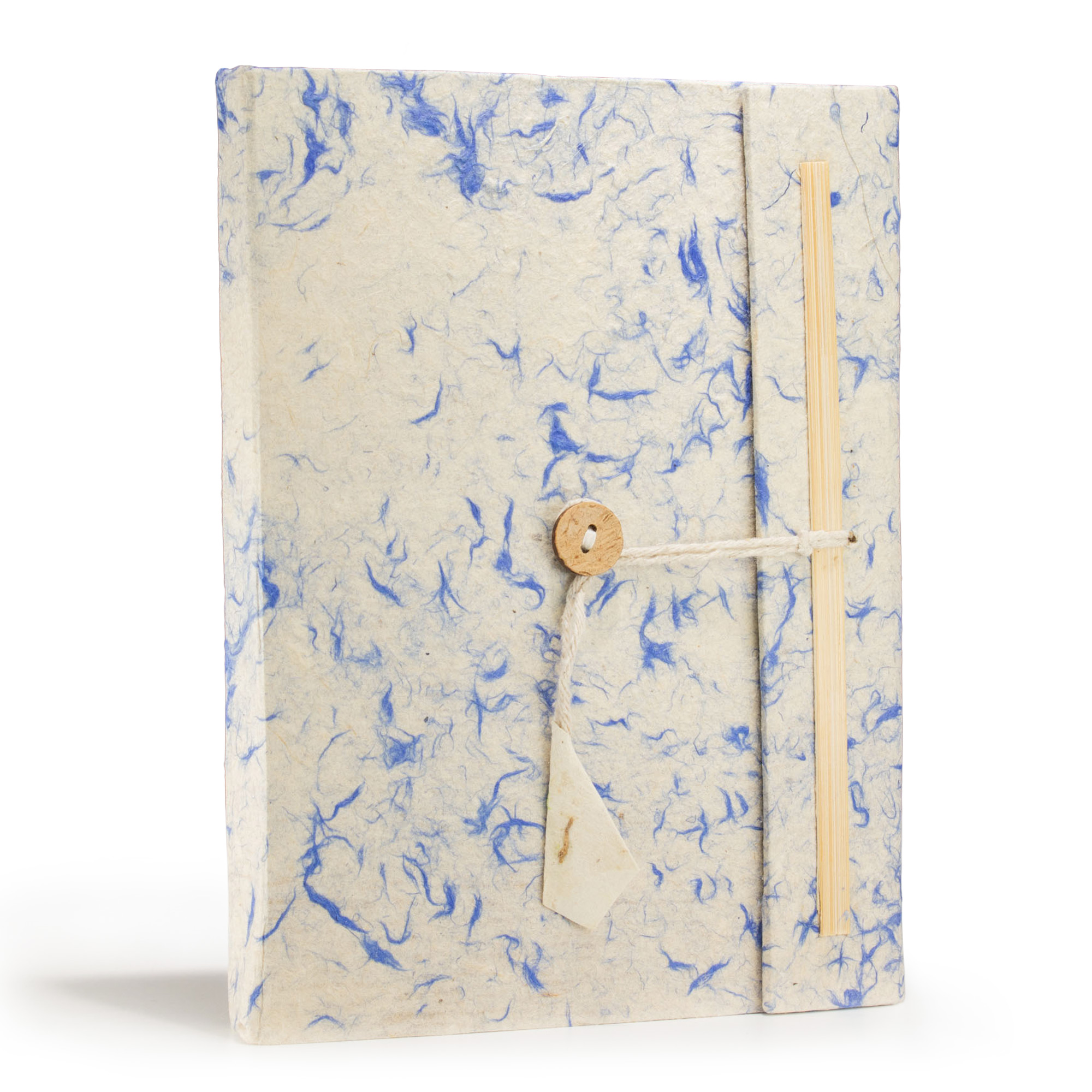 Tento veľký zápisník má obálku z ručne vyrábaného lokta papiera, posiatu recyklovanými modrými bavlnenými vláknami, ktoré mu dodávajú jemnú, oblačnú textúru. Obsahuje 45 čistých strán a zladenú záložku z rovnakého papiera, vďaka čomu spája estetiku s praktickosťou. Zaviazanie šnúrkou vytvára rustikálny dojem – ideálne na kreatívne písanie, denníky alebo ako premyslený darček.