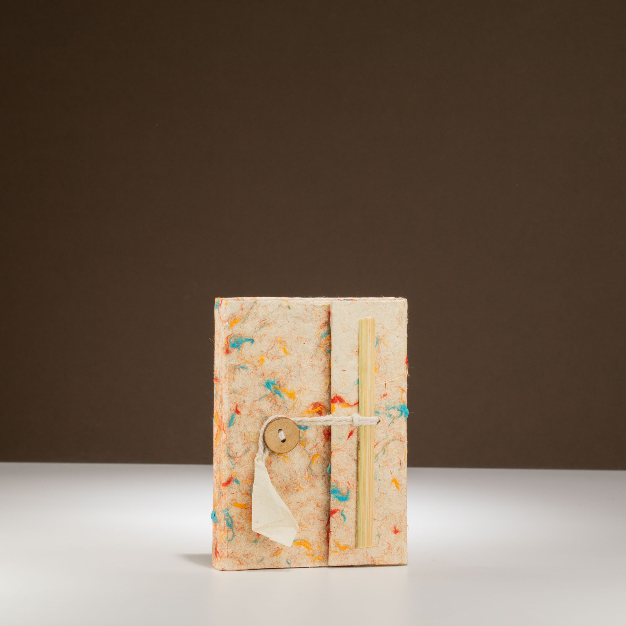Tento malý zápisník spája jednoduchosť s udržateľnosťou. Jeho obálka z prírodného lokta papiera a farebných bavlnených vlákien vytvára jedinečný mramorový vzhľad, ktorý pôsobí ručne a osobne.