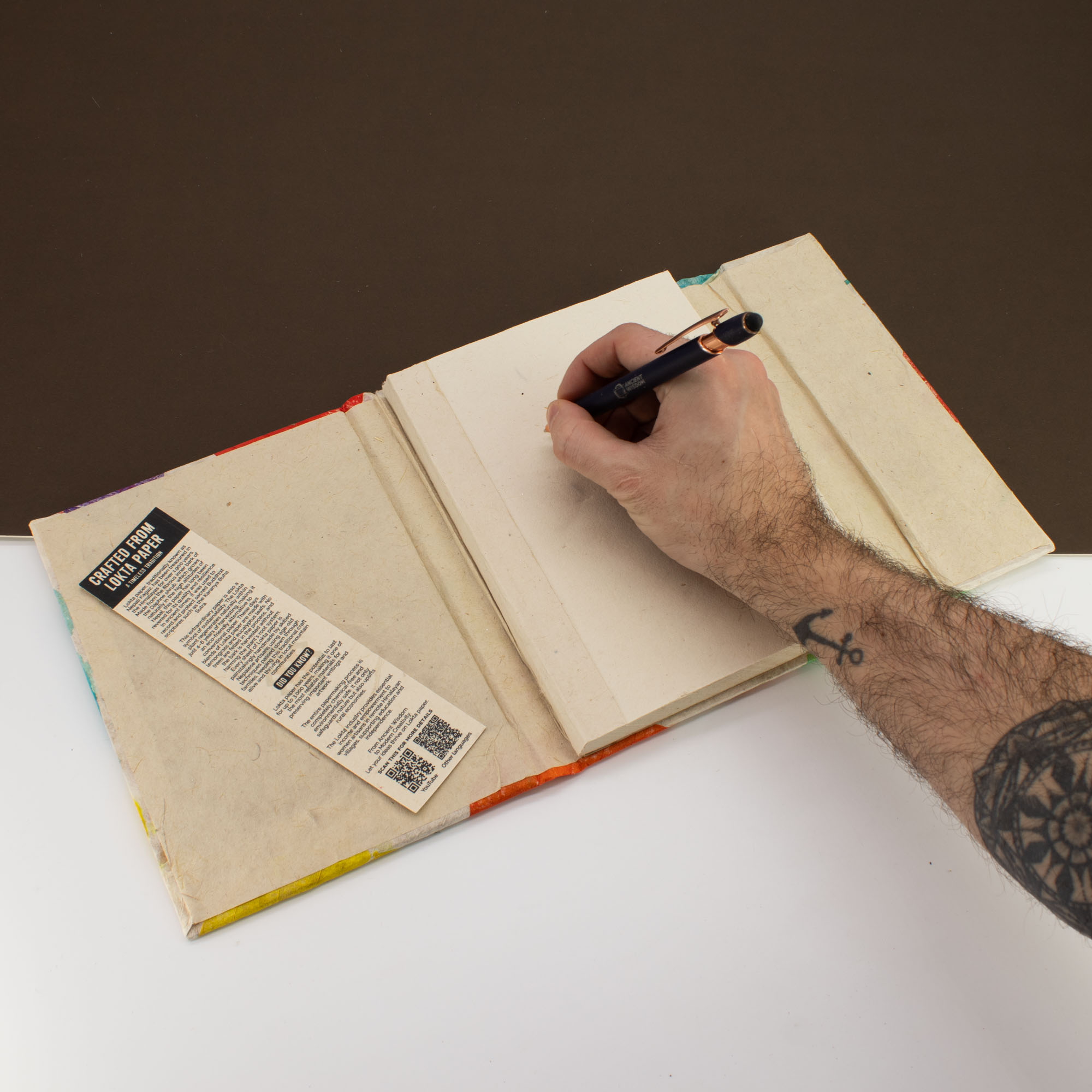 Vďaka výrazným farbám pôsobí živo a veselo, čo z neho robí obľúbený výber pre umelcov, deti, tvorivých ľudí alebo kohokoľvek, kto rád píše v inšpiratívnom prostredí. Rozmer 21 × 15 cm poskytuje dostatok miesta na denníky, kresby či zmiešané médiá. Pevná ručne vyrobená obálka v kombinácii s jemnými stranami vytvára veselý, no remeselne pôsobiaci produkt, ktorý si na poličke ihneď všimnete.