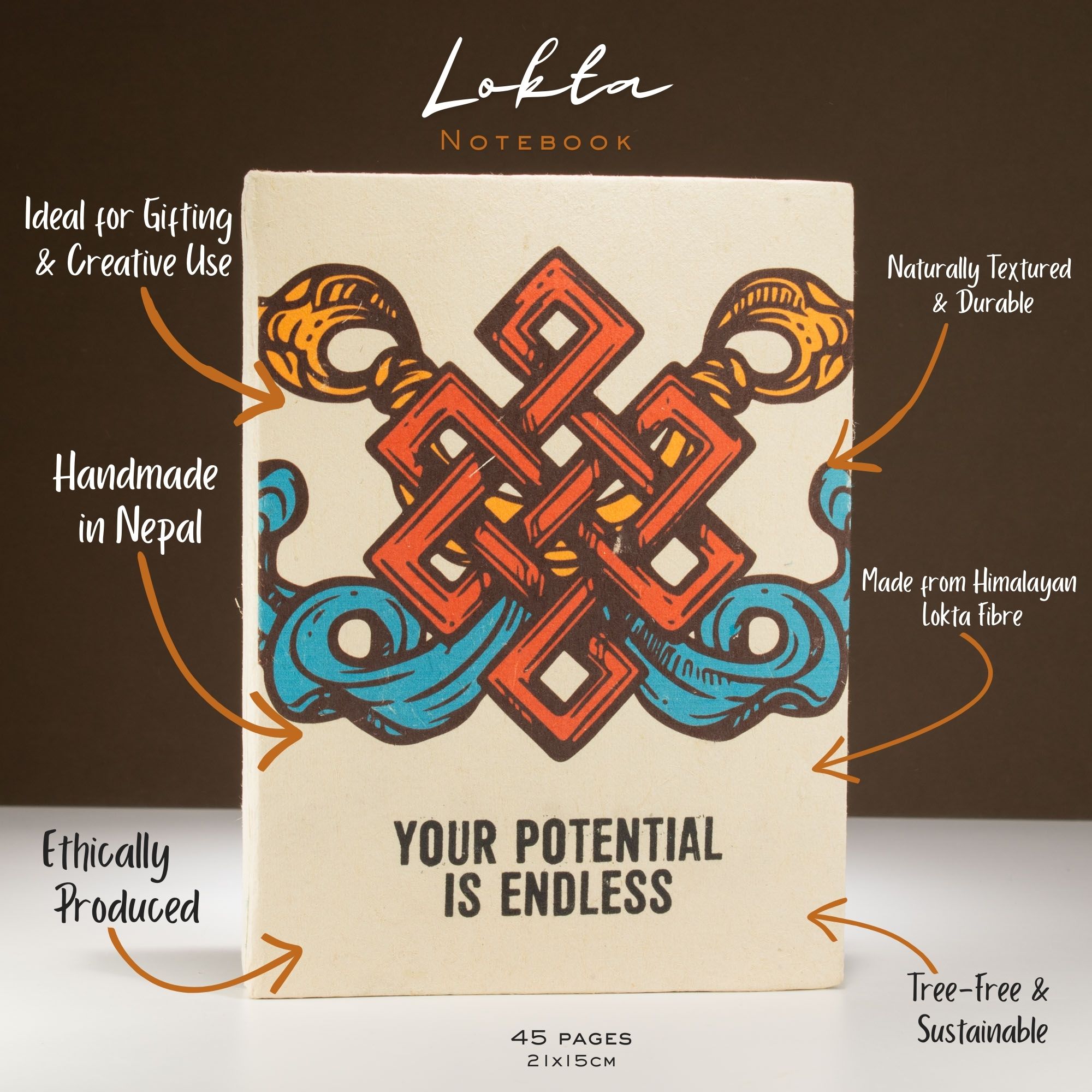 Povzbudivý a praktický – tento inšpiratívny zápisník z lokta papiera prináša pozitívne posolstvo už od prvého pohľadu. Na obálke dominuje výrazný červeno-oranžový motív s nápisom „Tvoj potenciál je nekonečný“, ktorý podporuje sebavedomie a zároveň spája vysokú kvalitu s ručne vyrábaným pôvabom.