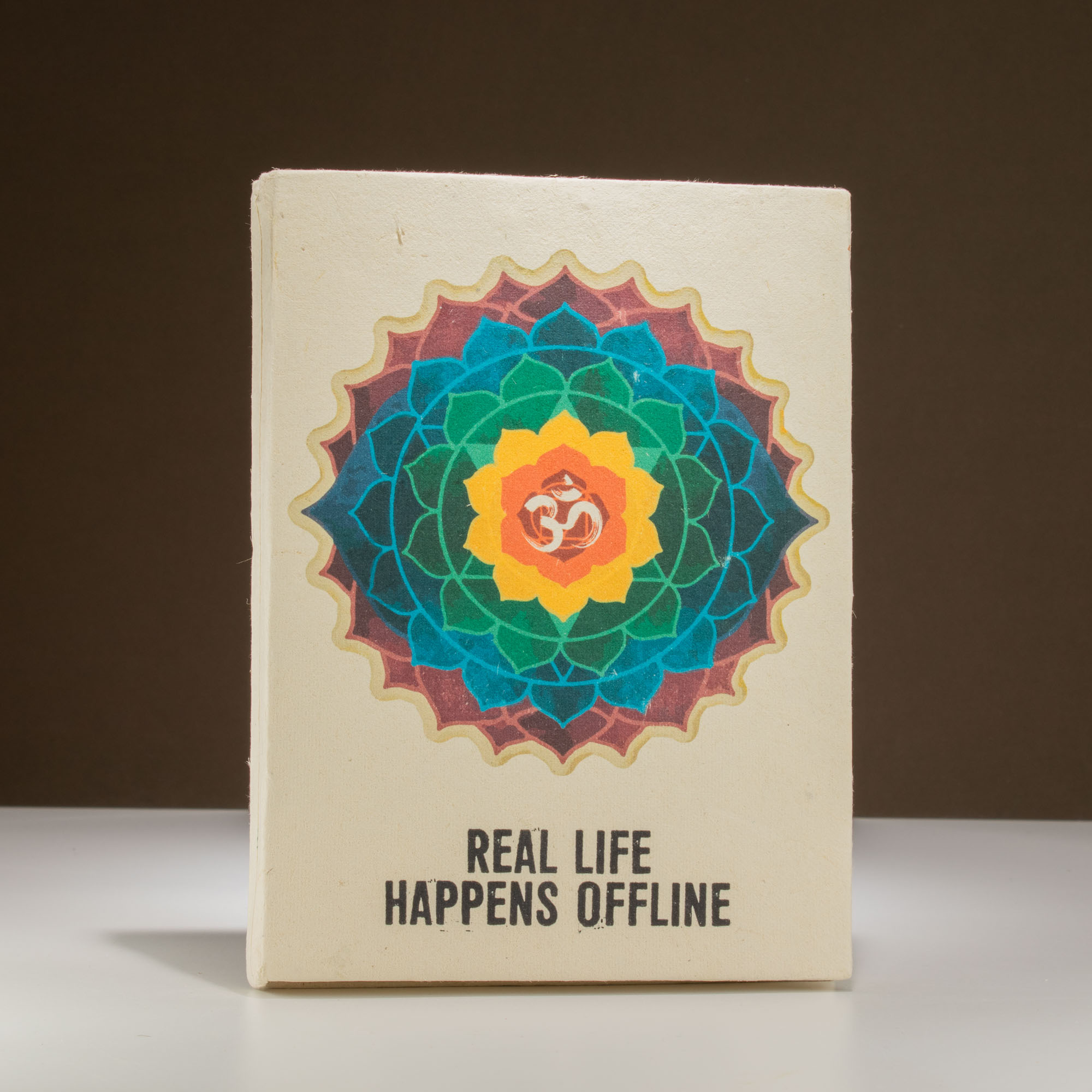 Tento veľký lokta zápisník oslovuje modernú túžbu po spomalení a odpútaní sa od digitálneho sveta. S výrazným posolstvom „Skutočný život sa deje offline“ a mandalovým motívom v žiarivých farbách predstavuje silné vizuálne aj filozofické vyjadrenie.