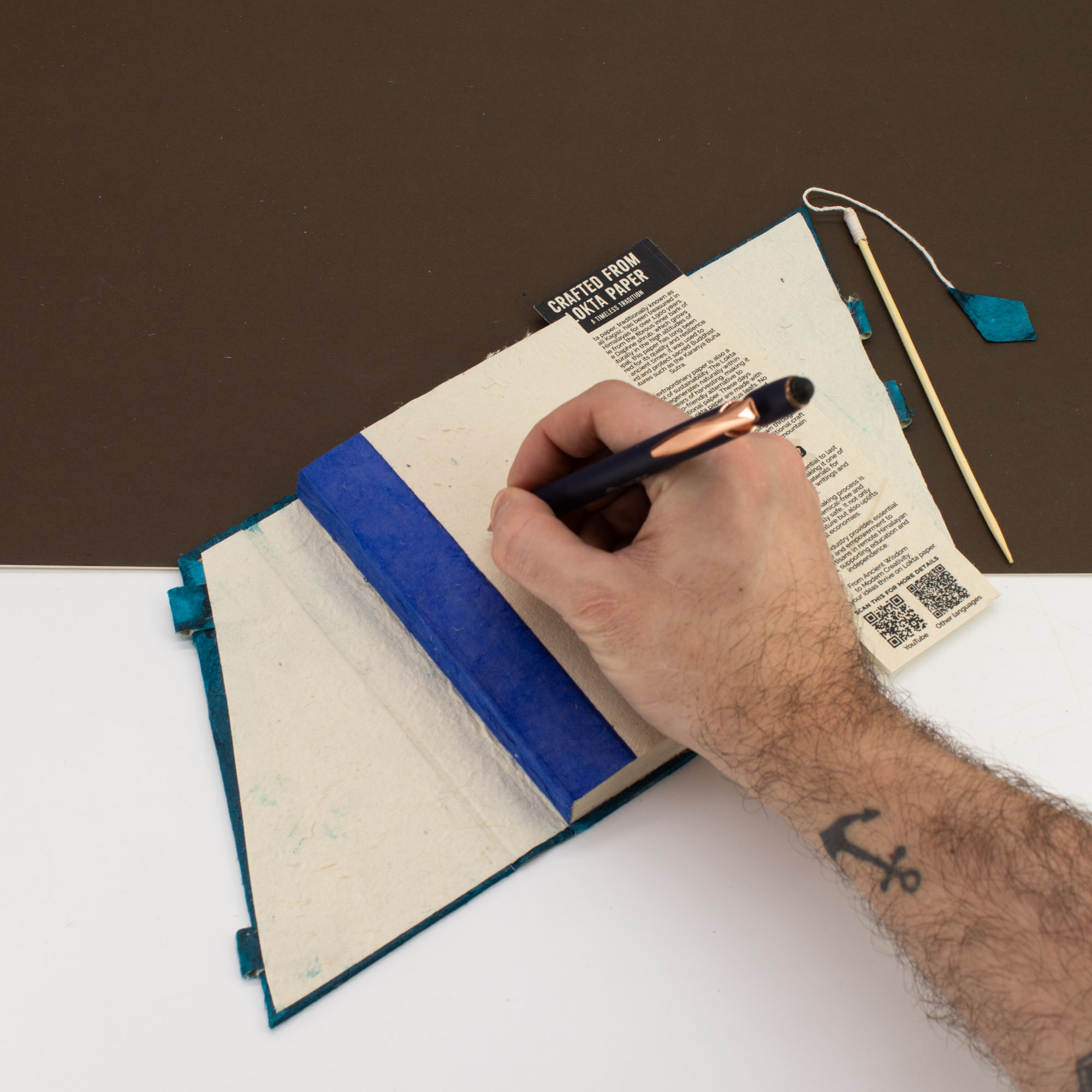 Štíhla bambusová tyčinka slúžiaca ako zapínanie zabezpečuje stránky a vytvára lineárny kontrast k organickej textúre papiera. Kompaktný formát robí zápisník ľahko prenosným a nenápadným, vhodným pre zákazníkov, ktorí uprednostňujú čistý, funkčný dizajn pred výraznou dekoráciou.