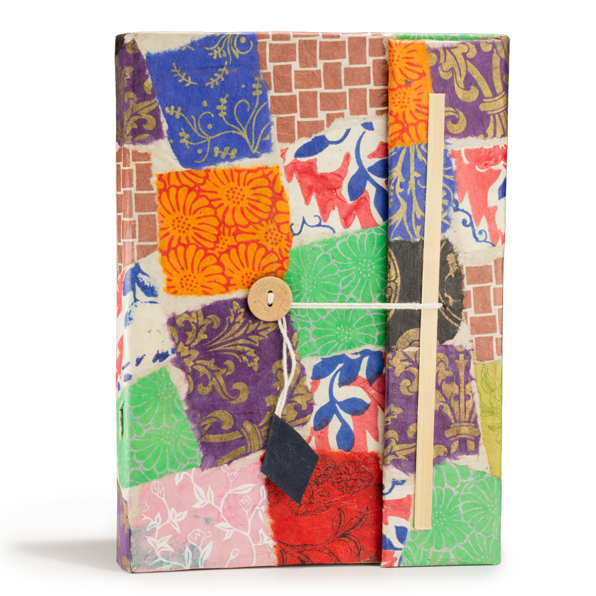 Každý kus je ručne vyrábaný v Nepále z tradičného loktového papiera, čo mu dodáva výraznú textúru a autentický remeselný charakter, založený skôr na ručnej práci než na dokonalej uniformite. Drevené gombíkové zapínanie a textilná záložka prinášajú do výrazného dizajnu poriadok a funkčnosť, čím vyvažujú kreativitu s praktickým používaním.