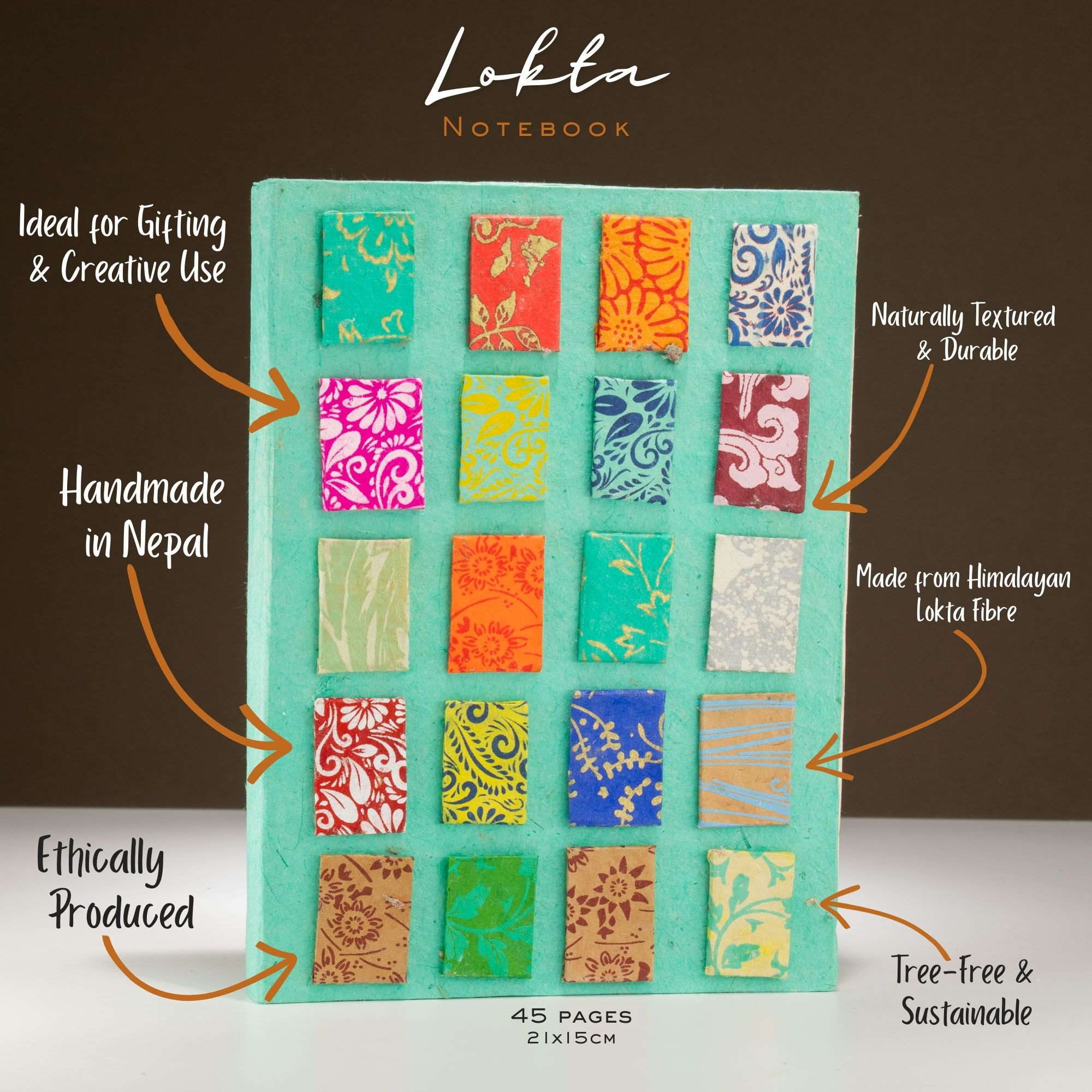 Tento loktový zápisník Mini Dlaždíc pracuje so vzorom namiesto kvetinových motívov. Mriežka samostatne zdobených papierových panelov vytvára rytmický, takmer mozaikový obal. Na tyrkysovom pozadí prináša každý „dlaždicový“ prvok vlastnú farbu a motív, vďaka čomu pôsobí dizajn hravo, no zároveň vyvážene.