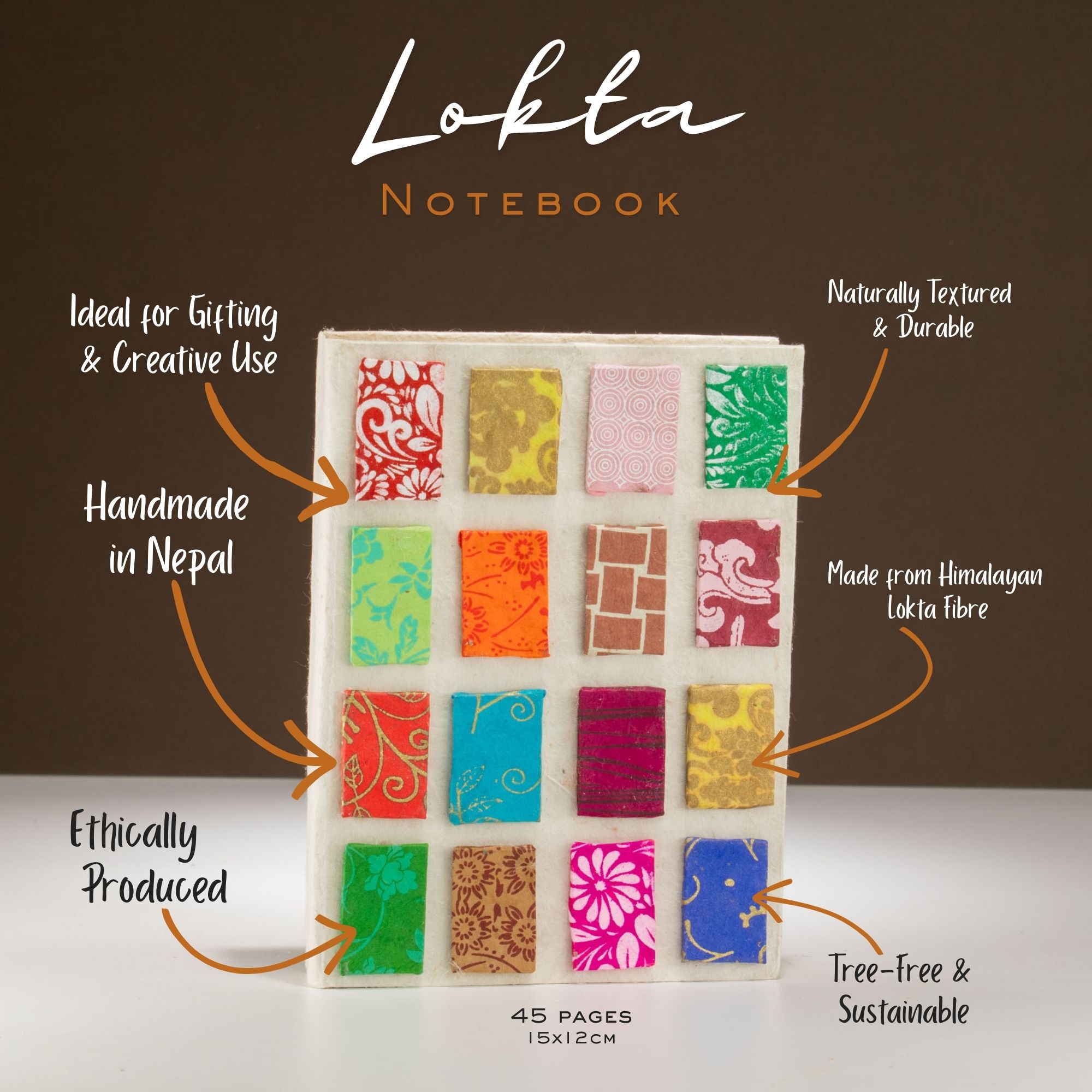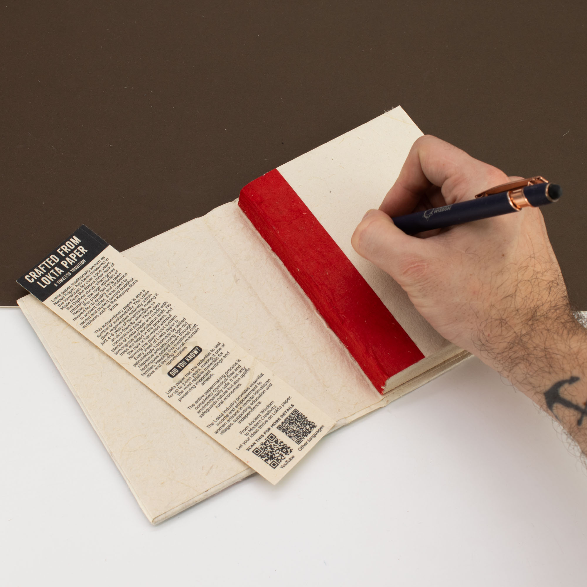 Vo vnútri sa nachádza 45 ručne vyrábaných listov z loktového papiera, z ktorých každý nesie jemné odchýlky typické pre tradičné papierenské techniky v Nepále. Papier je vhodný na písanie aj ľahké skicovanie a podporuje časté, prirodzené používanie.