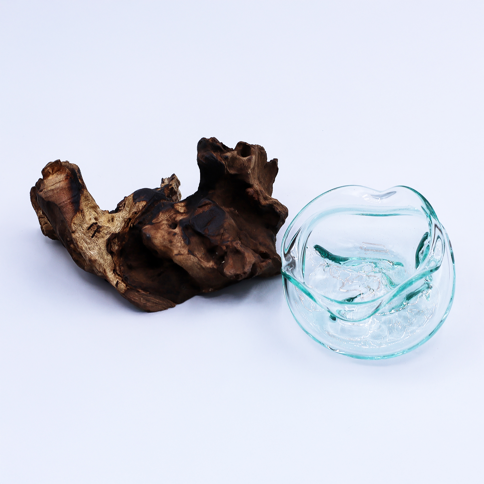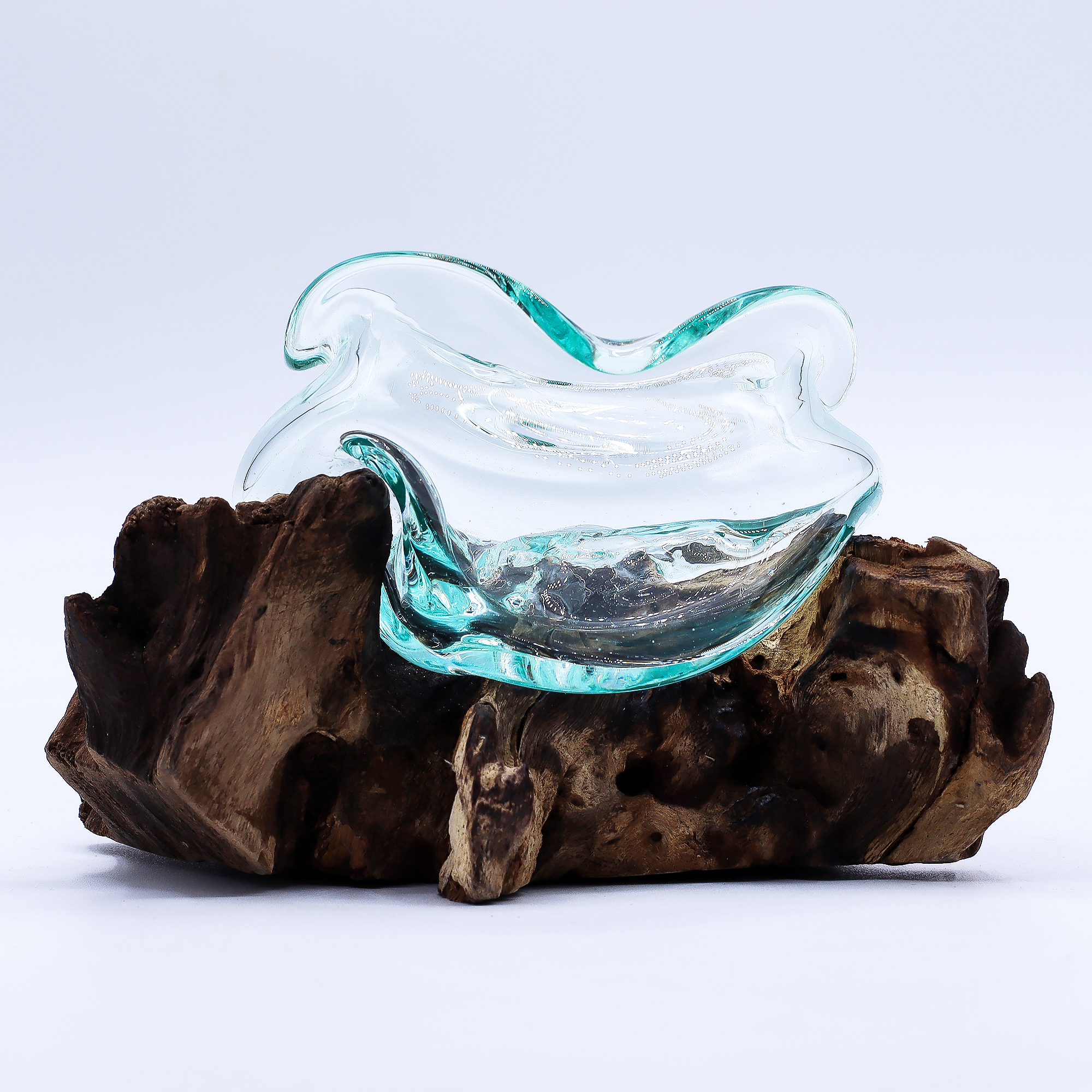 Tavené sklo je tvarované priamo na drevenom podklade, čím vznikajú elegantné vlny a organické krivky, ktoré sa dokonale spájajú so základom. Jej sochársky dizajn ponúka všestranné využitie – ideálna na čajové sviečky, plávajúce kvety, mušle či drahé kamene.