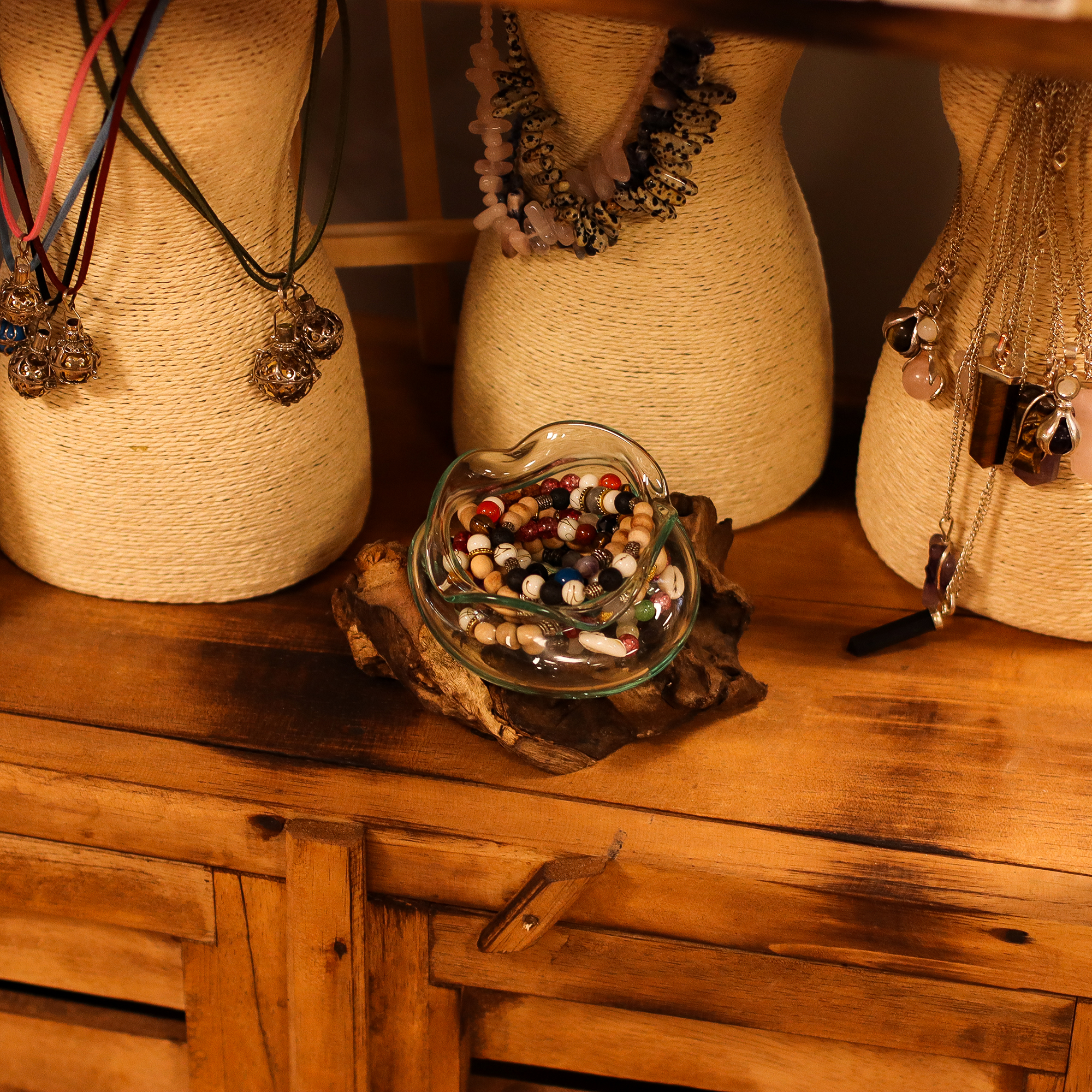 Jednoducho ju zaradíte do kolekcií so zameraním na wellness, spa alebo ekologické bývanie, kde sú prírodné textúry a ručná výroba žiadané. Priehľadné sklo s jemným tyrkysovým odtieňom krásne ladí so zemitým tónom dreva, čím vytvára nadčasový kúsok inšpirovaný prírodou, ktorý dokonale zapadne do prímorského, boho alebo rustikálneho štýlu.
