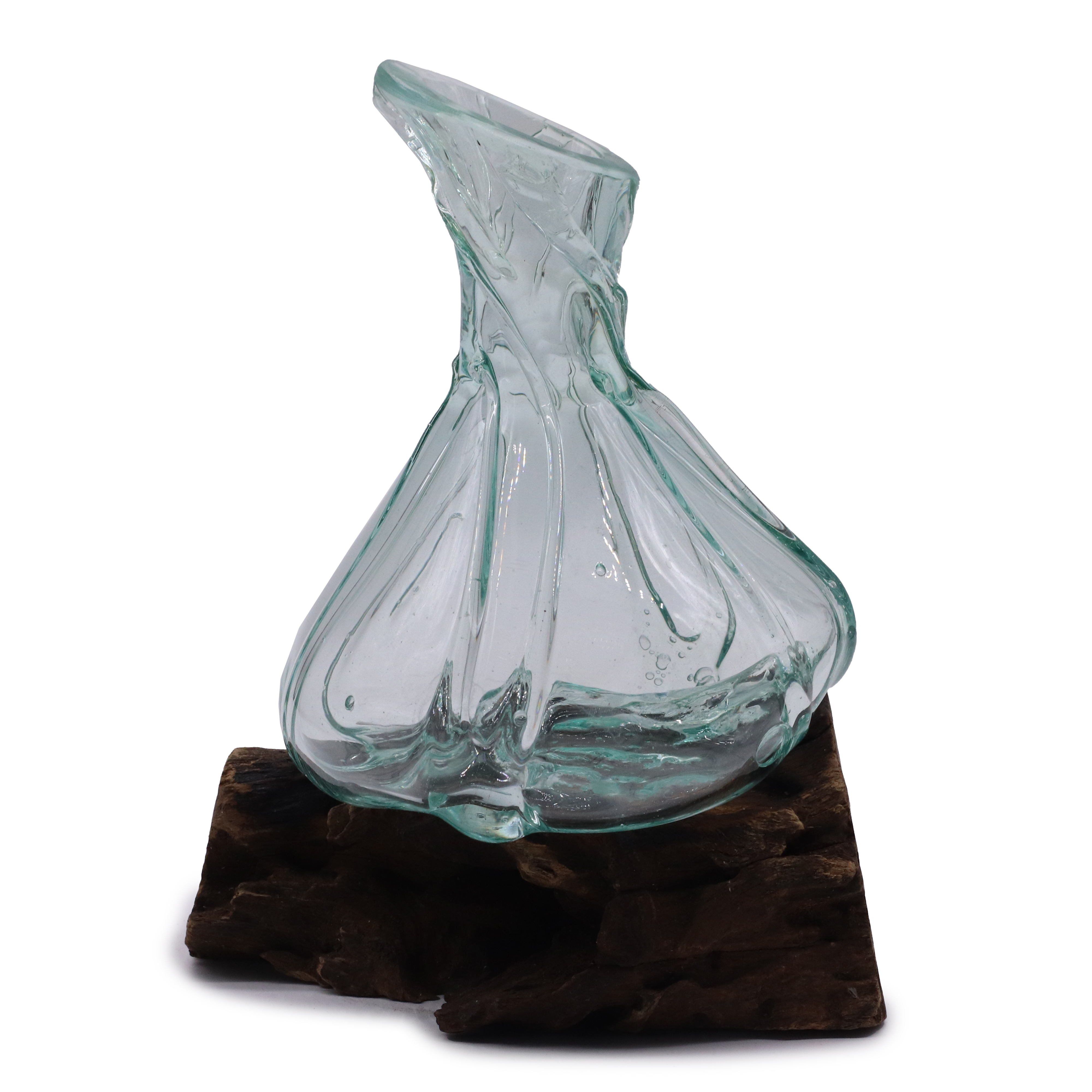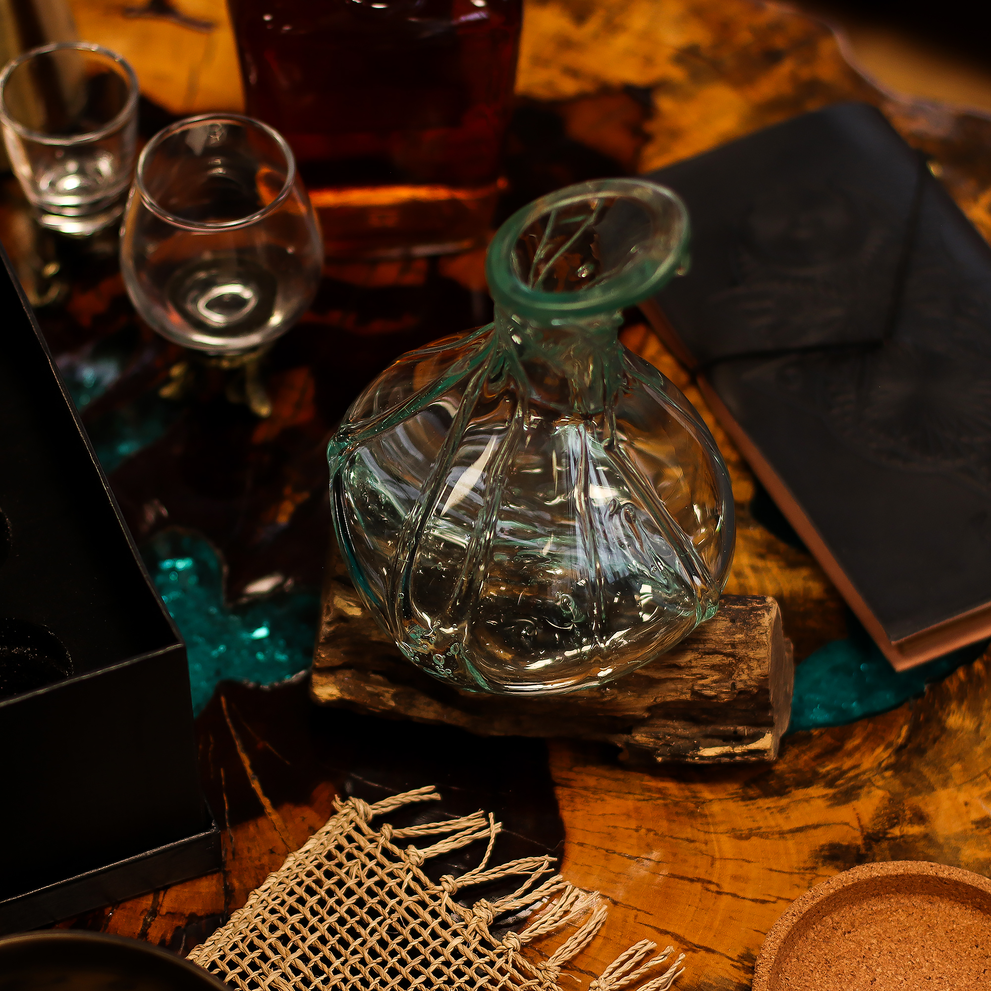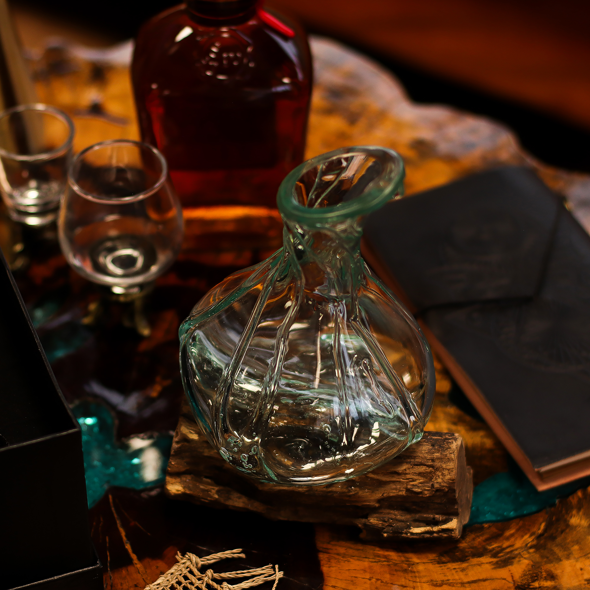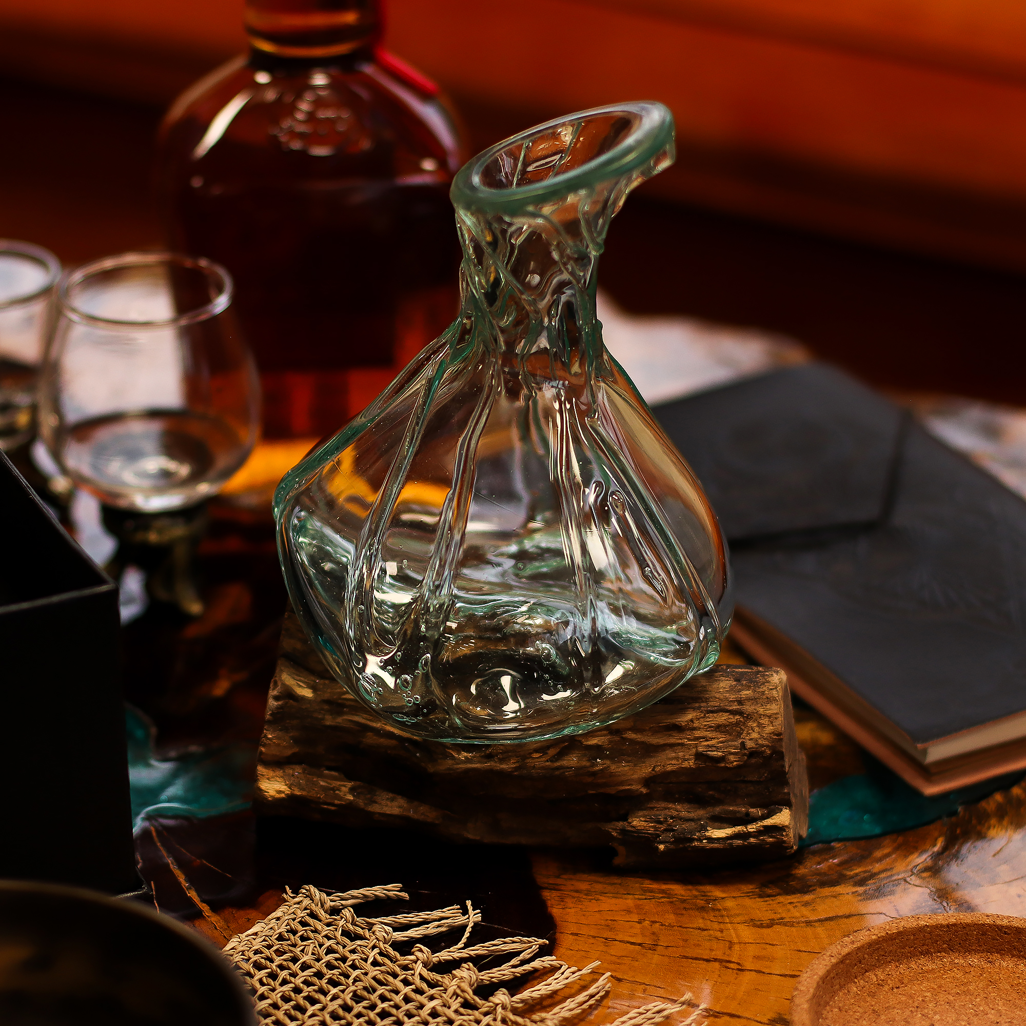 Každá karafa je ručne vyfúkaná z recyklovaného skla a elegantne spočíva na prírodnom drevenom podstavci, ktorý je tvarovaný počas chladenia skla tak, aby dokonale zapadol. Jej elegantná silueta a organická textúra ju robia ideálnou ako funkčnú karafu na víno či vodu, alebo ako dekoratívny dizajnový prvok.