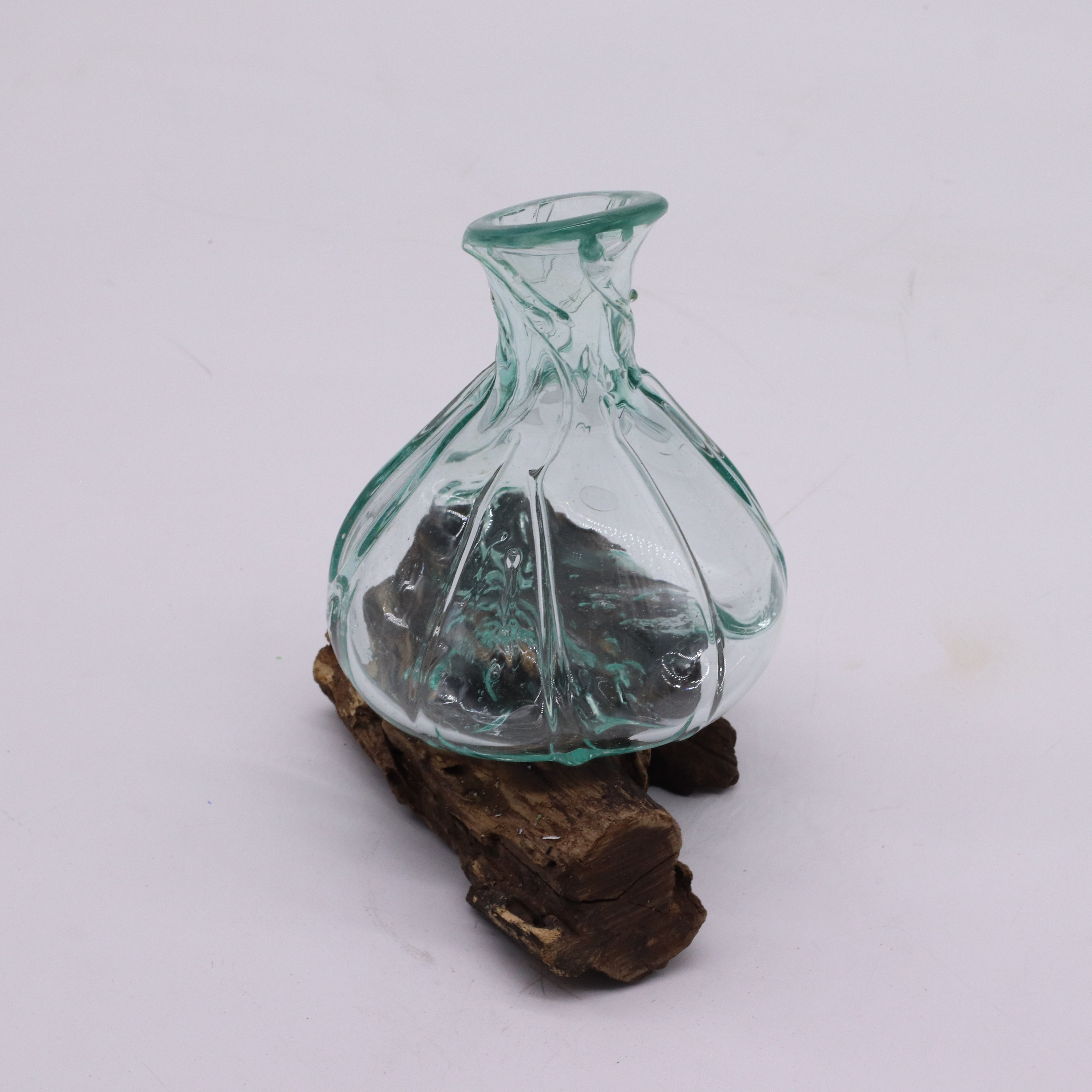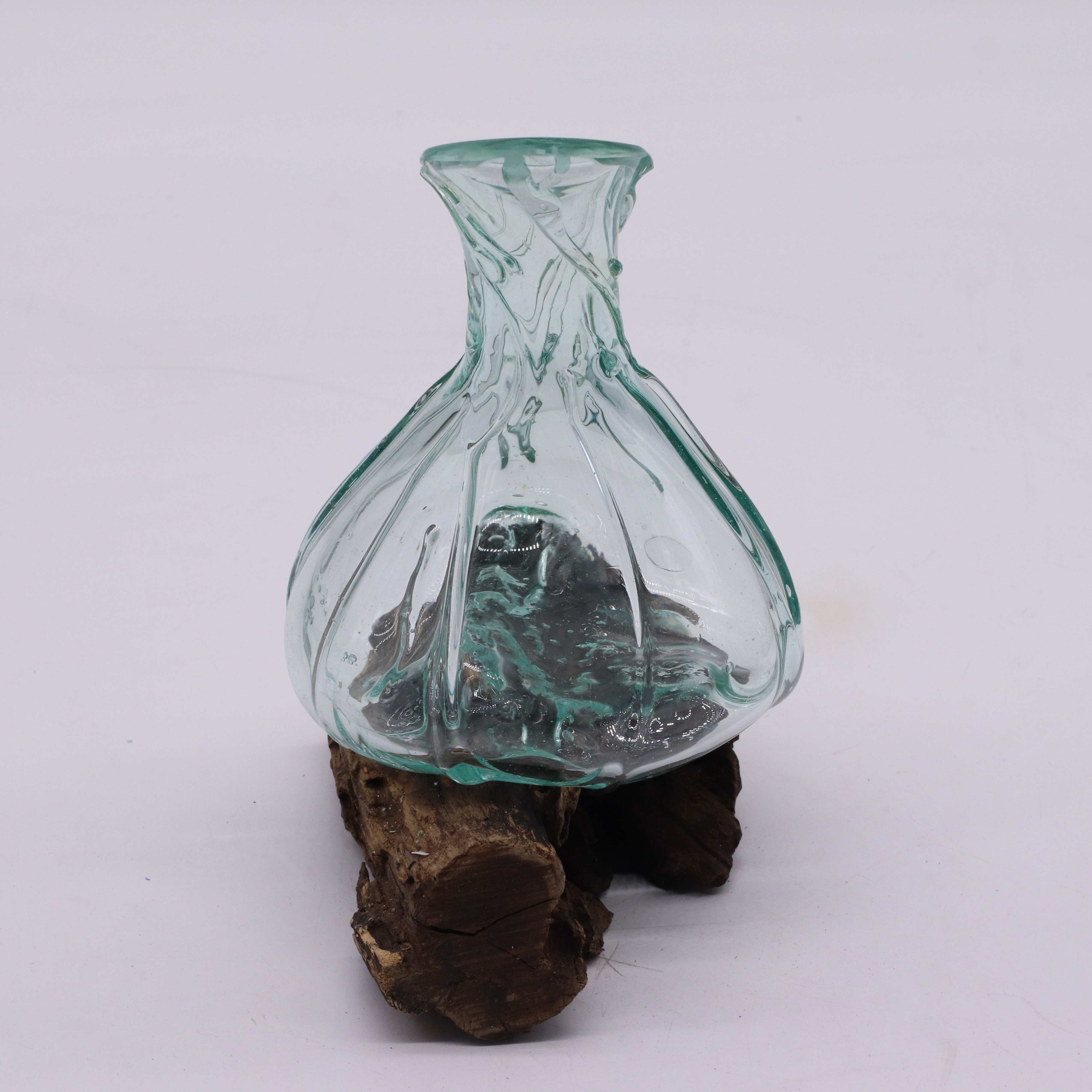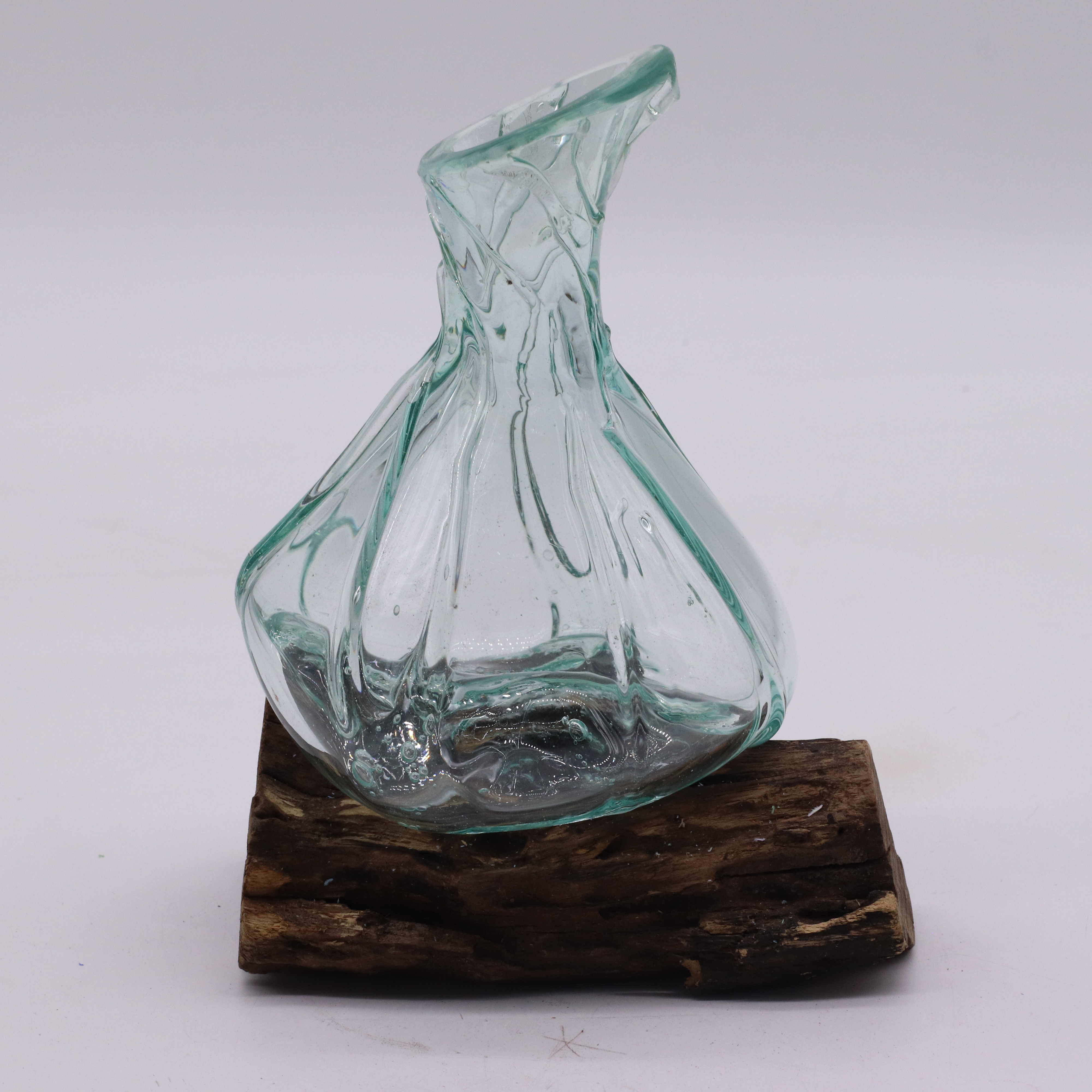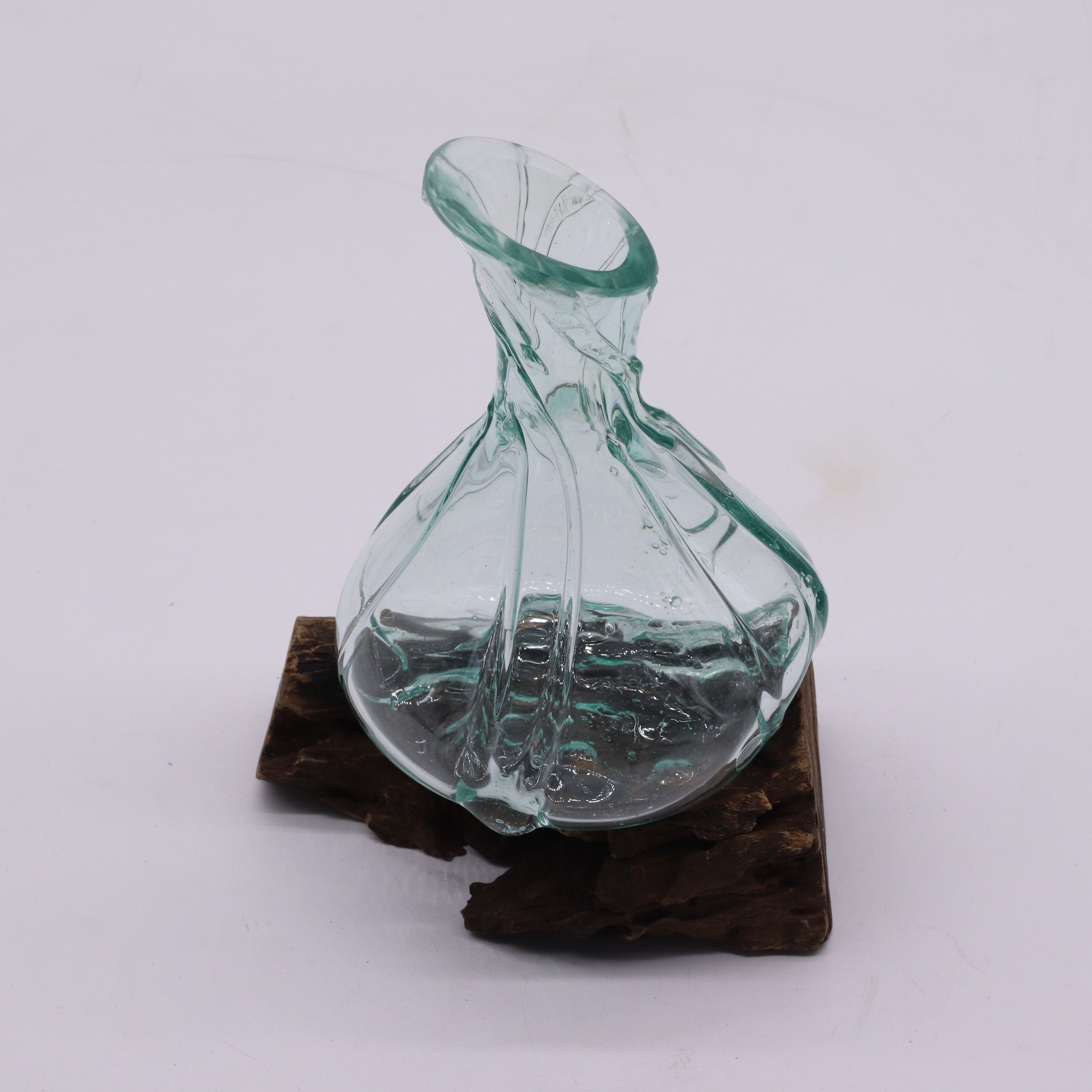 Každá karafa je ručne vyfúkaná z recyklovaného skla a elegantne spočíva na prírodnom drevenom podstavci, ktorý je tvarovaný počas chladenia skla tak, aby dokonale zapadol. Jej elegantná silueta a organická textúra ju robia ideálnou ako funkčnú karafu na víno či vodu, alebo ako dekoratívny dizajnový prvok.