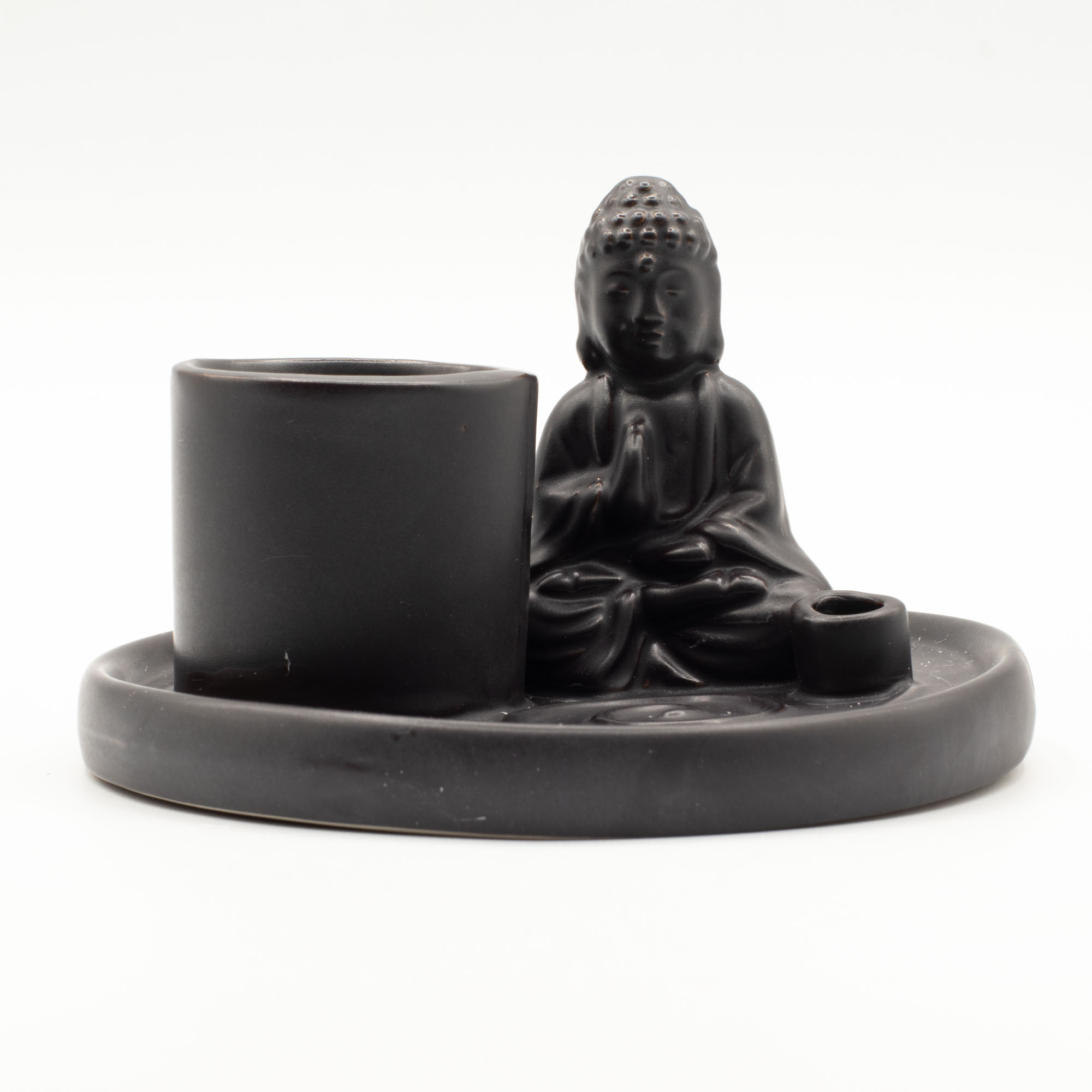 Dizajn zobrazuje pokojnú sediacu postavu Budhu umiestnenú na kruhovom tanieriku s integrovanými držiakmi na vonné tyčinky a kužele. Matná čierna keramika pôsobí súčasne a necháva vyniknúť samotnú formu a symboliku. Stojan je praktický na každodenné používanie, pomáha udržať popol úhľadne zachytený a zároveň funguje ako decentný dekoratívny prvok.