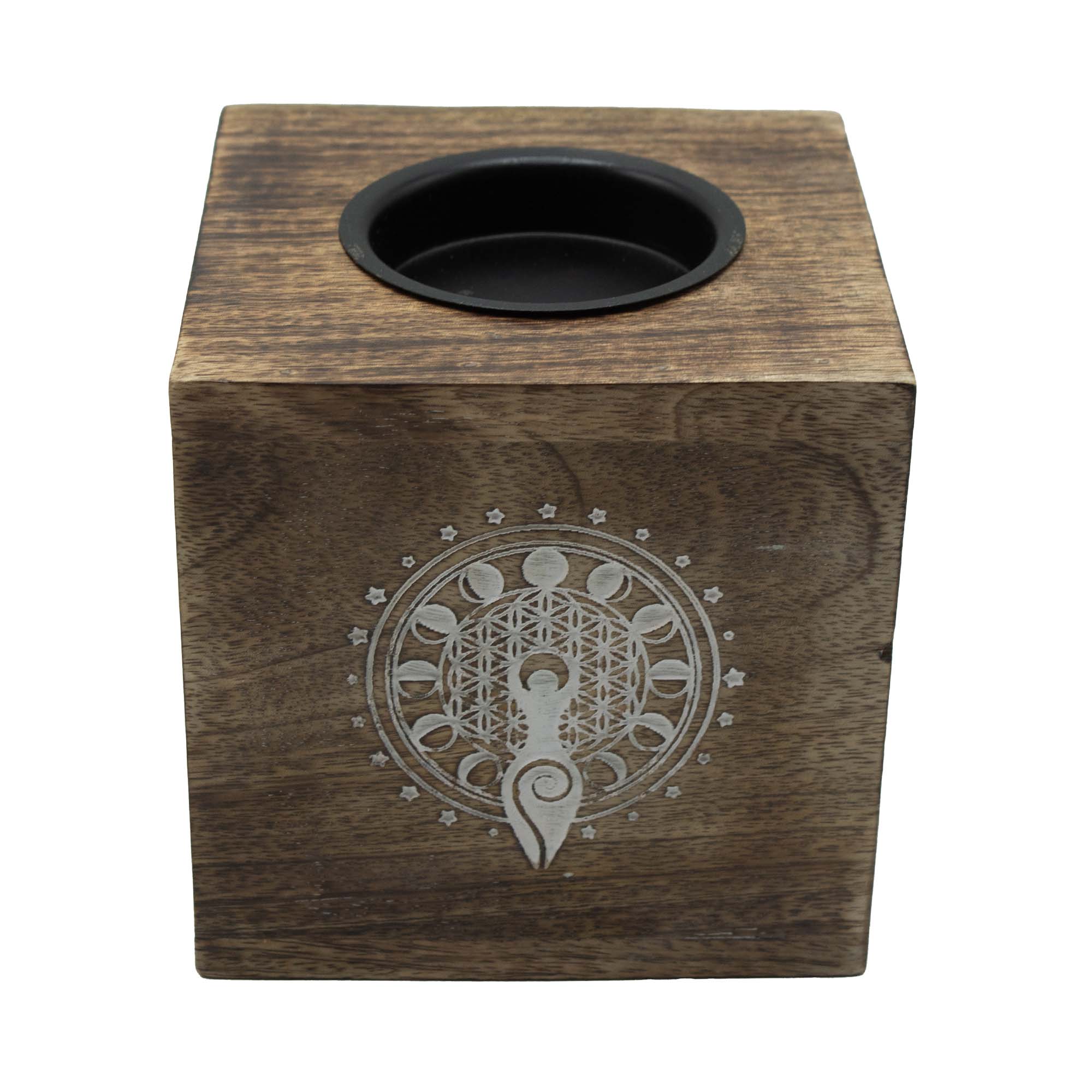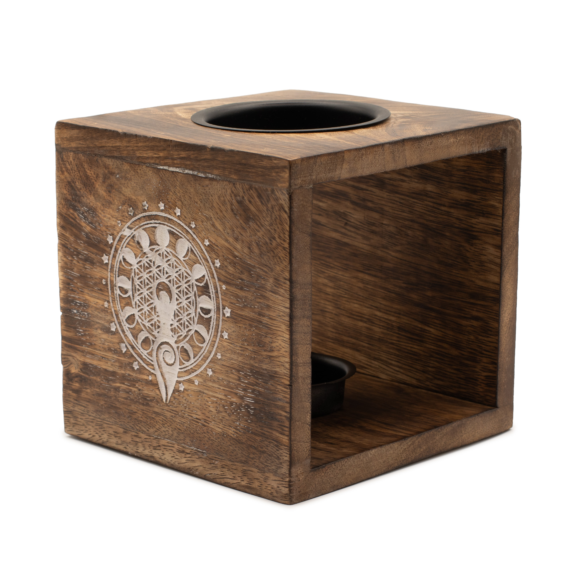Táto Veľká Štvorcov Aroma Lampa z Mangového Dreva - Bohyňa Mesiaca je zdobená motívom Mesačnej bohyne, ktorý sa často spája s intuíciou, cyklami a ženskou energiou. Je vyrobený z mangového dreva a má teplú, prirodzenú povrchovú úpravu, ktorá zjemňuje gravírovaný dizajn a dodáva každému kusu jedinečný charakter.