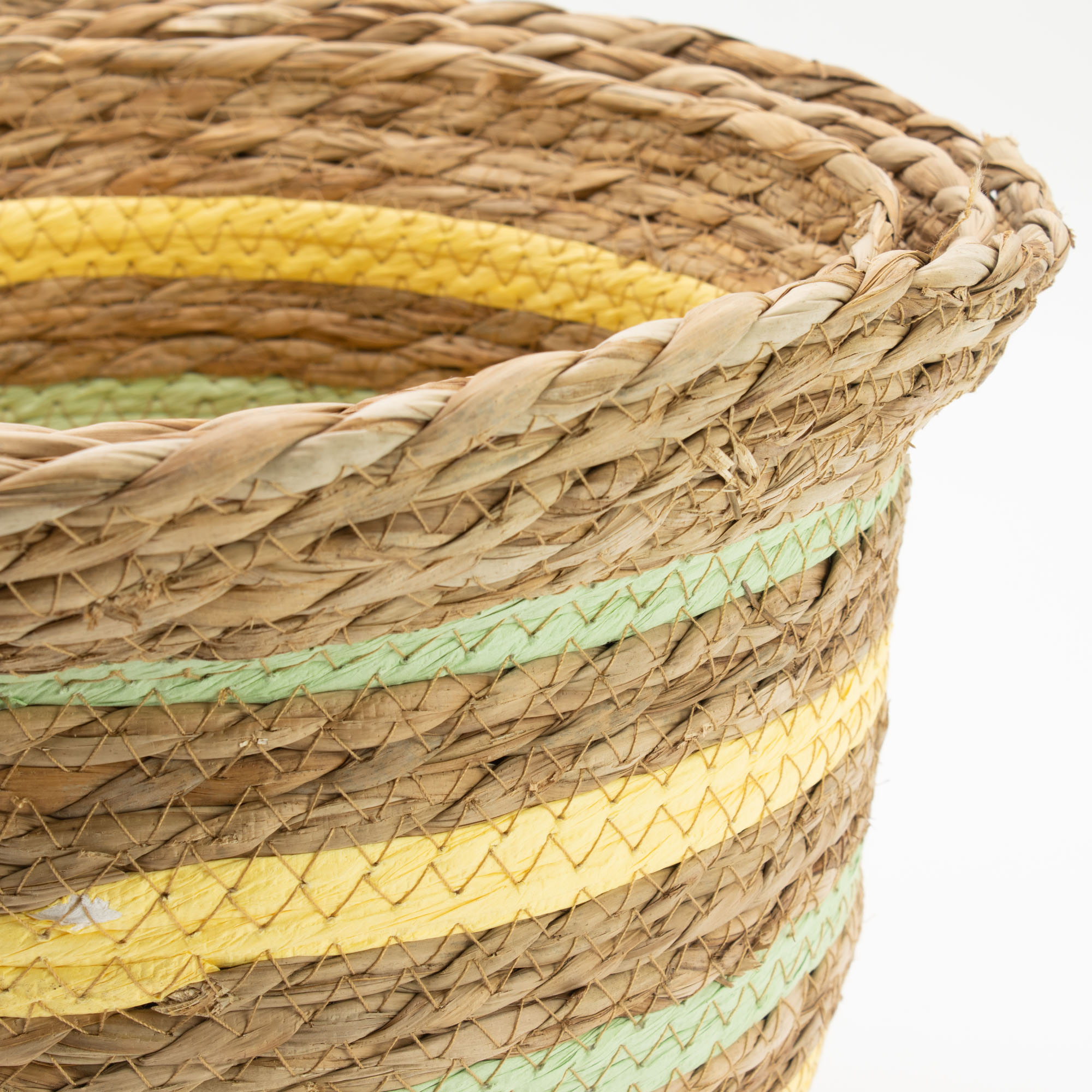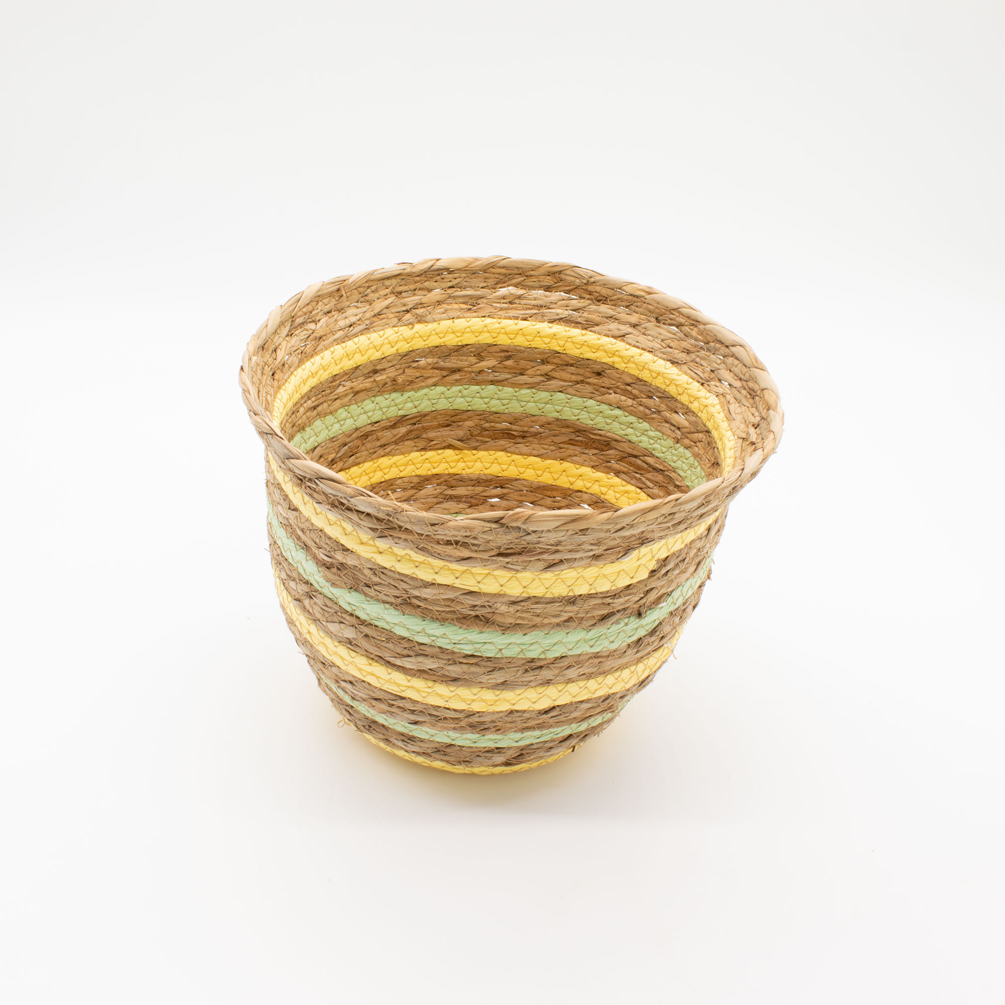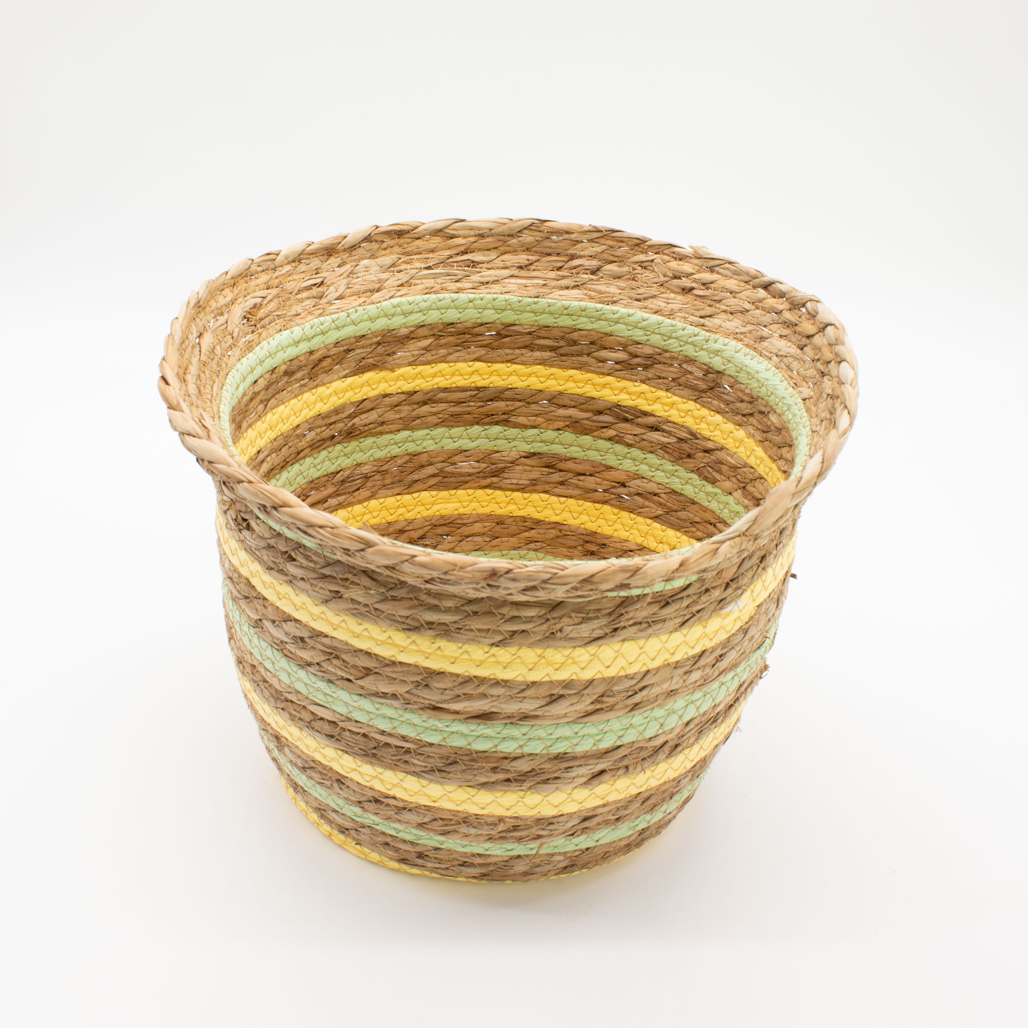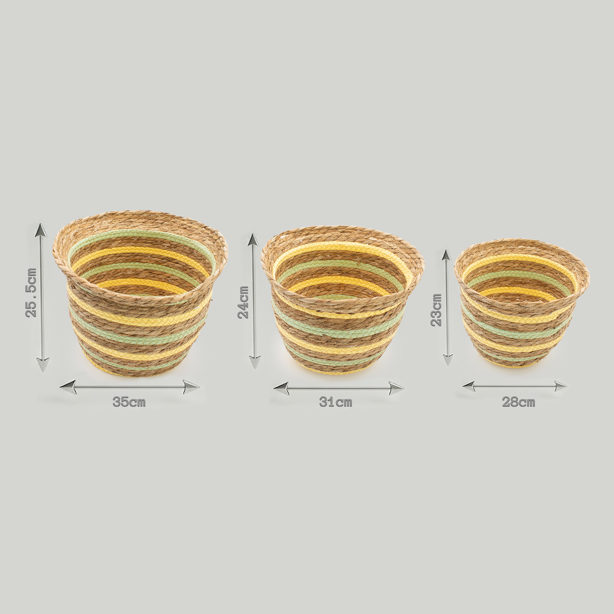 Košíky v tvare vázy z morskej trávy a slamy – prírodná žltá a zelená sú vyrobené z pevne tkaných vlákien morskej trávy a slamy pomocou tradičnej techniky špirálového splietania, ktorá zabezpečuje pevnú, no zároveň ľahkú konštrukciu. Jemne zaoblený siluetový tvar vázy dopĺňajú decentné pruhy v žltej a zelenej farbe, ktoré košom dodávajú teplý, prírodný charakter a zároveň ich robia univerzálnymi na uskladnenie rôznych predmetov. Sú ideálne na uloženie textílií, kvetináčov, doplnkov alebo bežných domácich potrieb.