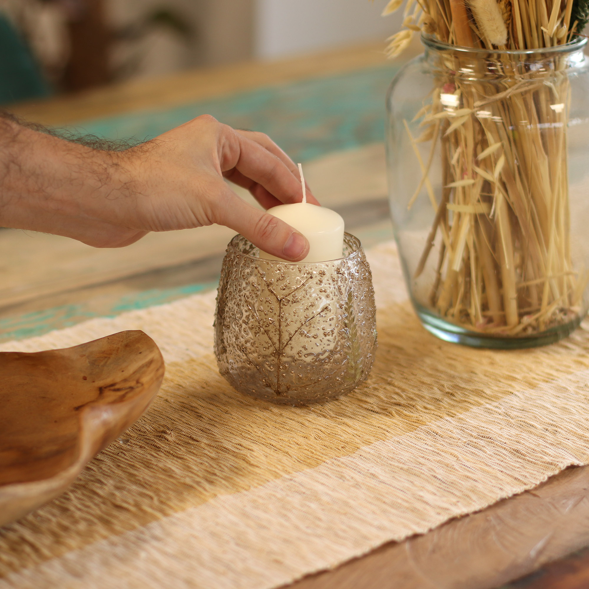 Vhodný pre čajové alebo malé valcové sviečky — dodáva jemnú, upokojujúcu žiaru, ideálnu pre predajne bytových doplnkov, wellness priestory, kvetinárstva či darčekové butiky, ktoré hľadajú prírodou inšpirované a udržateľné dekorácie. Jeho vyšší tvar dobre funguje v štýlových aranžmánoch a sezónnych botanických témach.