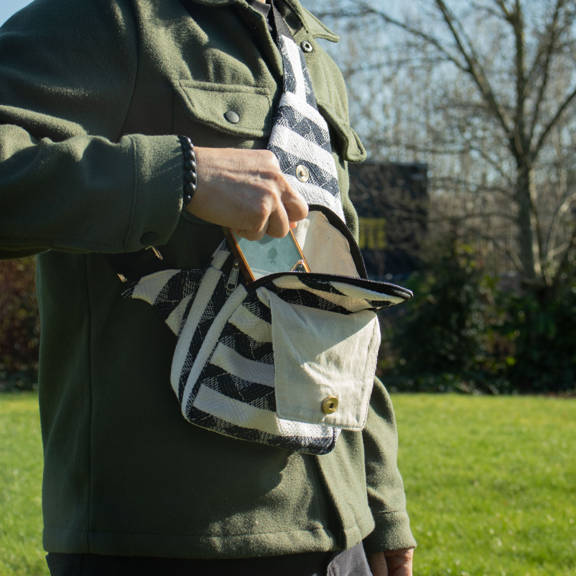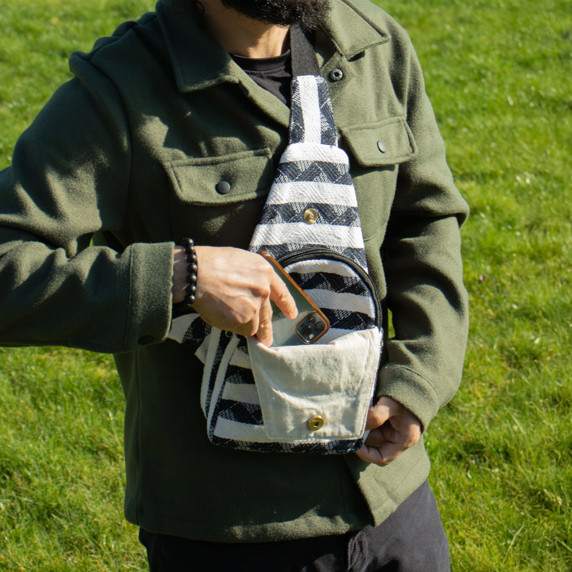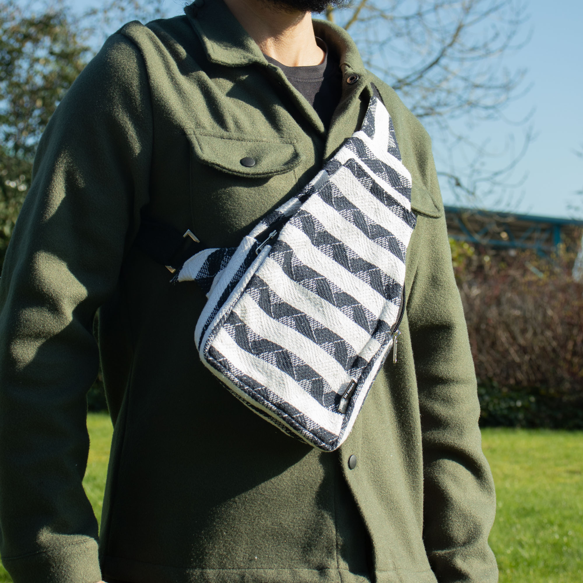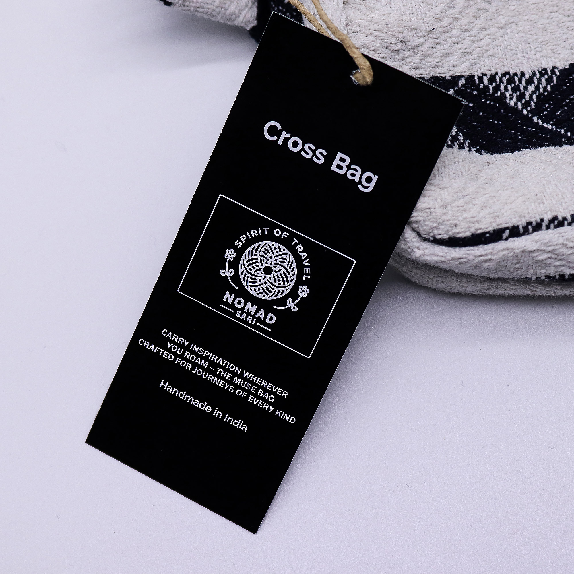 S výrazným čierno-bielym žakárovým vzorom spája Atlas Nomad Crossbody taška každodennú praktickosť s remeselným šarmom. Jej kompaktný, kvapkovitý tvar sa pohodlne nosí cez telo, vďaka čomu je ideálna na cestovanie bez použitia rúk, festivaly či bežné denné vybavovanie.