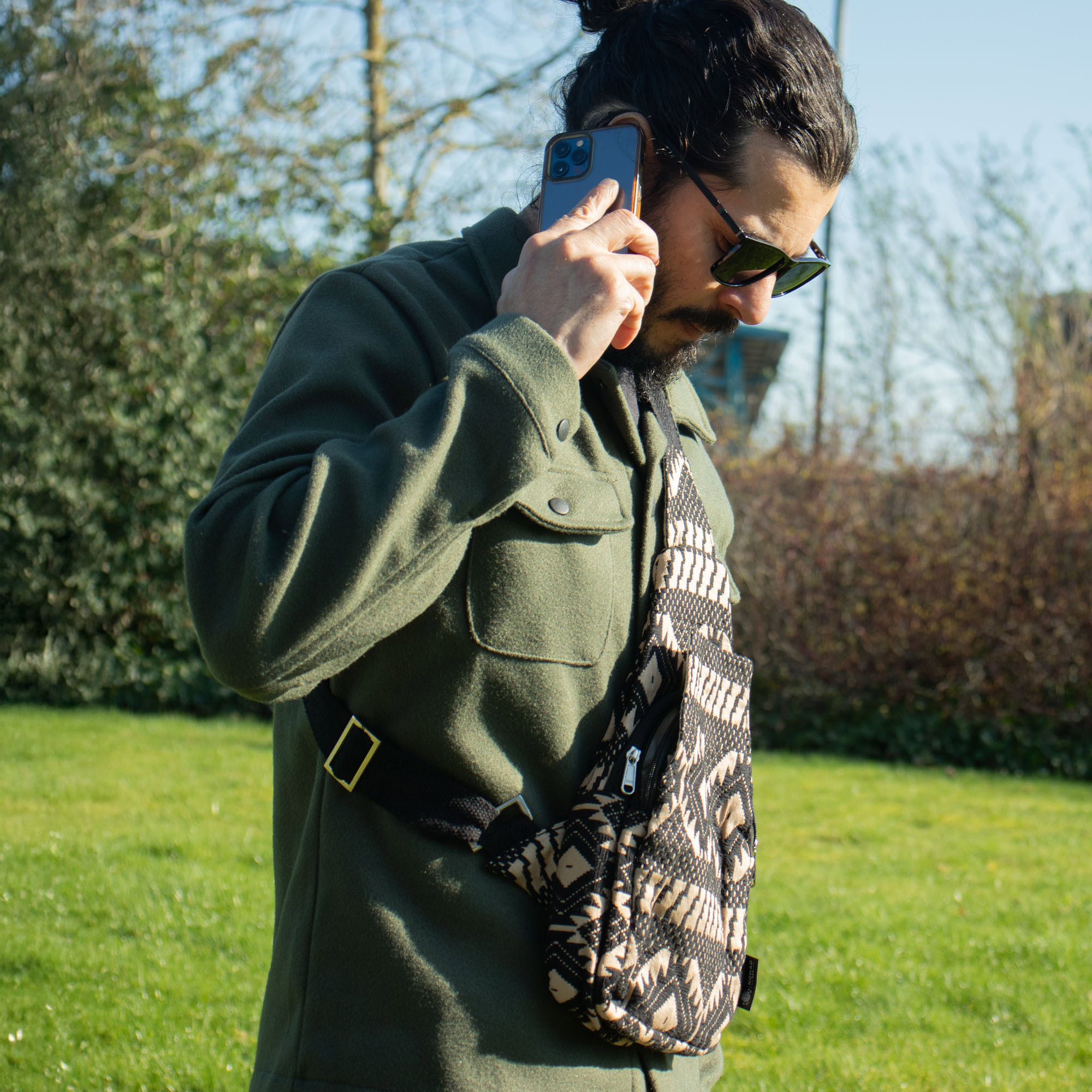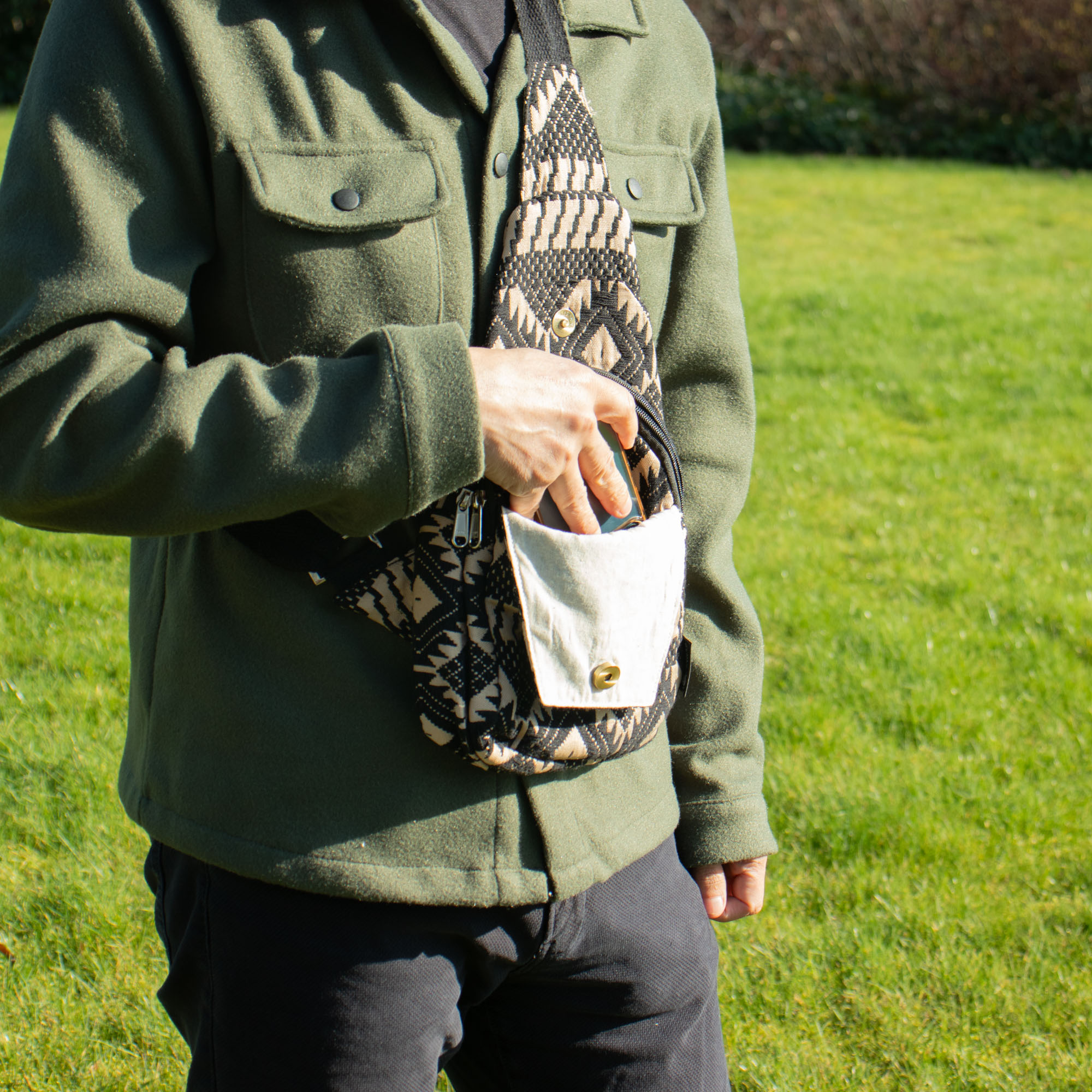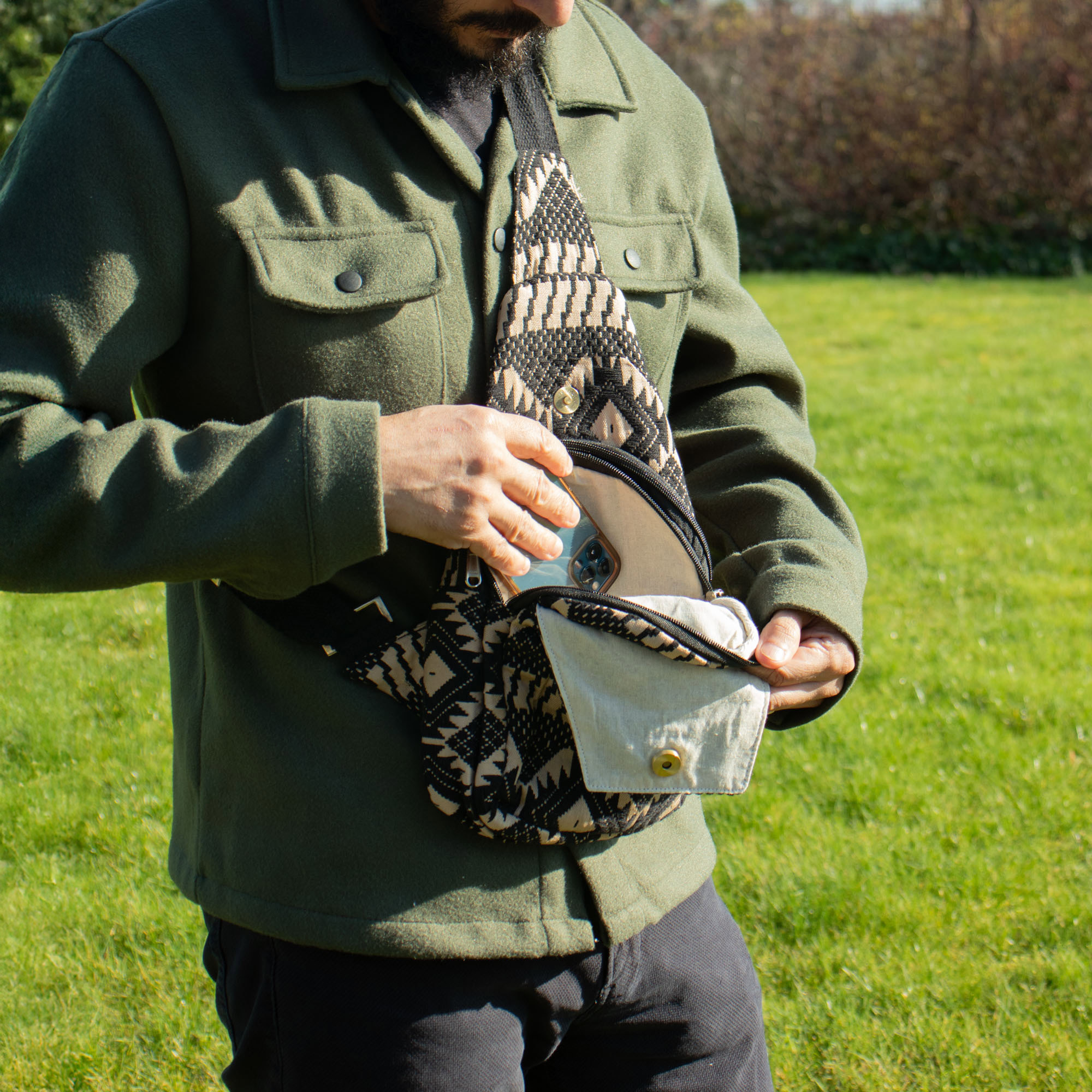 Inšpirovaná kmeňovými motívmi a zemitými tónmi, Púštny Tkáčsky Vzor - Crossbody Taška dodáva každému outfitu nádych túlavého ducha. Výrazná žakárová väzba v čiernych a pieskových odtieňoch jej prepožičiava jedinečný geometrický vzhľad, ideálny pre milovníkov remeselných textúr s moderným akcentom.