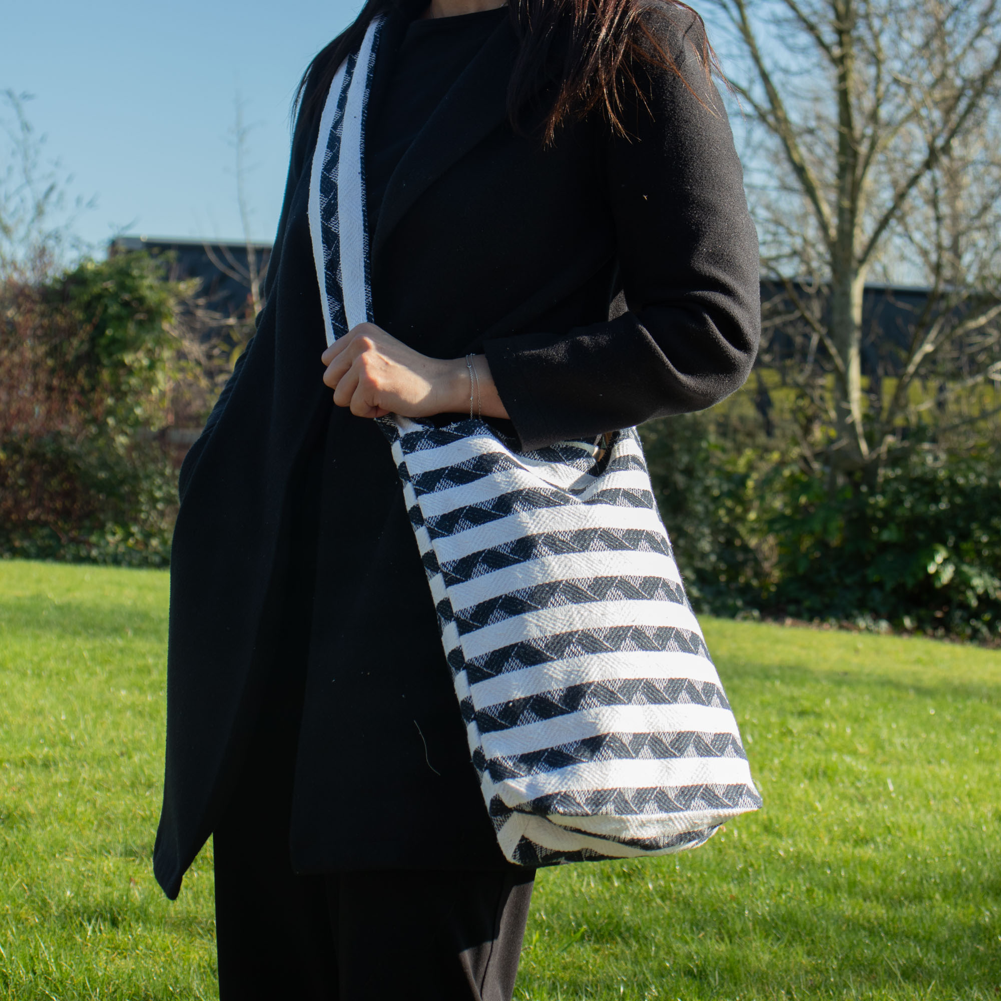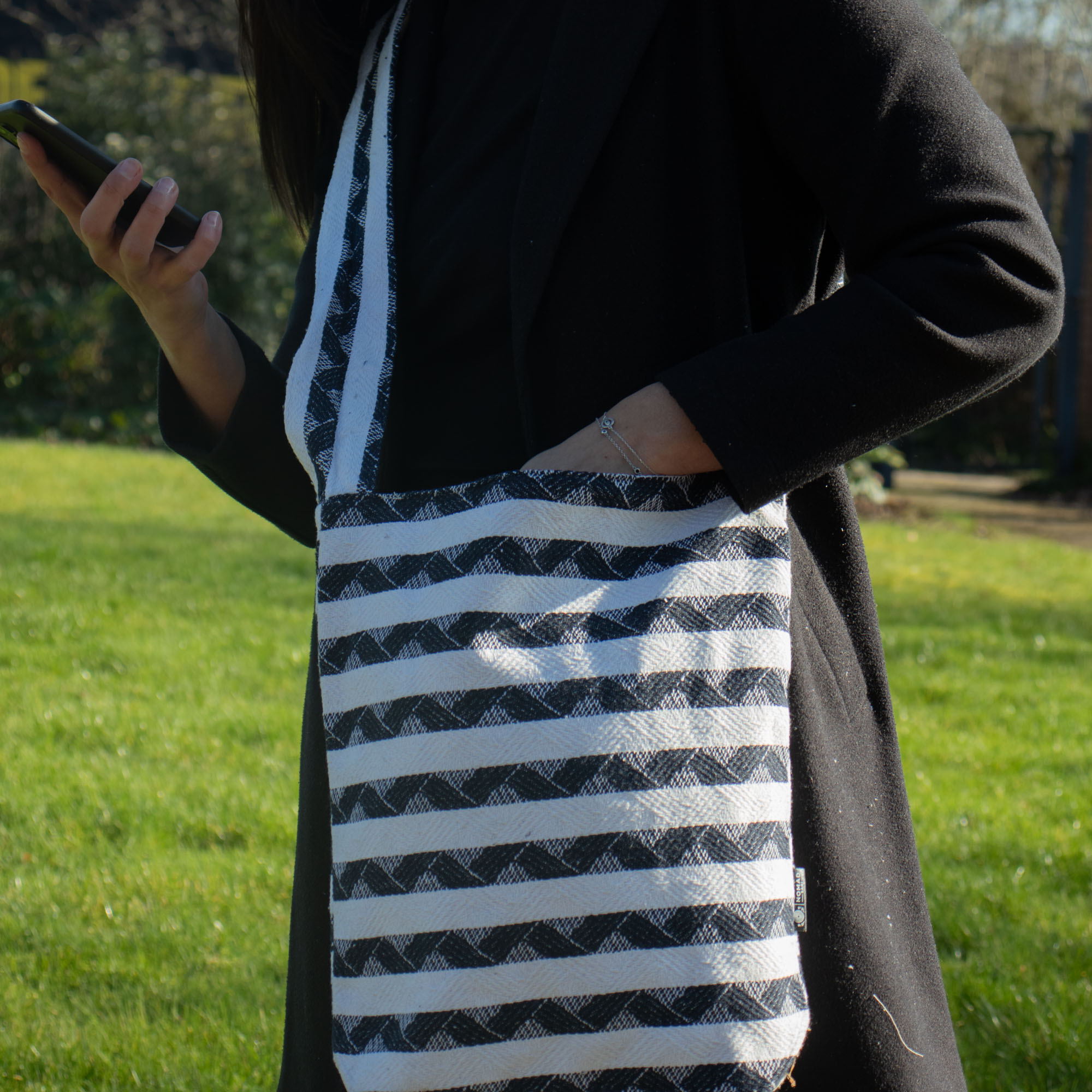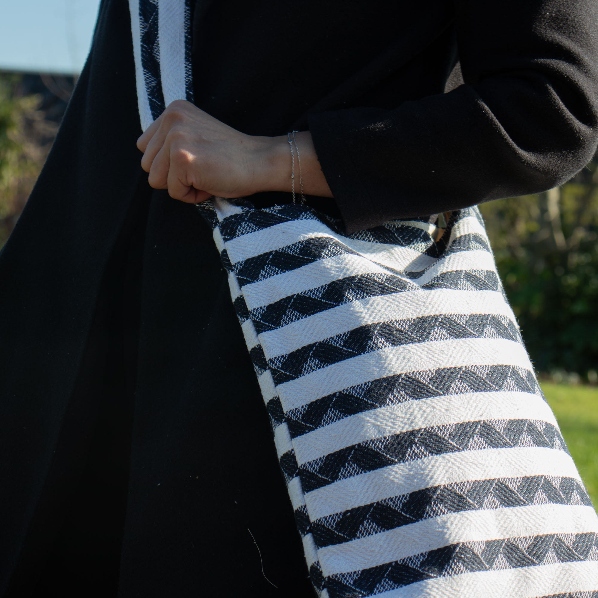 Jednoduchá, priestranná a prirodzene štýlová – Atlas Nomad priestranná taška je ideálnym spoločníkom na každý deň. Klasický čierno-biely žakárový pruhovaný vzor osloví tých, ktorí oceňujú funkčný dizajn s remeselným dotykom.