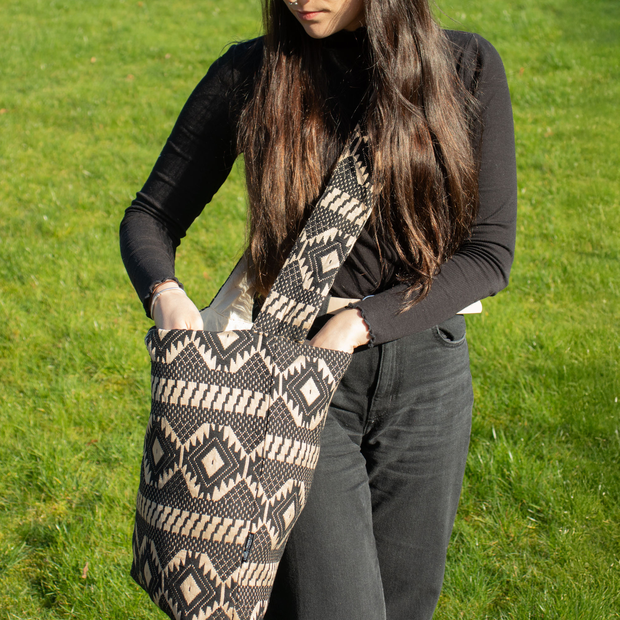 Púštny Tkáčsky Vzor – Nomádska Priestranná Taška spája výrazný dizajn s každodennou funkčnosťou. Nápadný geometrický žakárový vzor v čiernych a pieskových tónoch dodáva každému outfitu autentický remeselný akcent.