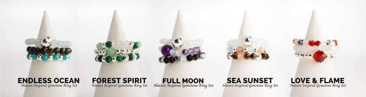 Kolekcia Nymfa Sada Prsteňov predstavuje zladené sety troch elastických prsteňov, vyrobených zo kameňov a striebrene pokovovaných korálok. Sú navrhnuté tak, aby sa dali nosiť spolu vo vrstvenom štýle alebo samostatne, pričom každý set ponúka variabilné možnosti nosenia a zároveň si zachováva harmonický, ľahko rozpoznateľný vzhľad celej kolekcie.