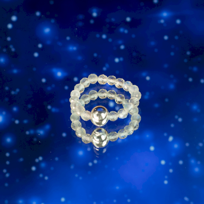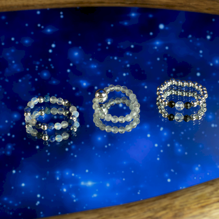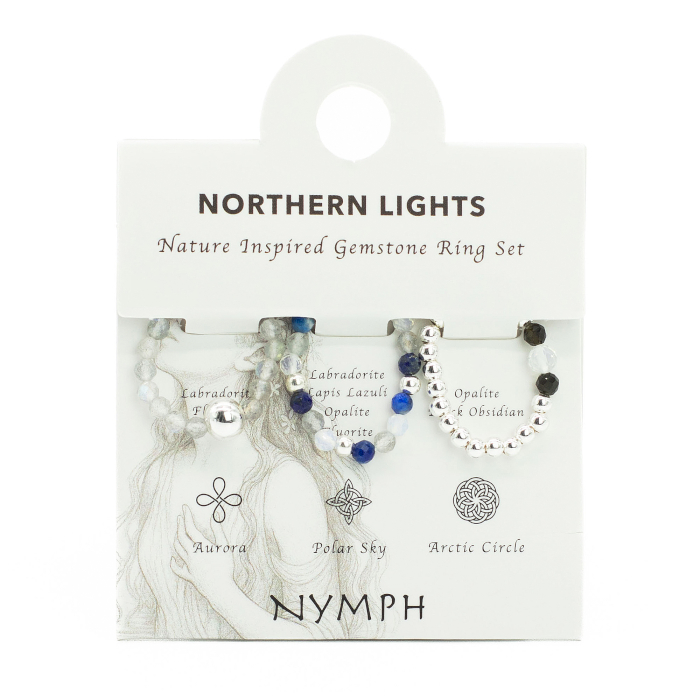 Set prsteňov Polárna Žiara zachytáva pohyb a farby polárnej žiary prostredníctvom výraznej kombinácie lapisu lazuli, labradoritu, opalitu, fluoritu a čierneho obsidiánu. Výsledkom je dynamický set s premenlivými tónmi a výraznou vizuálnou hĺbkou.