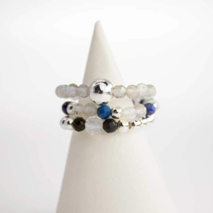 Každý prsteň vyjadruje inú náladu – od hlbokých modrých odtieňov lapisu, cez irizujúci lesk labradoritu a opalitu, až po temnejší kontrast obsidiánu. Pri nosení spolu vytvárajú vrstvený, expresívny vzhľad, ktorý pôsobí hravo, no zároveň premyslene. Samostatne fungujú ako jemné akcenty s vlastným charakterom.