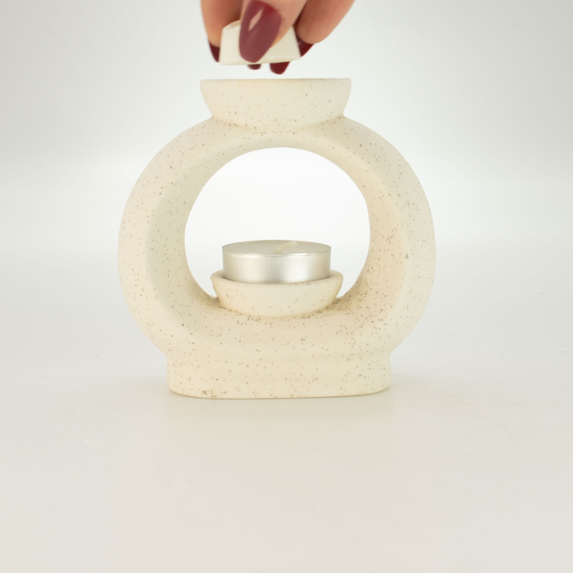 S rozmermi približne 11 × 11,5 × 5 cm ponúka veľkorysý kruhový otvor, cez ktorý krásne presvitá svetlo čajovej sviečky a zároveň jemne zohrieva hornú misku. Stačí pridať vodu a pár kvapiek vonného oleja, zapáliť sviečku a nechať vôňu postupne rozptýliť do priestoru.
