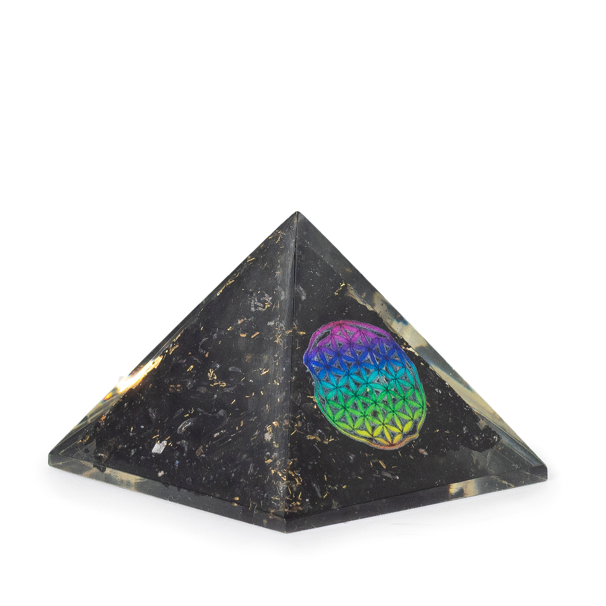 Obohaťte svoj sortiment kryštálov a wellness produktov o významný a vizuálne pôsobivý doplnok – malú orgonitovú pyramídu – Kvet života s úlomkami čierneho turmalínu. Každá pyramída je ručne vyrobená z živice, kovových pilín a pravých drahých kameňov, pričom zobrazuje posvätný symbol Kvet života v kombinácii s úlomkami čierneho turmalínu, známymi svojimi uzemňujúcimi a ochrannými vlastnosťami proti negatívnej energii.