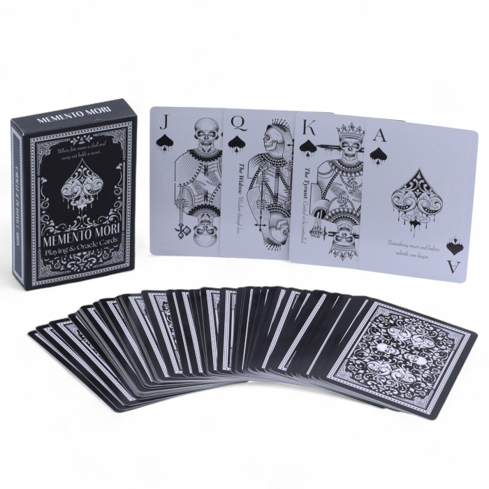 Každý balíček obsahuje 52 štandardných kariet a 2 žolíkov, vytlačených na kvalitnom papieri pre hladké miešanie a dlhú životnosť. Dizajn Memento Mori zdobia detailné motívy lebiek a nadčasové gotické ozdoby – ideálna voľba pre zákazníkov, ktorých priťahuje mystika a symbolika osudu.